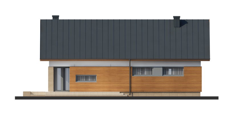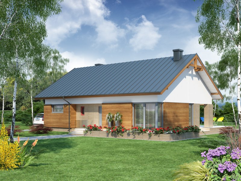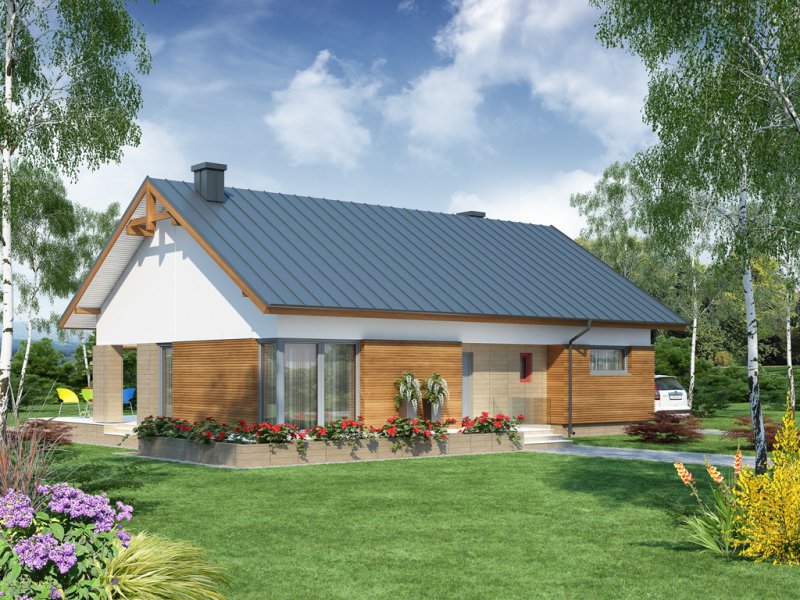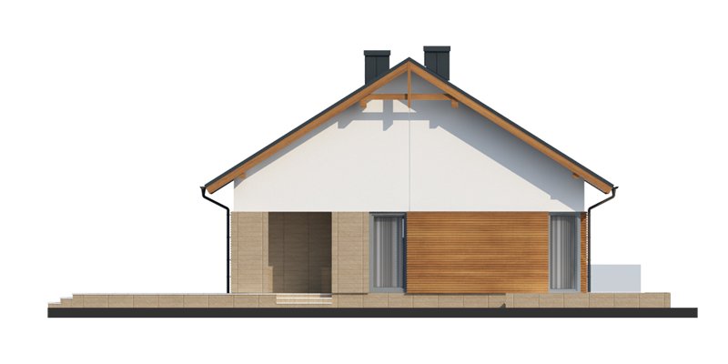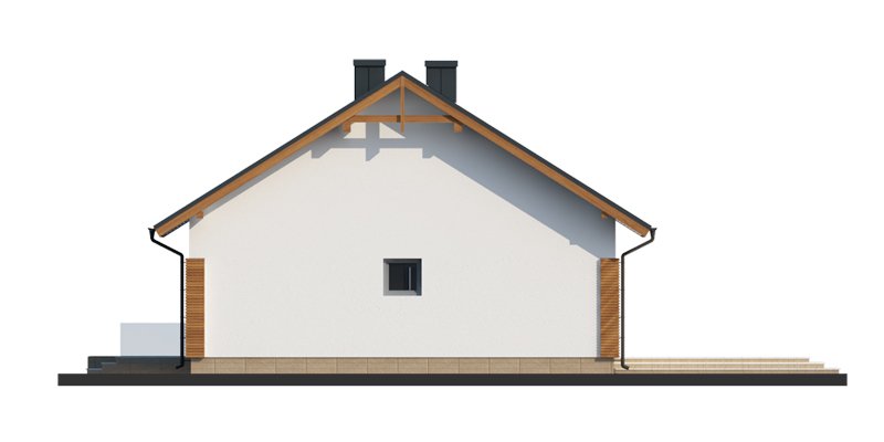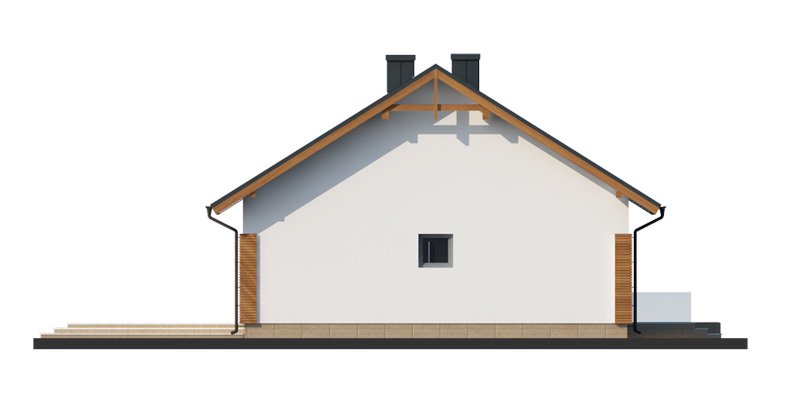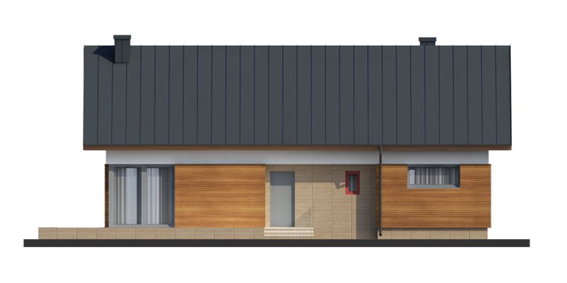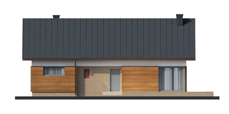 Duris 3 jest domem świetnie wpisującym się w szeroką i krótką działkę. Jest stworzony dla rodziny 4-osobowej z upodobaniem do rozwiązań prostych i nowoczesnych. Dom generalnie dzieli się na 2 części – dzienną oraz nocną. Ta pierwsza to salon z jadalnią i otwarta na nie kuchnia ze spiżarnią. Zwolennicy kuchni zamkniętych mają możliwość rozdzielenia kuchni od dwóch pozostałych pomieszczeń. Salon posiada kominek komfortowo usytuowany w niedużej odległości zarówno od jadalni jak i strefy wypoczynkowej salonu. W tej części zaprojektowano doskonale doświetlające wnętrze duże przeszklenia, umożliwiające wyjście na taras zarówno od strony frontowej, jak i na ten zadaszony od strony ogrodu. Druga część budynku to strefa nocna. Składa się z trzech sypialni oraz łazienki. Rezygnując ze spiżarni i garderoby dostępnej z dwuosobowej sypialni, możemy ją znacznie powiększyć. W skrajnej części domu zlokalizowano pomieszczenie gospodarcze. Istnieje możliwość zaadaptowania poddasza na dodatkowe pomieszczenia użytkowe , dzięki umieszczeniu schodów w miejscu pomieszczenia WC.