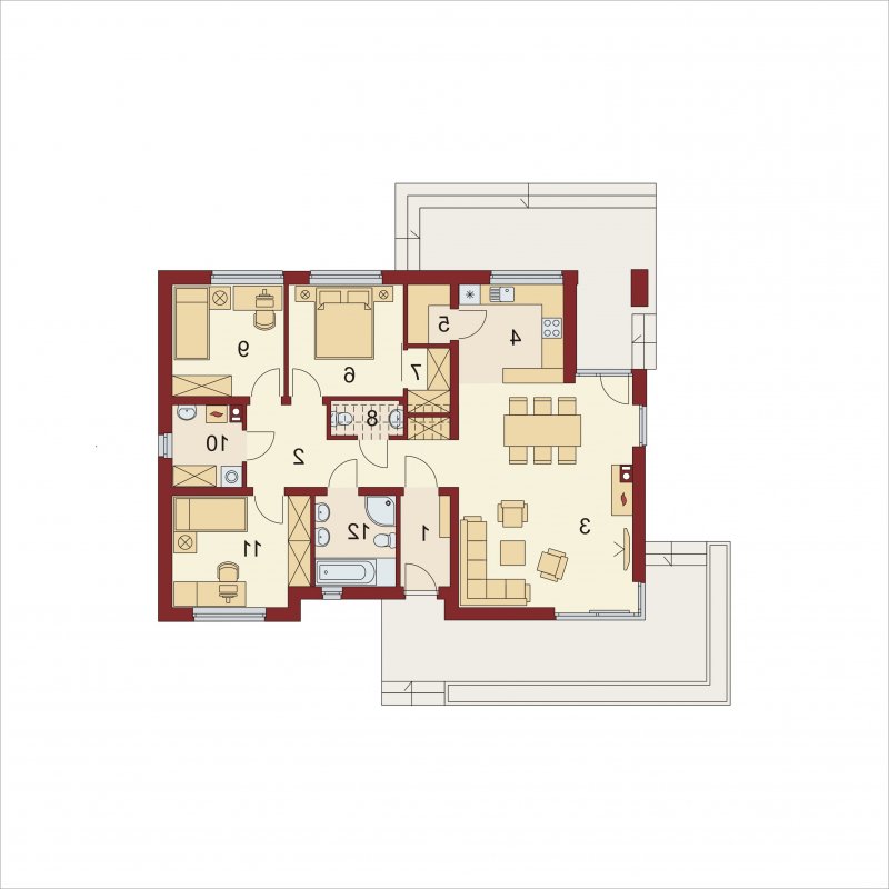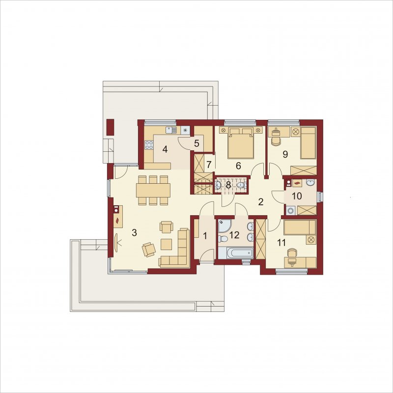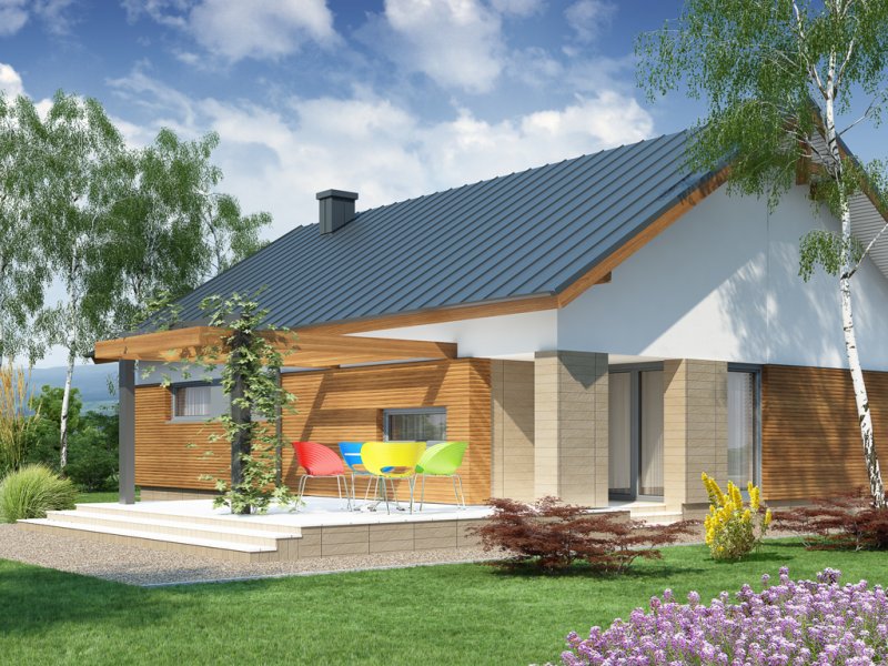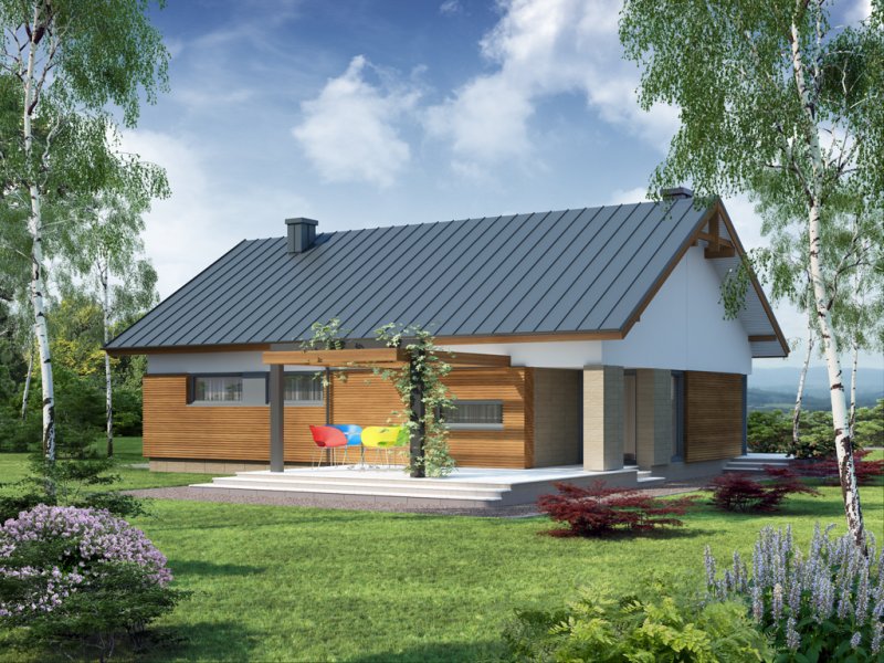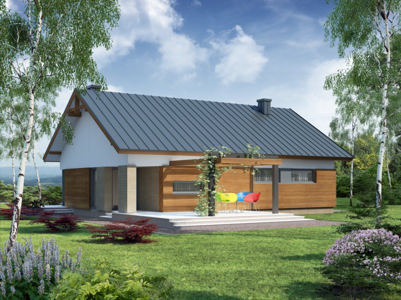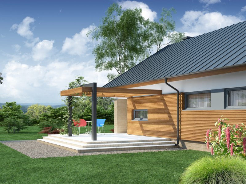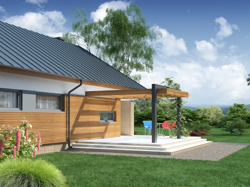Wizualizacja jest propozycją tego jak dany projekt domu oraz jego otoczenie można zaaranżować. Sposób prowadzenia tarasu, kształt murków i elementy małej architektury typu pergole, donice itp. nie są objęte zakresem projektu. W związku z powyższym na projekcie budowlanym elementy te mogą nie być uwzględnione w projekcie ( patrz pergole ) lub zmieniony może być ich kształt i sposób prowadzenia ( wielkości tarasów, profil murków ).