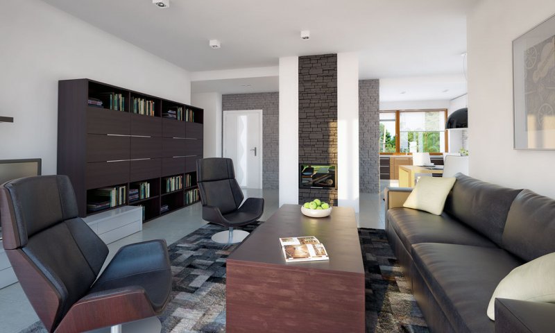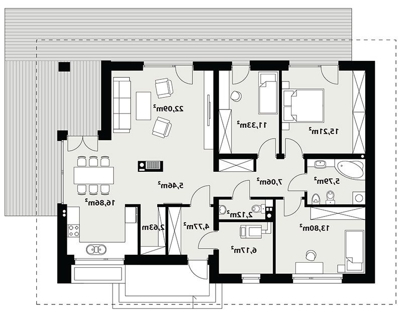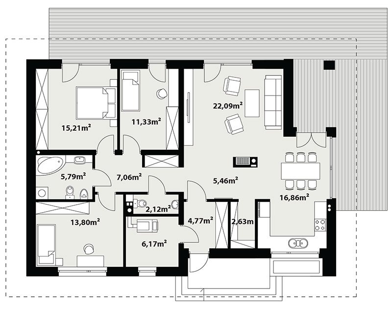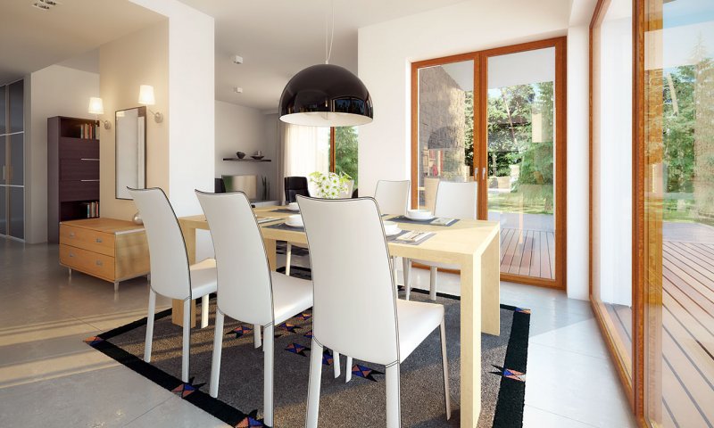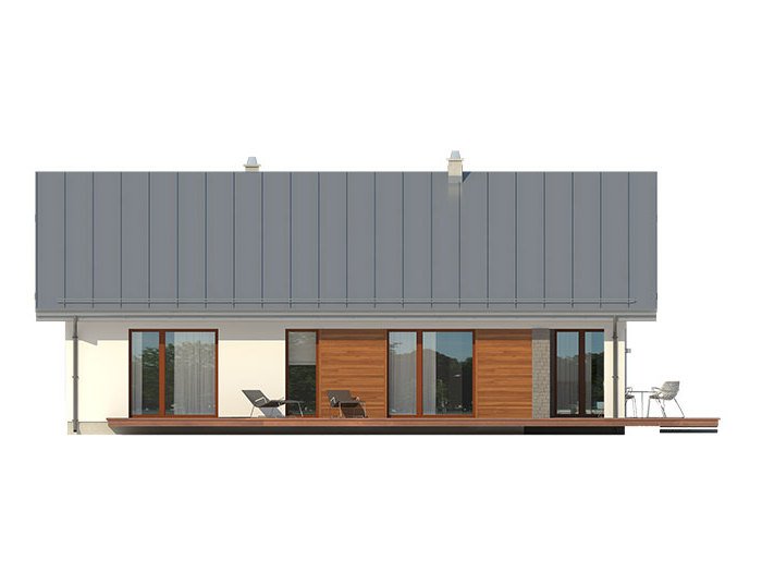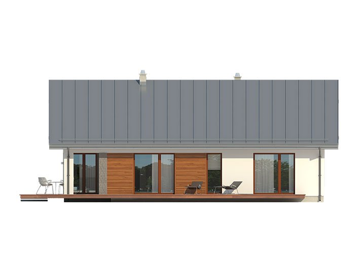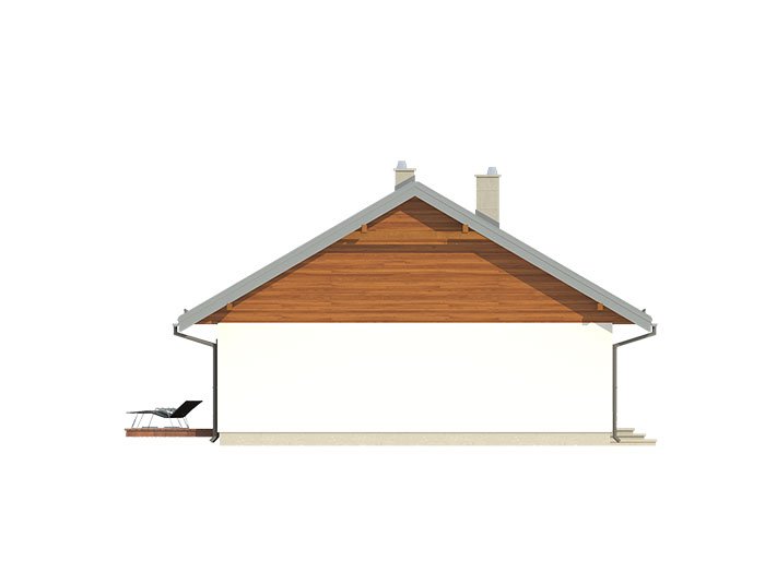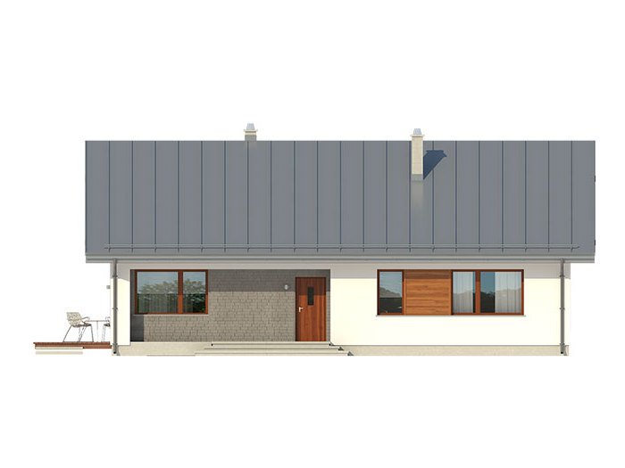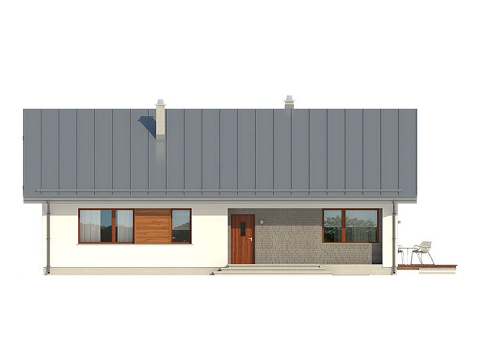 Parterowy dom jednorodzinny, łączący nowoczesny charakter elewacji z prostym, klasycznym układem pomieszczeń. Jest to bardzo wygodny , prosty i funkcjonalny dom, który swoim pełnym programem zapewnia optymalny komfort 4-osobowej rodzinie. Przestronna część dzienna to duży salon, jadalnia otwierająca się na ogród poprzez ogromne przeszklenie, kuchnia ze spiżarnią oraz wc. Atutem projektu jest zadaszony taras. Tak zaproponowany, ciekawy i przestronny układ pomieszczeń umożliwia szereg aranżacji. Część nocna to 3 wygodne sypialnie, z czego dwie posiadają wyjście na taras oraz przestronna łazienka. W domu zaprojektowano dużą kotłownię dostępną z wiatrołapu, której parametry pozwalają na montaż kotła na każdy rodzaj paliwa, w tym na paliwo stałe. Ten optymalny i ciekawy program funkcjonalny został ujęty w prostej bryle na rzucie prostokąta, przykrytej dwuspadowym dachem. Atutem projektu jest jego prostota zarówno w układzie pomieszczeń jak i w rozwiązaniach elewacji, gdzie elegancki, nowoczesny styl osiągnięto poprzez klasyczne, proste ale szlachetne materiały oraz delikatny, subtelny detal.