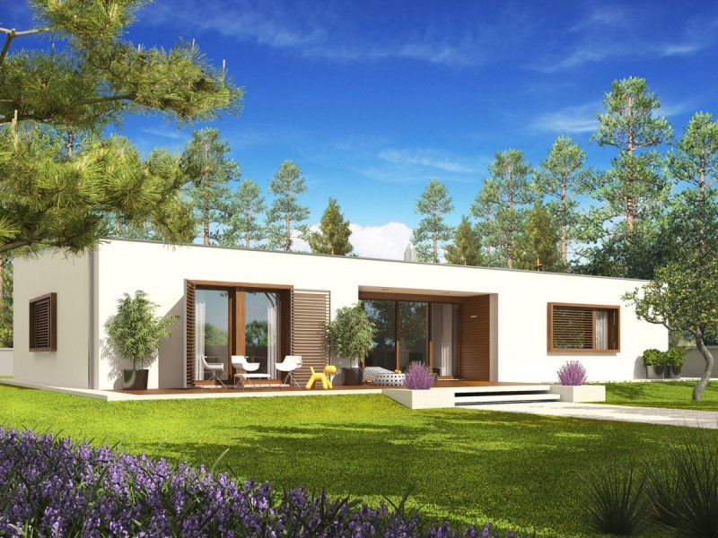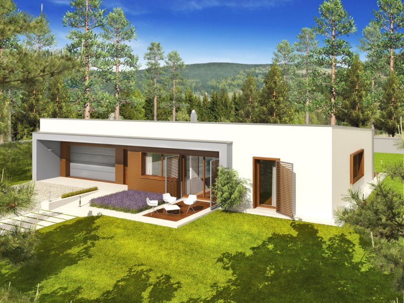 Dom parterowy, niepodpiwniczony z garażem dwustanowiskowym. Przeznaczony dla 3-4-osobowej rodziny. W strefie dziennej zaplanowano salon, wygodną jadalnię oraz kuchnię ze spiżarnią. Strefę nocną tworzą trzy wygodne sypialnie wraz z łazienka i toaletą. W części technicznej znajduje się obszerne pomieszczenie gospodarcze. Budynek zaprojektowano jako wysoko energooszczędny, wyposażony w wentylację mechaniczną z rekuperacją. W projekcie przewidziano również gruntową pompę ciepła oraz system solarny. EX 8 to dom, zaprojektowany z myślą o miłośnikach nowoczesnego designu. Modernistyczna bryła budynku ubrana w surową biel tynku tworzy elegancką kompozycję, która z sukcesem wpisze się w każdy krajobraz. Atutem domu jest jego słoneczny charakter – duże przeszklenia zapraszają do wnętrz naturalne światło, które opromienia przestrzeń swoim ciepłym blaskiem. EX 8 to przykład architektury w służbie energooszczędności – na dachu dumnie połyskują kolektory słoneczne, a wśród instalacji znalazły się m.in. wentylacja mechaniczna nawiewno-wywiewna z odzyskiem ciepła oraz system ogrzewania oparty o pompę ciepła. Istnieje możliwość: - podpiwniczenia