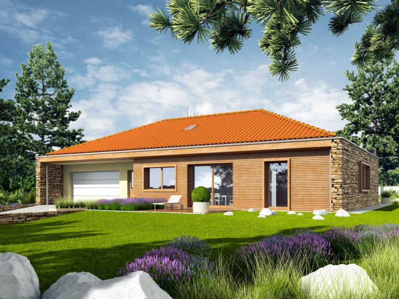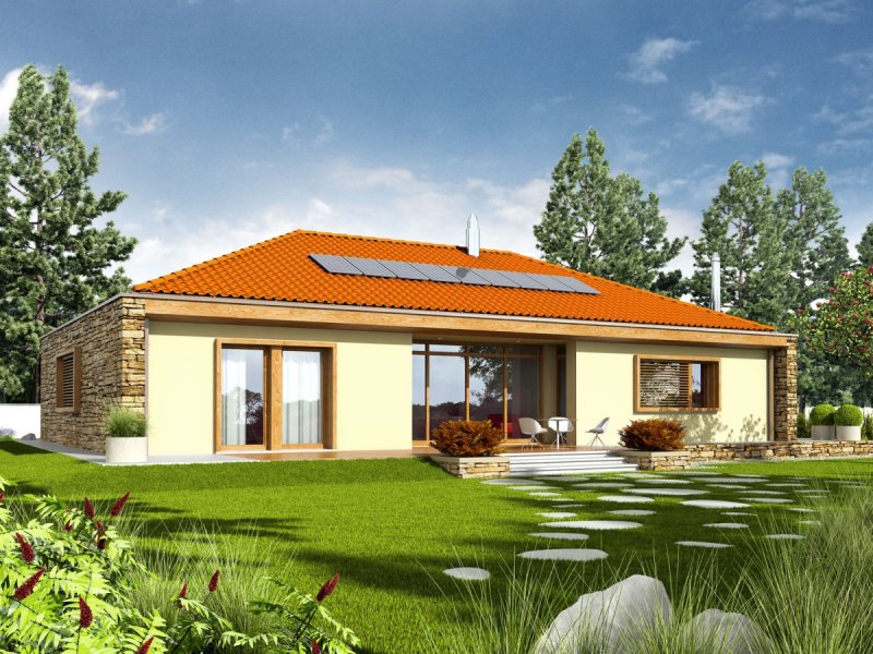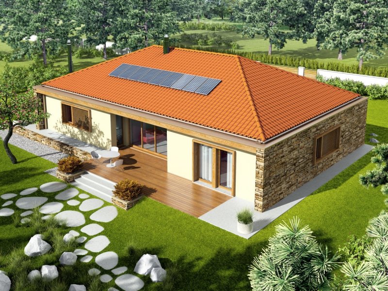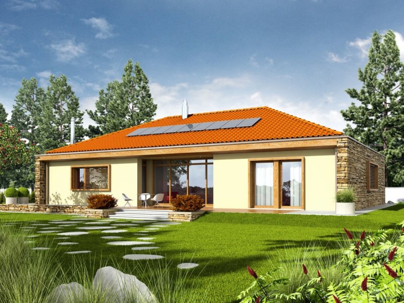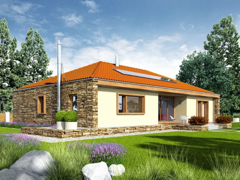 Dom parterowy, niepodpiwniczony z garażem dwustanowiskowym. Przeznaczony dla 4-5-osobowej rodziny. Strefę dzienną tworzy salon, z przestronną jadalnią oraz kuchnia ze spiżarnią. Strefa nocna to trzy wygodne sypialnie wraz z łazienką. W części technicznej znajduje się obszerne pomieszczenie gospodarcze, dostępne również z zewnątrz. Budynek zaprojektowano jako wysoko energooszczędny, wyposażony w wentylację mechaniczną z rekuperacją. W projekcie przewidziano również gruntową pompę ciepła oraz system solarny. EX 8 G2 (wersja D) to dom, obok którego nie można przejść obojętnie. Swój wyjątkowy charakter budynek zawdzięcza intrygującej kompozycji elewacji – atrakcyjny efekt wizualny tworzy udana mikstura wanilii, naturalnego drewna oraz kamienia. Wnętrze domu z reprezentacyjnym salonem spełni oczekiwania miłośników przestrzeni wypełnionych naturalnym światłem i dobrą, zieloną energią ogrodu. Istnieje możliwość: - podpiwniczenia budynku
