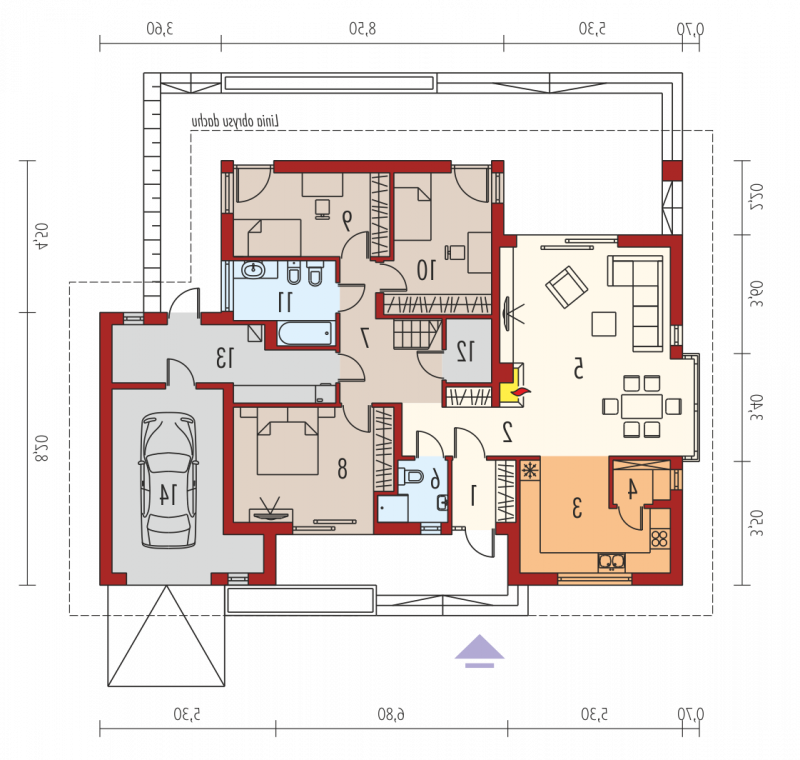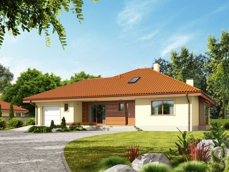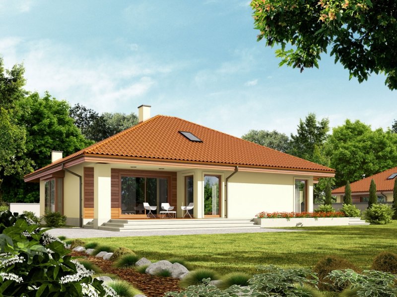 Dom parterowy, niepodpiwniczony, z garażem jednostanowiskowym. Przeznaczony dla 3-4-osobowej rodziny. W strefie dziennej znajdują się salon z kominkiem, jadalnia oraz kuchnia ze spiżarnią. Zaplanowano tu również małą łazienkę oraz kotłownię (pomieszczenie gospodarcze). Strefę nocną tworzą trzy sypialnie oraz wygodna łazienka. W holu zaprojektowano schody prowadzące na strych. Flori III G1 ECONOMIC (wersja B) imponuje swoim perfekcyjnie rozplanowanym układem funkcjonalnym. Wyraźne rozdzielenie stref – dziennej i nocnej sprawia, że domownicy mogą cieszyć się najwyższym komfortem użytkowym. Dzięki dużej ilości okien wnętrze wyróżnia jasny, przytulny charakter. Na szczególną uwagę zasługuje również atrakcyjny wygląd zewnętrzny – zwarta bryła budynku została ubrana w subtelną kompozycję elewacji – ascetyczna biel tynku w parze w naturalnym odcieniem drewna nadają całości elegancki wygląd. Kolekcja ECONOMIC - domy ładne i tanie w budowie Kolekcja ECONOMIC została zaprojektowana z troską o ekonomiczny charakter budowy. Prosta bryła, ograniczona ilość detali architektonicznych oraz zminimalizowana liczba pionów instalacyjnych sprawia, że domy z Kolekcji ECONOMIC są tanie w realizacji i późniejszej eksploatacji. Atuty Kolekcji ECONOMIC • Prosta konstrukcja domu – niskie koszty budowy • Standardowe wymiary stolarki okiennej – najtańsze rozwiązania profili okiennych • Brak okrągłych okien, rozbudowanych przeszkleń i rolet • Nowoczesna interpretacja klasycznej bryły domu • Optymalny układ funkcjonalny • Idealne proporcje budynku – atrakcyjny efekt estetyczny • Czysta forma bez zbędnych detali Istnieje możliwość: - podpiwniczenia budynku - zmiany kąta nachylenia dachu do 30°