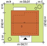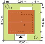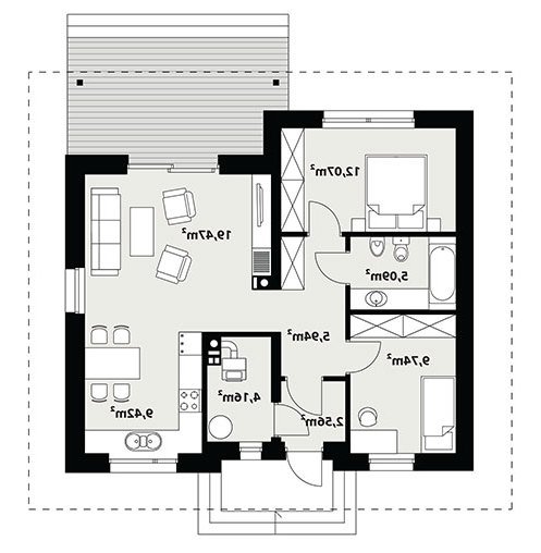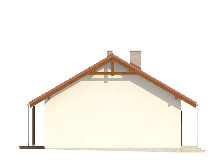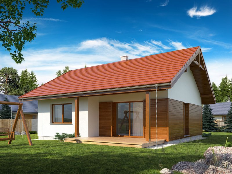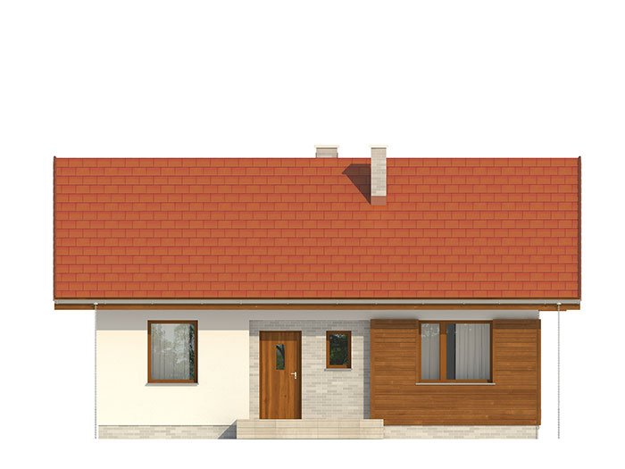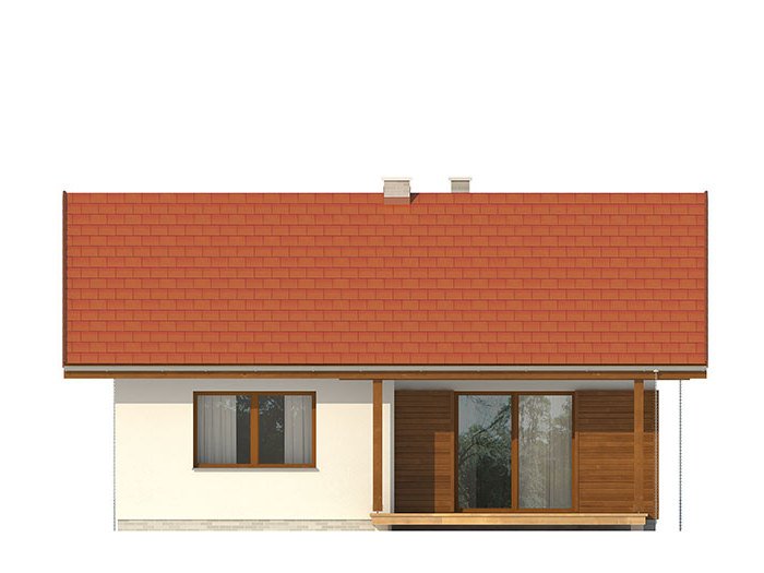 Nieduży jednorodzinny budynek mieszkalny, parterowy, niepodpiwniczony. Ergonomiczny i optymalny układ pomieszczeń zapewnia komfort 3-osobowej rodzinie. Funkcjonalnie rozplanowana przestrzeń została wyraźnie podzielona na część dzienną i nocną. Część reprezentacyjna domu, to przestronny salon połączony z jadalnią, który otwiera się na duży zadaszony taras oraz kuchnia. Oprócz części dziennej, zaprojektowano dwie sypialnie i dużą łazienkę, które stanowią część intymną domu, oraz dużą kotłownię w części gospodarczej. Wymiary kotłowni umożliwiają montaż kotła na każdy rodzaj paliwa. Sama bryła budynku nawiązuje do archetypu domu jednorodzinnego. Rzut budynku powstał w oparciu o rzut prostokąta, zaś sam dom został przykryty dachem dwuspadowym. Dom tym samym jest tani i prosty w budowie oraz niedrogi w utrzymaniu i eksploatacji.