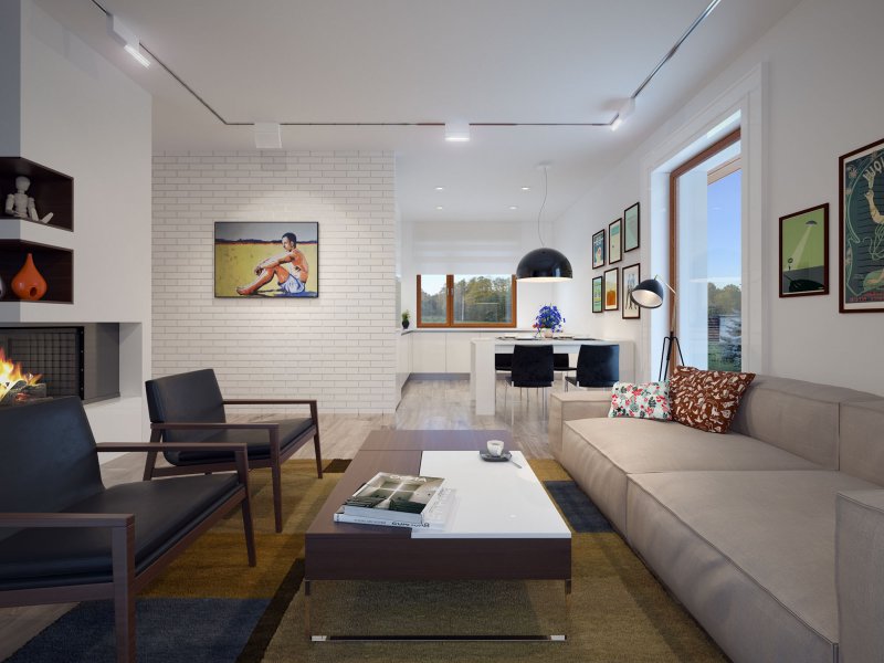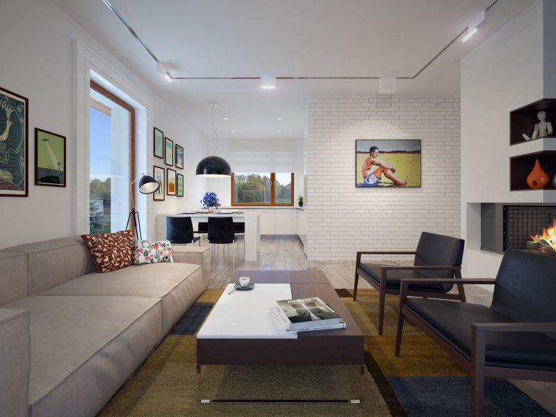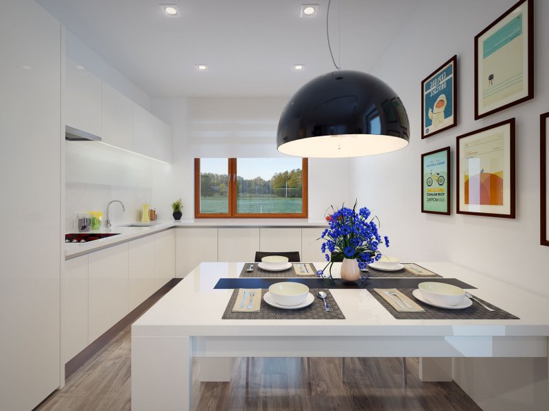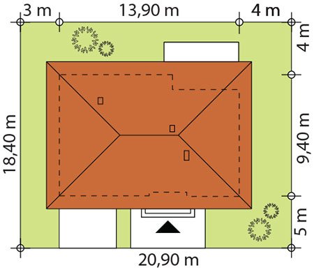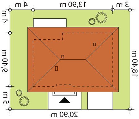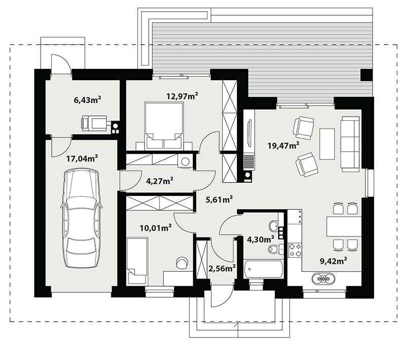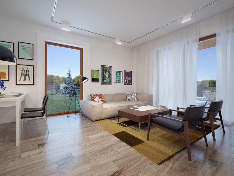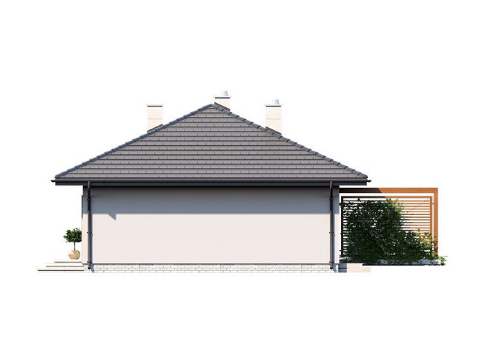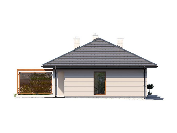 Nieduży jednorodzinny budynek mieszkalny, parterowy, niepodpiwniczony z jednostanowiskowym garażem. Funkcjonany układ pomieszczeń zapewnia komfort 3-osobowej rodzinie. Ergonomicznie i optymalnie rozplanowana przestrzeń została wyraźnie podzielona na część dzienną, nocną i gospodarczą. Część reprezentacyjna domu, to przestronny salon połączony z jadalnią, który otwiera się na duży, zadaszony taras oraz kuchnia. Oprócz części dziennej, zaprojektowano dwie sypialnie i dużą łazienkę, które stanowią część intymną domu. Duża kotłownia, garaż oraz pomieszczenie gospodarcze mogące pełnić funkcje spiżarni i pralni przewidziano w części gospodarczej domu. Wymiary kotłowni umożliwiają montaż kotła na każdy rodzaj paliwa. Rzut budynku powstał w oparciu o rzut prostokąta, zaś sam dom został przykryty dachem wielospadowym. Dom tym samym jest tani i prosty w budowie oraz niedrogi w utrzymaniu i eksploatacji.