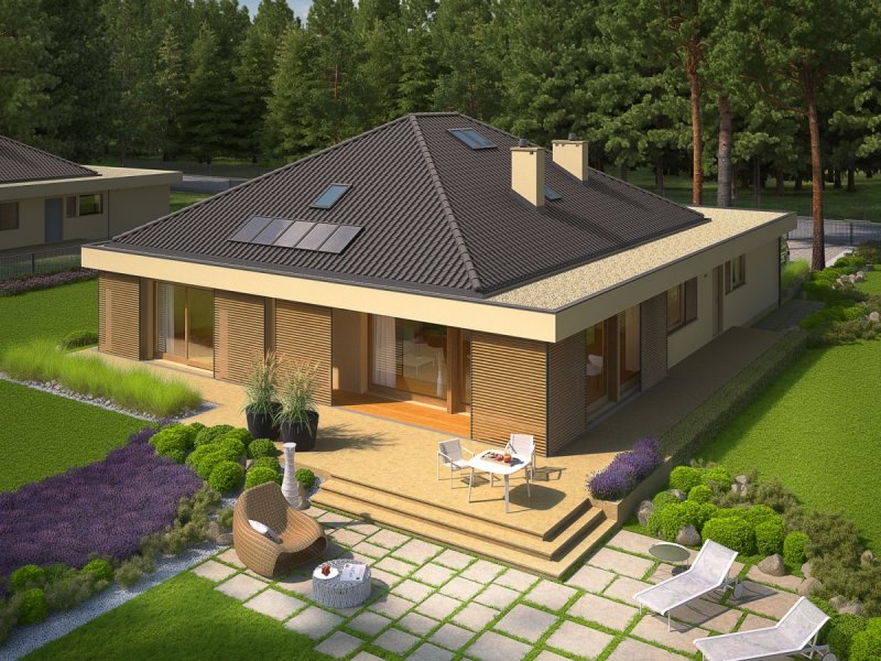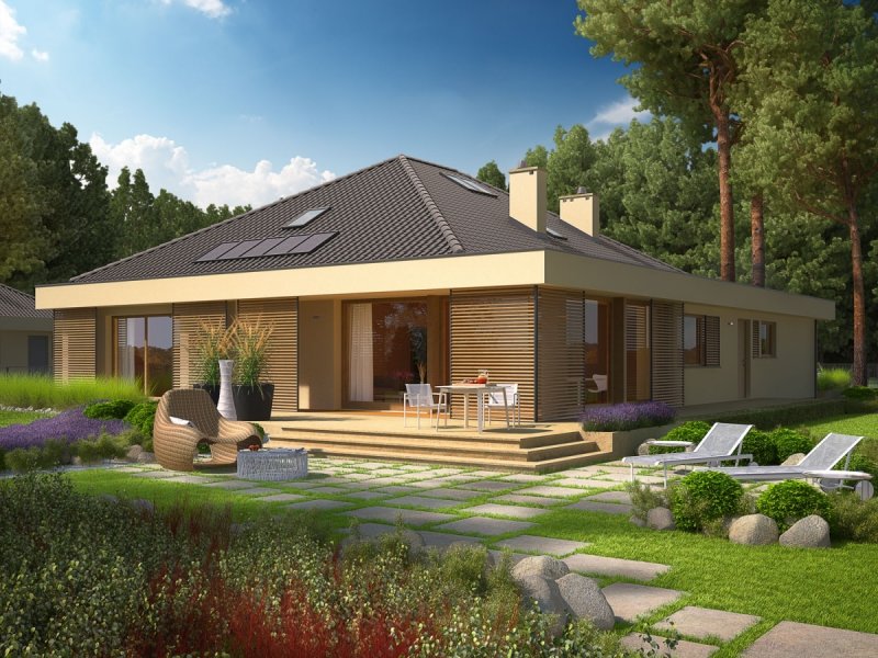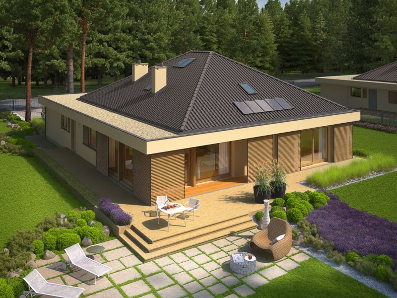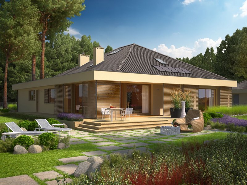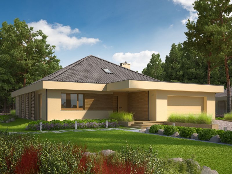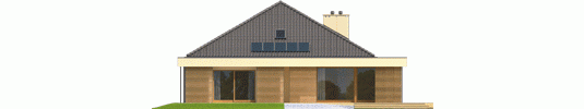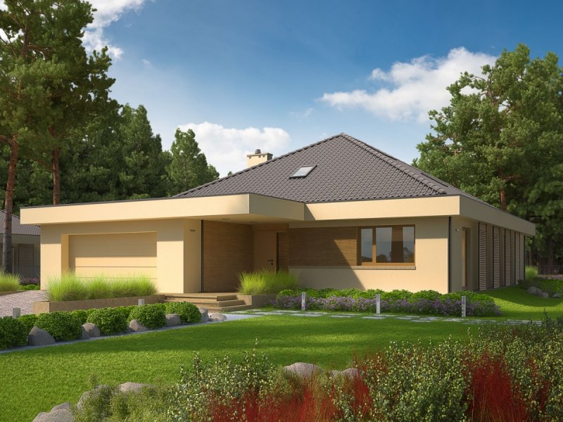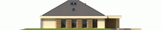 Dom parterowy, niepodpiwniczony, z możliwością adaptacji poddasza, z garażem dwustanowiskowym, przeznaczony dla 3-5-osobowej rodziny. Strefa dzienna to funkcjonalna kuchnia ze spiżarnią oraz przestronny salon, połączony z jadalnią. Znajduje się tu także łazienka oraz kameralny gabinet. Strefę nocną tworzą trzy wygodne sypialnie z dużą łazienką. Pomieszczenie gospodarczo-techniczne, w którym znajduje się pralka, zostało umiejscowione za dwustanowiskowym garażem. Dom Gilbert G2 to doskonała propozycja dla inwestorów, którzy cenią wysmakowany design i słoneczne wnętrza. Budynek intryguje swoim atrakcyjnym wyglądem zewnętrznym – ciekawa bryła, którą oplata modernistyczne zadaszenie, harmonijnie łączy się z ciepłą kolorystyką elewacji, tworząc smakowitą kompozycję estetyczną. Atutem domu jest duża ilość przeszkleń, dzięki którym wnętrza zyskują jasny i przytulny charakter. Przed nadmiernym nasłonecznieniem chronią mieszkańców drewniane, przesuwane żaluzje, które pełnią jednocześnie funkcję dekoracyjną, dodając bryle budynku pazura nowoczesności. Elastyczny i funkcjonalny układ pomieszczeń uzupełnia komfortowa strefa tarasu, która od wiosny do późnej jesieni będzie cieszyć domowników swoją nastrojową atmosferą – idealną na relaks w towarzystwie rodziny, przyjaciół i balsamicznej zieleni ogrodu. Istnieje możliwość: - podpiwniczenia budynku