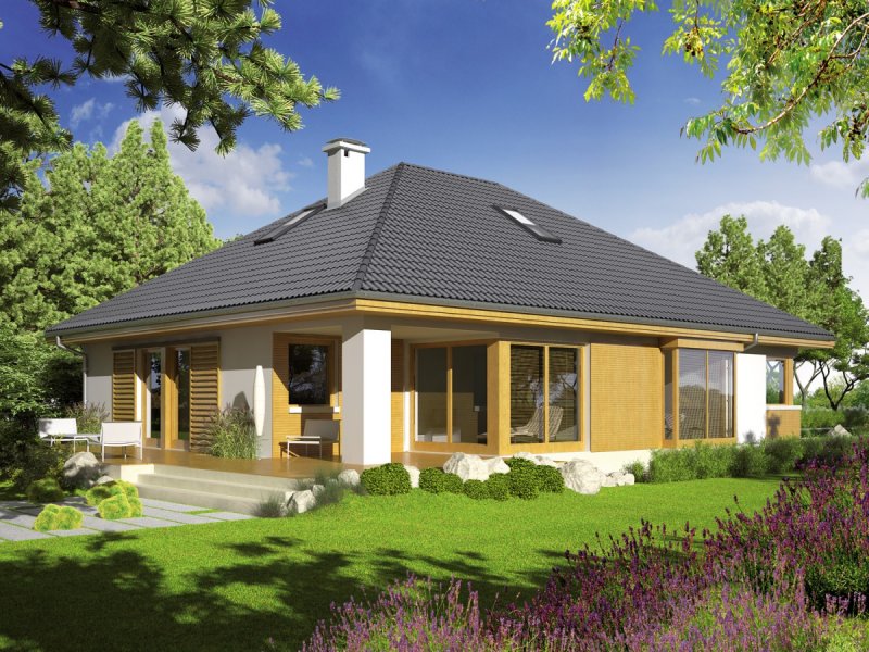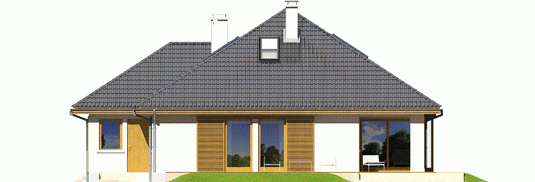 Dom zaprojektowany w technologii murowej ze stropem gęstożebrowym. Schody wewnętrzne drewniane. Dach o konstrukcji drewnianej pokryty dachówką cementową IBF. Elewacje wykończono tynkiem mineralnym i okładziną drewnianą, cokół kamienny. Stolarka okienna drewniana lub PCV.