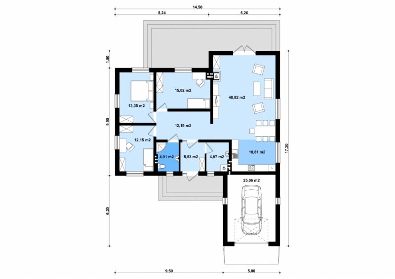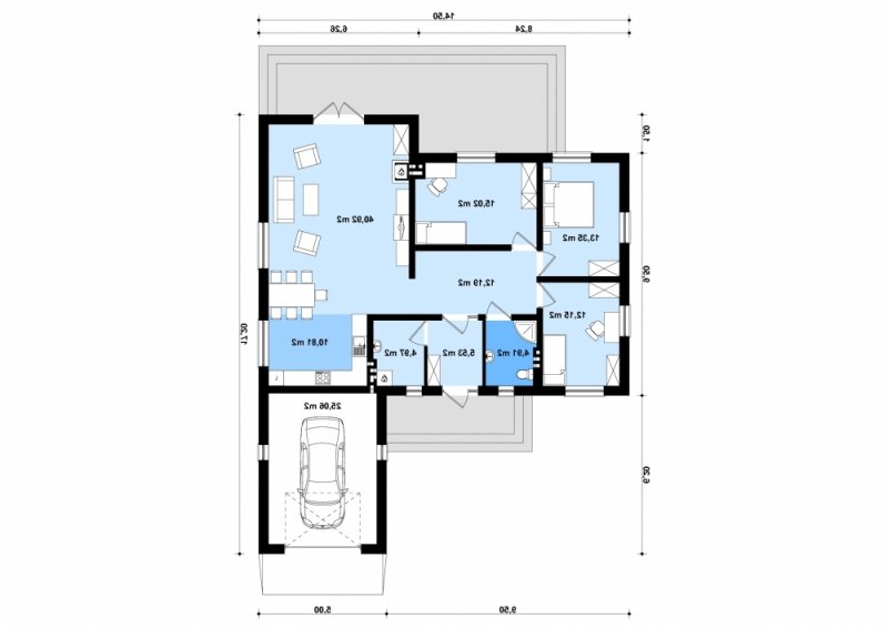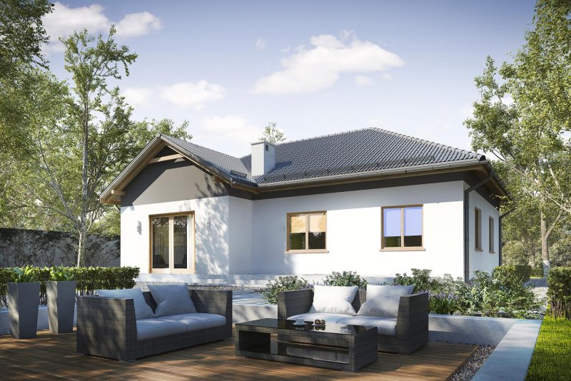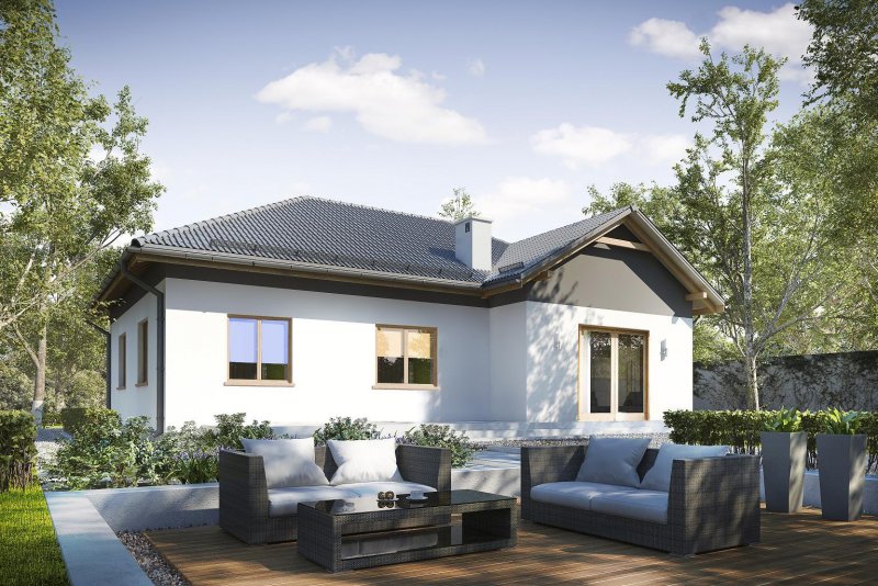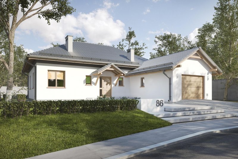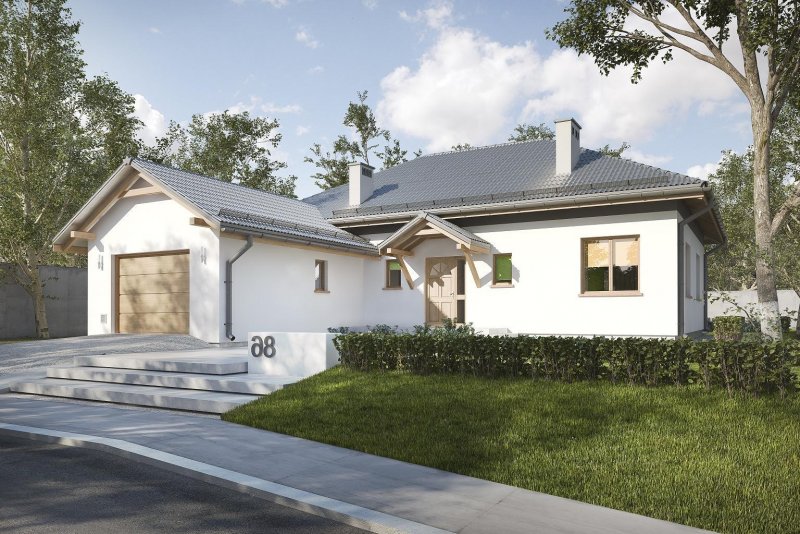 Projekt budynku mieszkalnego, jednorodzinnego, parterowego, niepodpiwniczonego z garażem. Do projektu dołączone jest zestawienie: stali, więźby dachowej oraz stolarki drzwiowej i okiennej, jak również bezpłatna zgoda na dokonanie zmian.