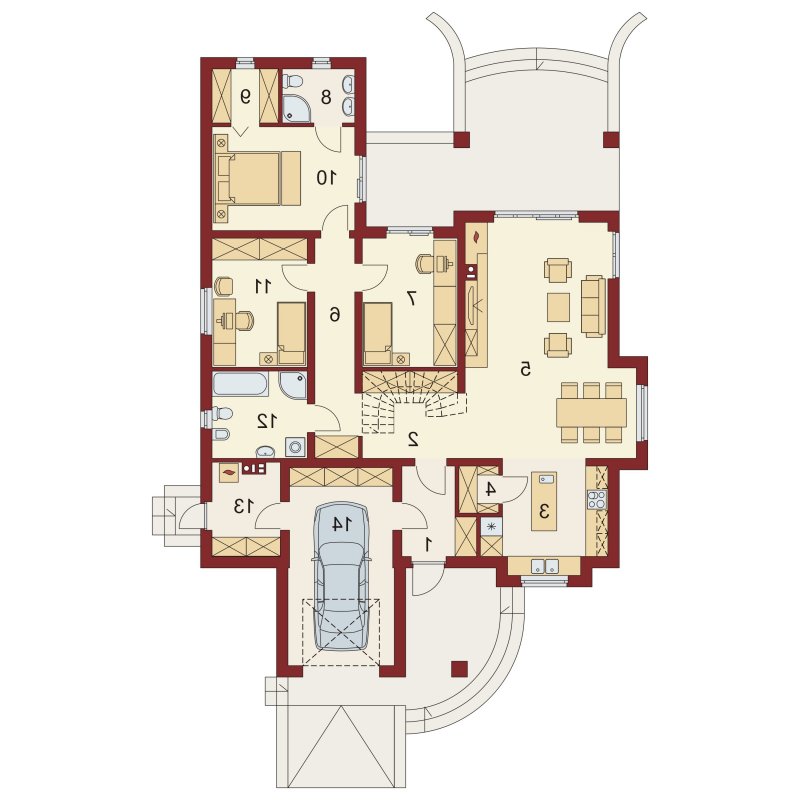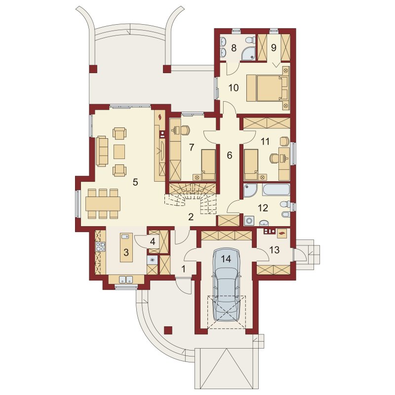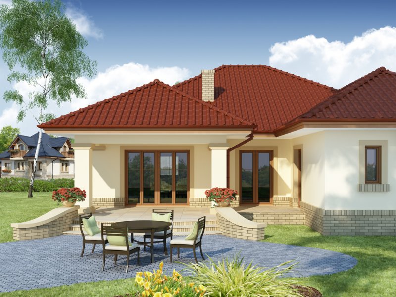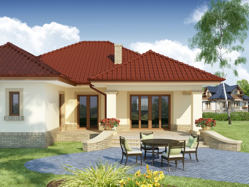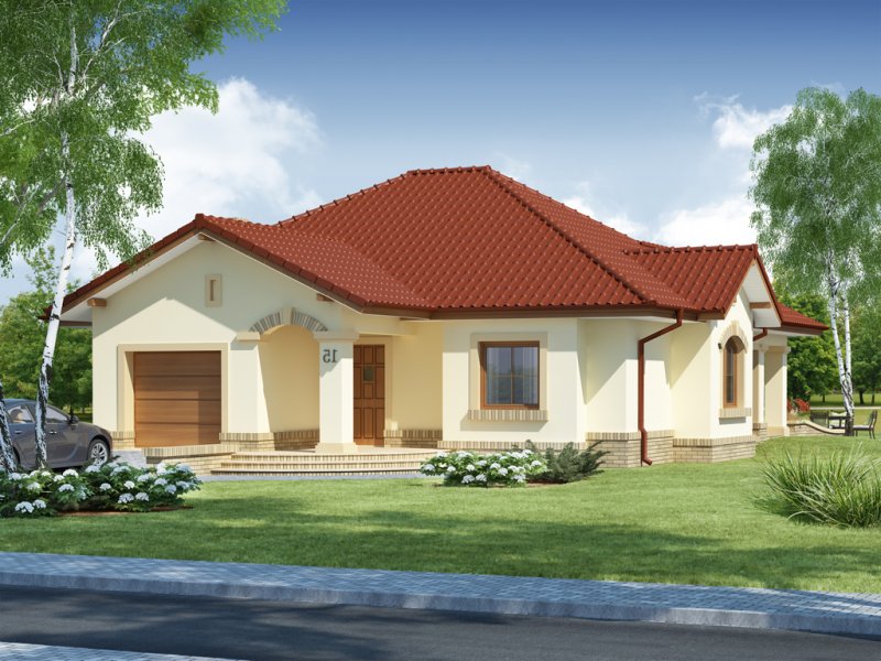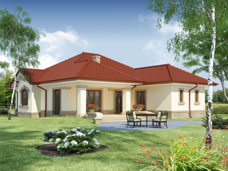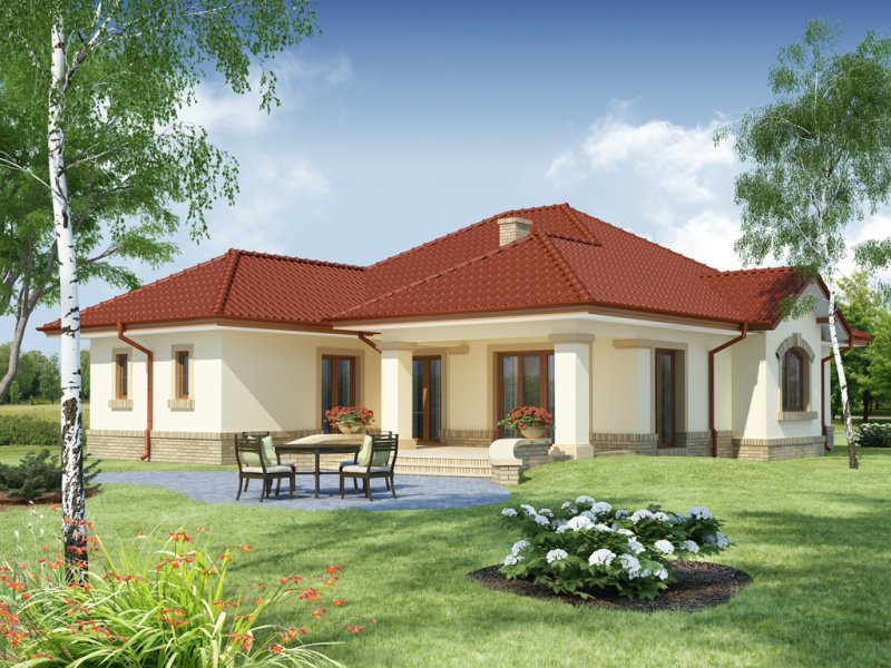 Hera to dom idealny dla 4 osobowej rodziny, o ciekawej bryle, która idzie w parze z funkcjonalnym rozwiązaniem układu wnętrza i klarownym podziałem na strefę dzienną i nocną. Serce domu tworzy przestronny pokój dzienny z kominkiem płynnie przechodzący w osadzoną w wykuszu jadalnię i dużą, otwartą kuchnię z wyspą i podręczną spiżarnią. Całość ta razem z wygodnym korytarzem, w którym wygospodarowano miejsce na głębokie szafy wnękowe, garażem jednostanowiskowym oraz kotłownią, do których można się dostać przez wiatrołap i łazienką ogólnodostępną ,składa się na strefę dzienną domu. Drugą strefę - nocną - tworzą dwa ustawne pokoje dla dzieci oraz duża dwuosobowa sypialnia z niezależnym pokojem kąpielowym, własną garderobą i z wyjściem na taras. W razie potrzeby projekt daje możliwość uzyskania dodatkowej powierzchni na pokój hobby czy sypialnię dla gości poprzez przekształcenie poddasza w część użytkową, aranżując schody nad szafami w korytarzu i doświetlając przestrzeń strychu oknami połaciowymi, a zwolennikom kuchni zamkniętych - opcję bezproblemowego zamknięcia jej ściankami działowymi.