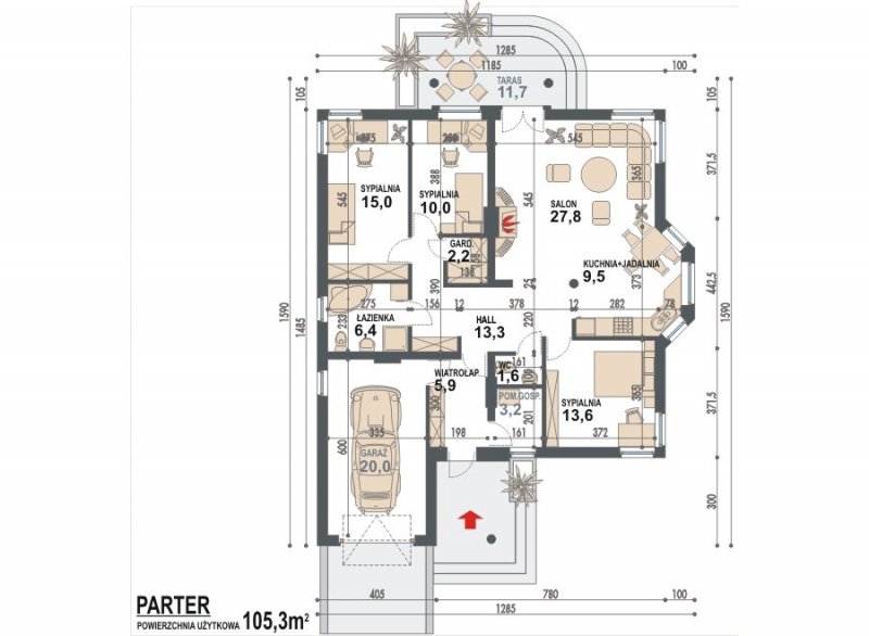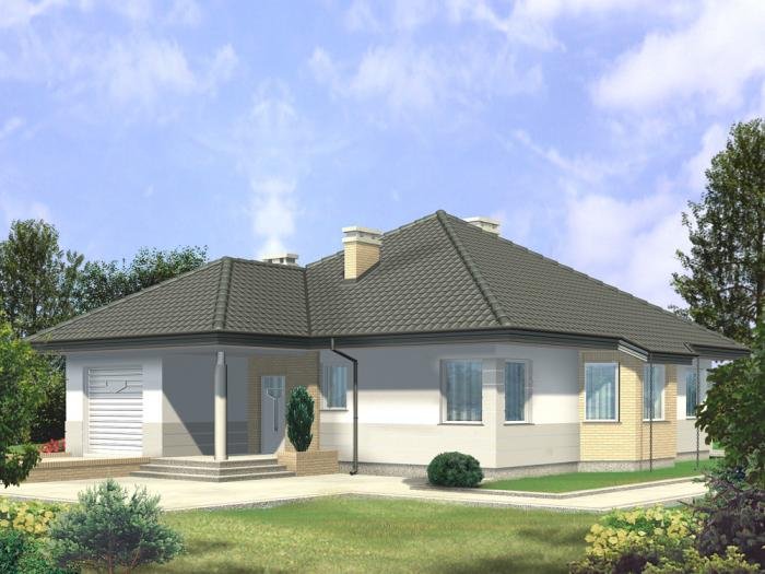 * zaprojektowano reprezentacyjny salon z kominkiem, kuchnię z aneksem jadalnym, 3 sypialnie, garderobę, garaż i pom. gosp.(kotłownię)