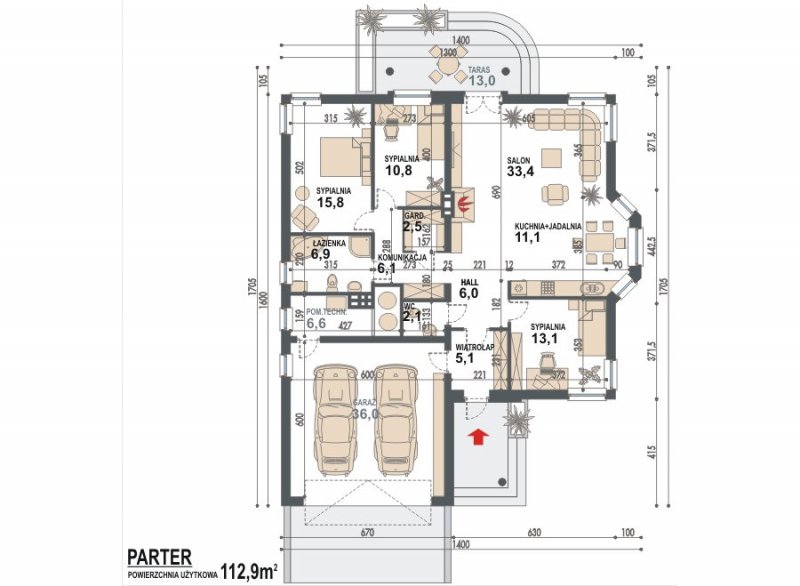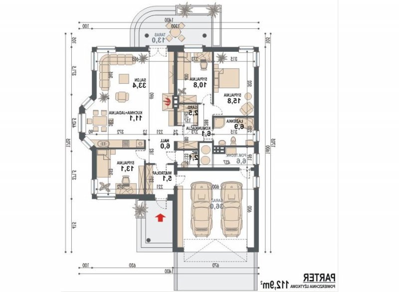 * na parterze zaprojektowano reprezentacyjny salon z kominkiem, otwartą kuchnię z aneksem jadalnym, 3 sypialnie, garderobę, łazienkę, wc garaż i pom. gosp.(kotłownię)
