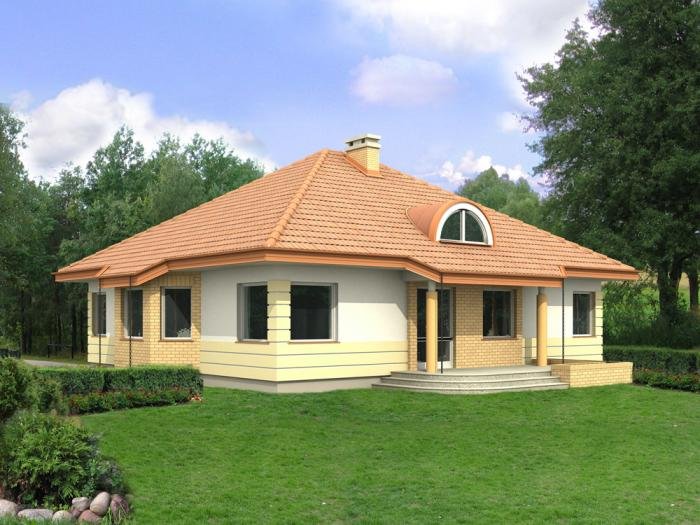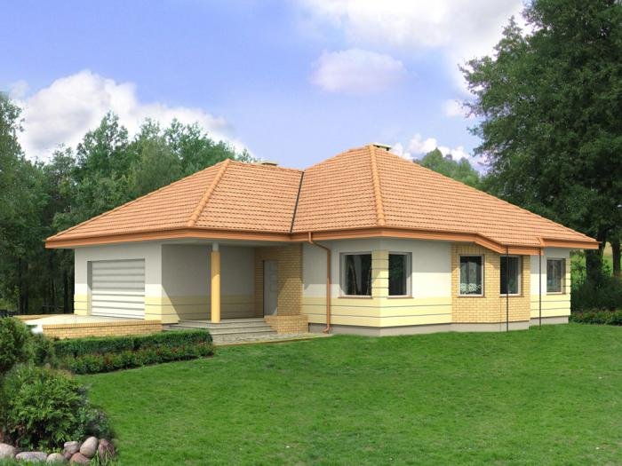 * mały jednorodzinny dom parterowy, z użytkowym poddaszem i garażem dwustanowiskowym (istnieje wersja jednostanowiskowa), niepodpiwniczony