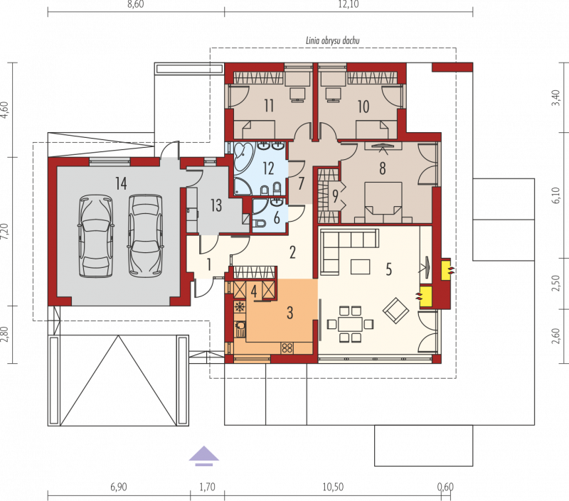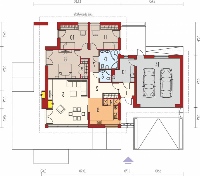 Dach: konstrukcja drewniana, ocieplenie wełna mineralna 30 cm, dachówka płaska lub inna o podobnych parametrach
