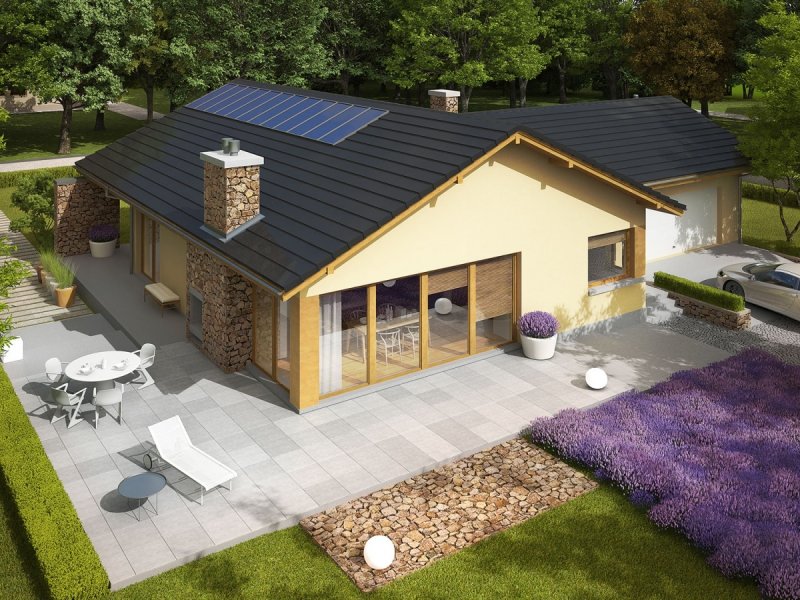 India G2 (wersja B) to uroczy dom, który będzie piękną dekoracją każdego krajobrazu. Ciekawa forma w waniliowej szacie, doprawiona chłodną urodą kamienia tworzy zachwycający efekt wizualny. Atutem projektu są wielkoformatowe przeszklenia, dzięki którym widok zza okna przenika do wnętrz, a naturalne światło opromienia swym blaskiem niemal każdy zakamarek domu. Atrakcyjną strefą, w którą letnią porą przenosi się życie rodzinne i towarzyskie jest okazały taras z imponującym kominkiem zewnętrznym. W jego bliskim sąsiedztwie zlokalizowano ogrodową jadalnię, która zachęca do spożywania posiłków w towarzystwie matki natury. India G2 (wersja B) to doskonała propozycja dla miłośników nowoczesnego designu i przytulnej wygody.