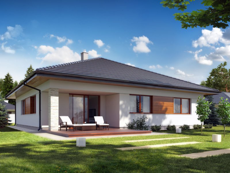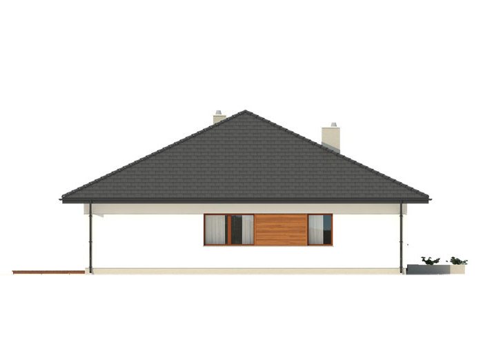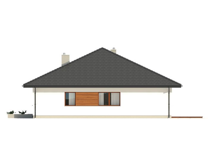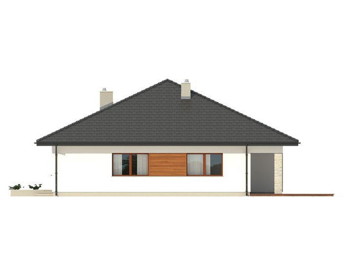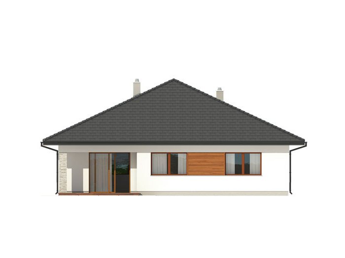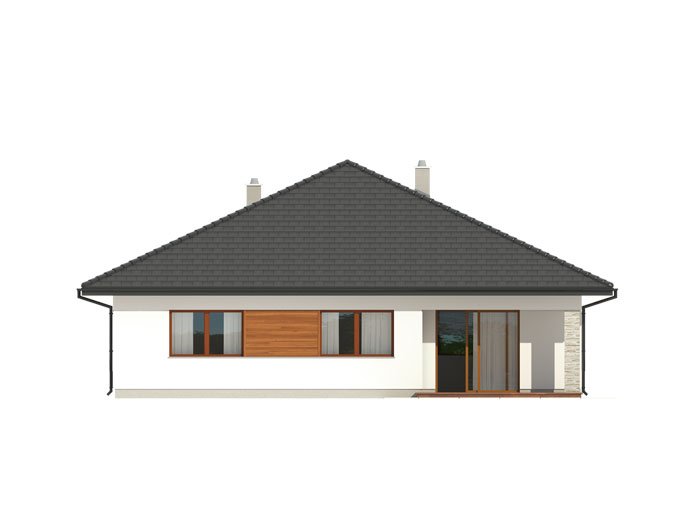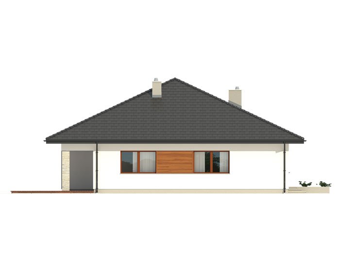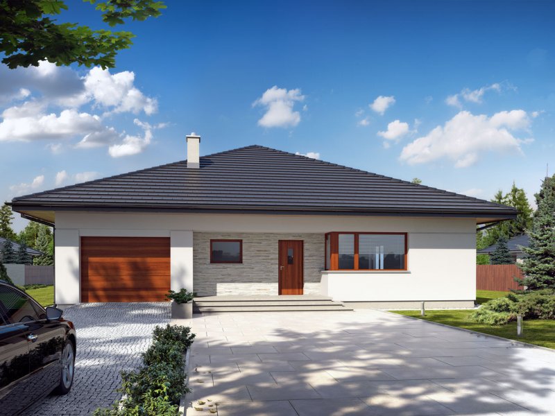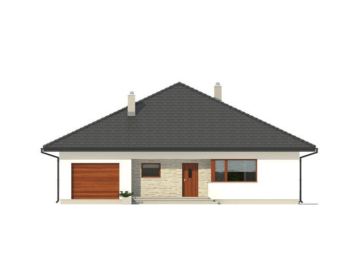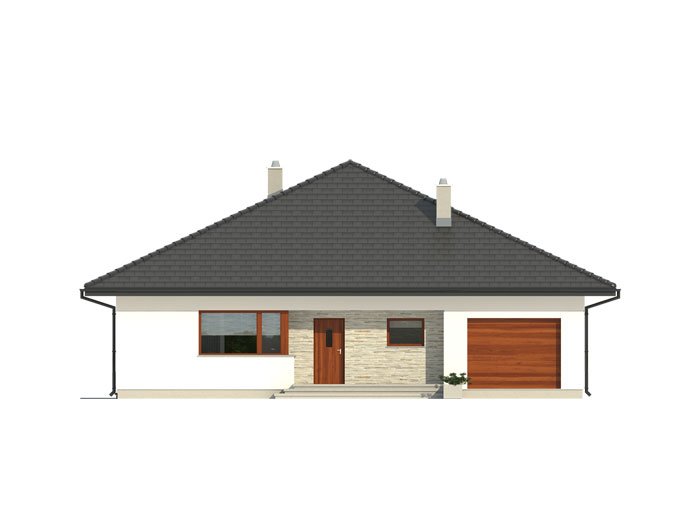 Dom jednorodzinny, parterowy, z garażem jednostanowiskowym. Wygodny i przestronny. Kuchnia posiada spiżarnię oraz wyposażona została w duże okno z widokiem na schody wejściowe. Duża jadalnia od kuchni oddzielona została barem. Salon ma wysokość 2,98 m przez obniżenie poziomu posadzki względem reszty domu. Posiada też duże przeszklone wyjście na zadaszony taras. W domu tym przewidziano miejsce na schody prowadzące na strych, który można dowolnie zagospodarować (nieujęty do powierzchni użytkowej). Kotłownia pozwala na zastosowanie kotła na dowolny rodzaj paliwa, a przez przesunięcie ścian działowych można ją powiększyć kosztem holu i wc.