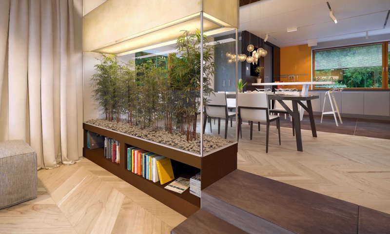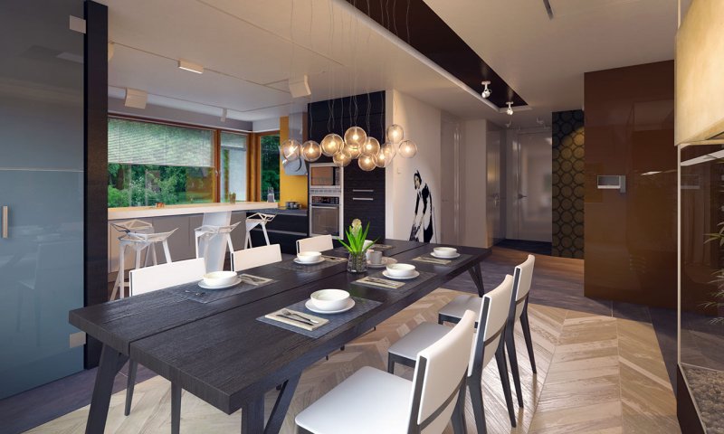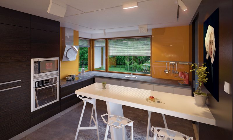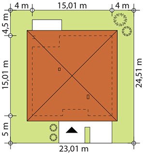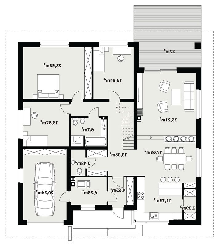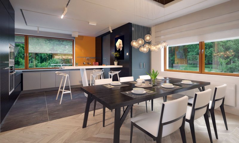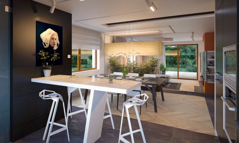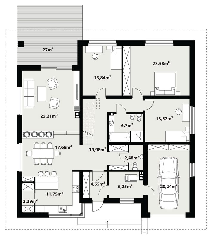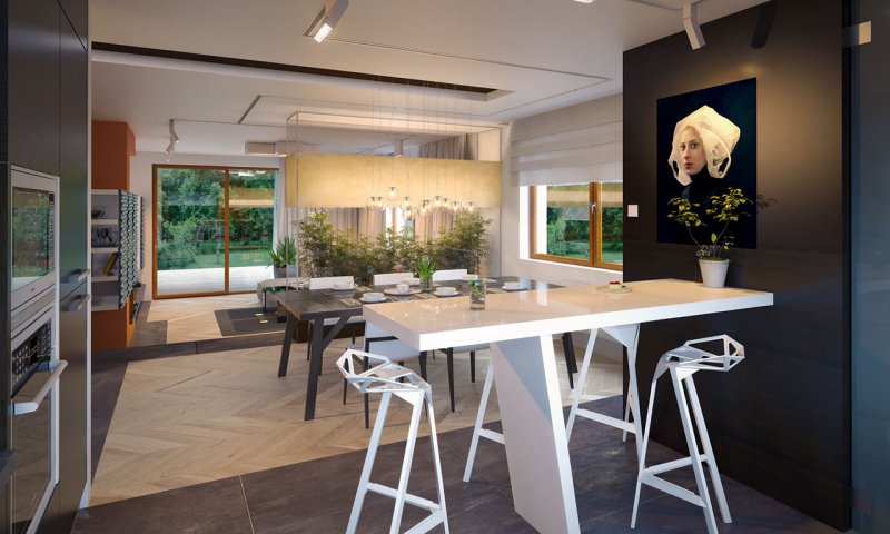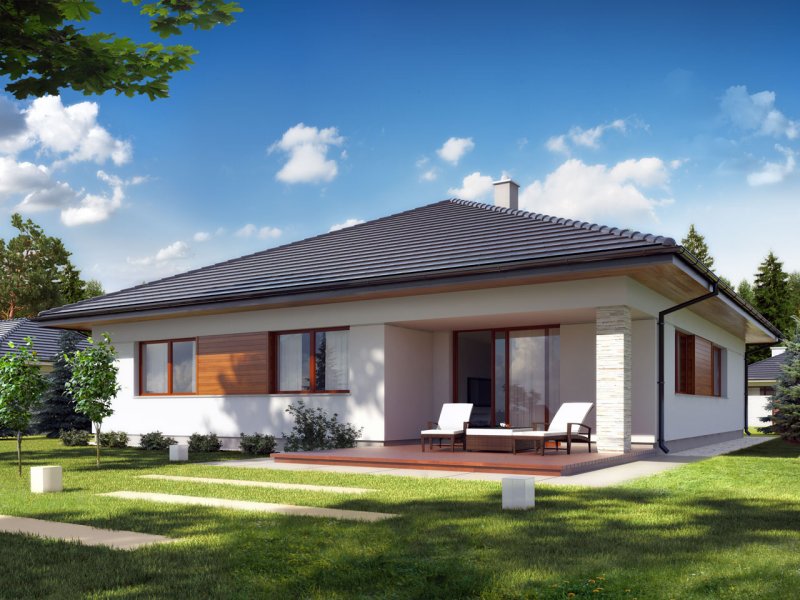 Dom jednorodzinny, parterowy, z garażem jednostanowiskowym. Wygodny i przestronny. Kuchnia posiada spiżarnię oraz wyposażona została w duże okno z widokiem na schody wejściowe. Duża jadalnia od kuchni oddzielona została barem. Salon ma wysokość 2,98 m przez obniżenie poziomu posadzki względem reszty domu. Posiada też duże przeszklone wyjście na zadaszony taras. W domu tym przewidziano miejsce na schody prowadzące na strych, który można dowolnie zagospodarować (nieujęty do powierzchni użytkowej). Kotłownia pozwala na zastosowanie kotła na dowolny rodzaj paliwa, a przez przesunięcie ścian działowych można ją powiększyć kosztem holu i wc.