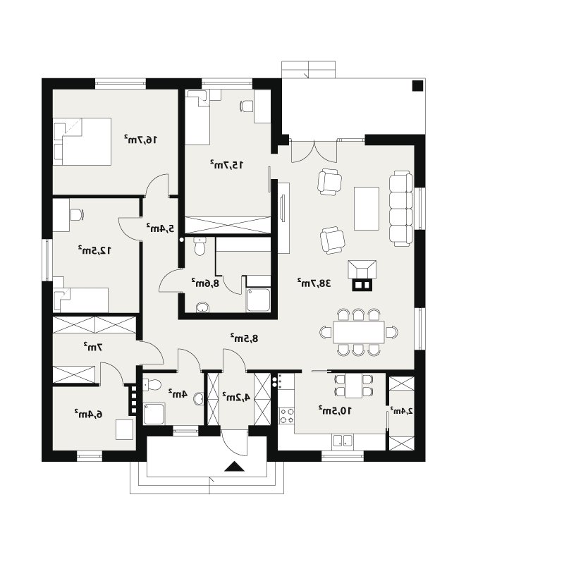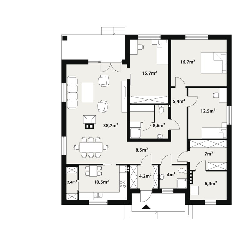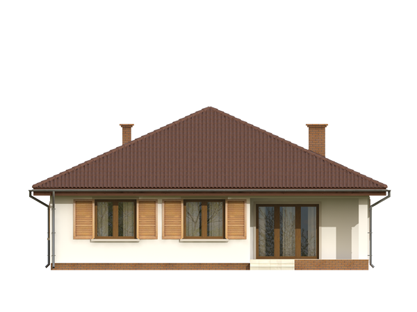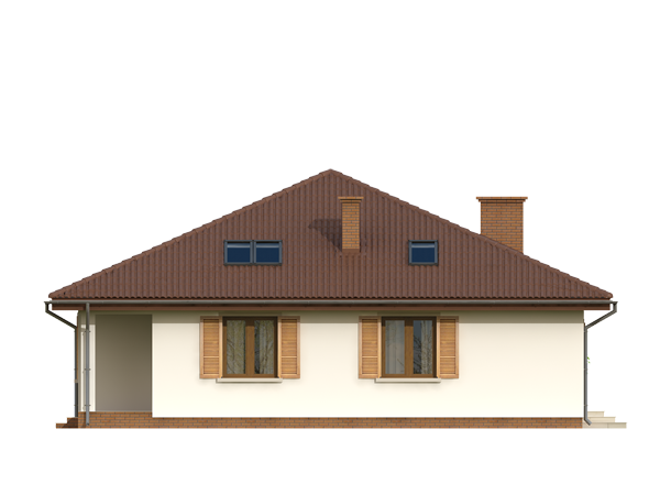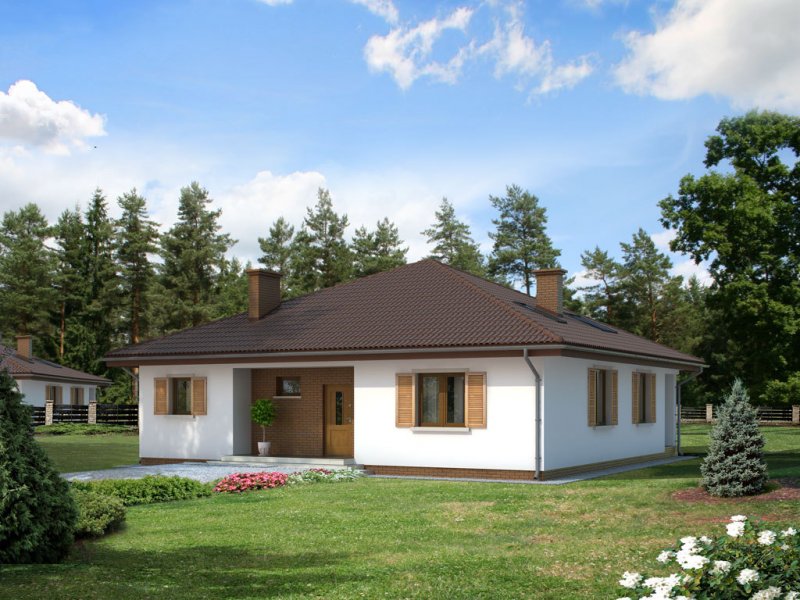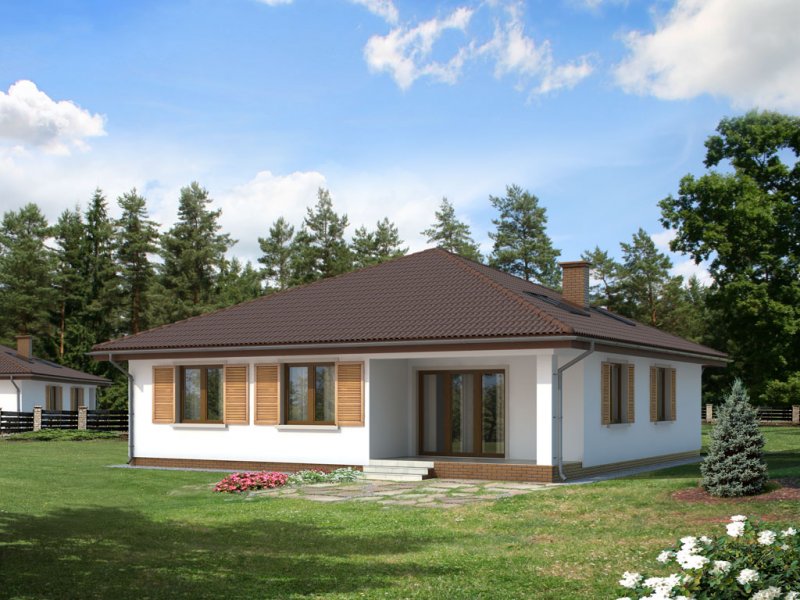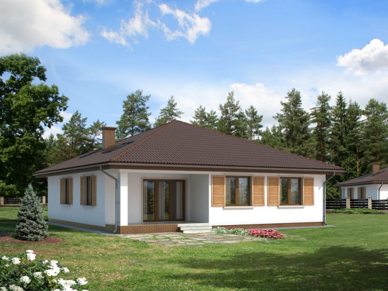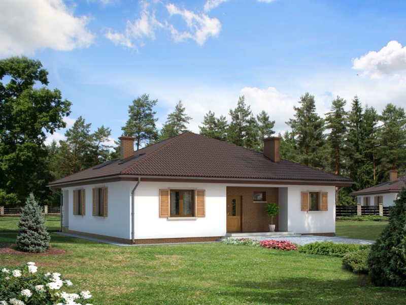 Dom jednorodzinny, parterowy, niepodpiwniczony, bez garażu. Wygodny, z otwartym salonem i sauną w łazience. Kształt domu zbliżony do kwadratu jest optymalny dla celów termoizolacji. Wygodna jadalnia, wydzielona kominkiem z salonu dziennego, daje możliwość ciekawej aranżacji wnętrza. Kotłownia – w razie potrzeby istnieje łatwa możliwość powiększenia o powierzchnię garderoby, dwie wygodne łazienki. Istnieje wersja ze ścianami trójwarstwowymi, bez otwartego do góry salonu.