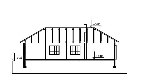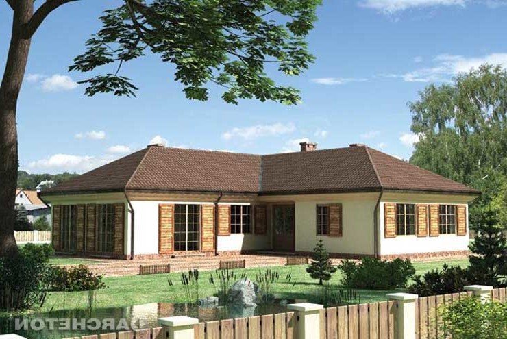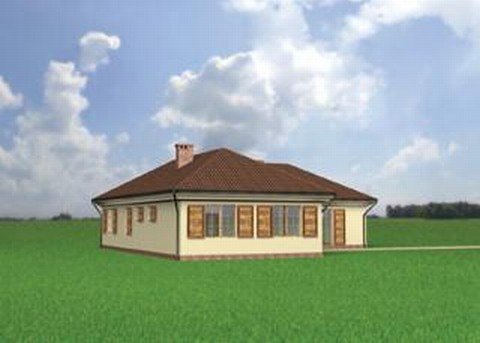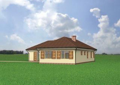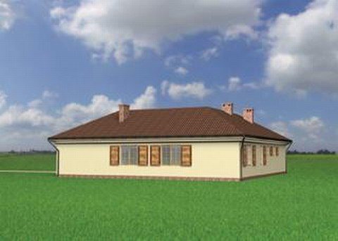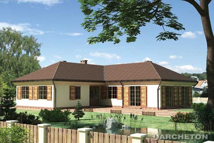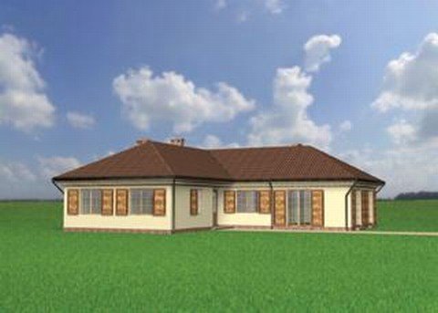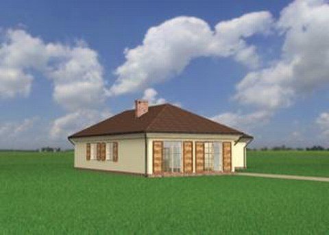 Wejście przez sień na prawo do holu. Z holu dostępne są 2 pokoje sypialne, wc, łazienka, kuchnia, jadalnia i pokój dzienny. Z sieni dostępne także drugie skrzydło domu, 2 pokoje sypialne, łazienka, w.c. i pomieszczenie gospodarcze. Parterowy budynek na rzucie litery "L" przykryty dachem wielospadowym o kącie nachylenia 30°. Klasyczna bryła budynku urozmaicona malowniczymi okiennicami. Idealny dom dla średniej wielkości rodziny, chcącej mieszkać na jednym poziomie.