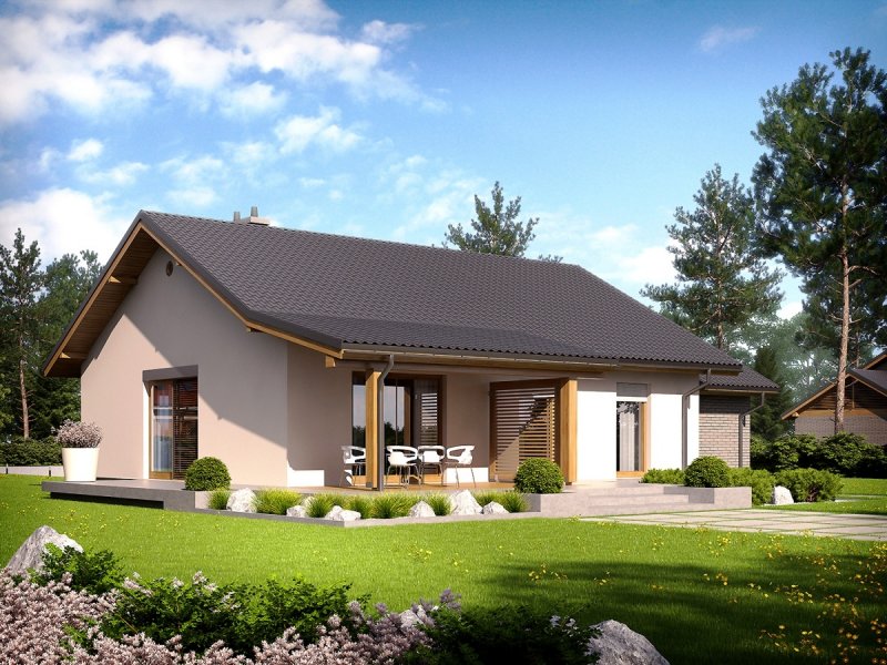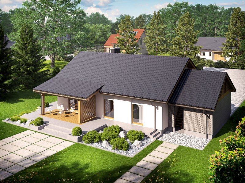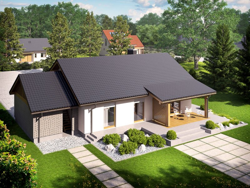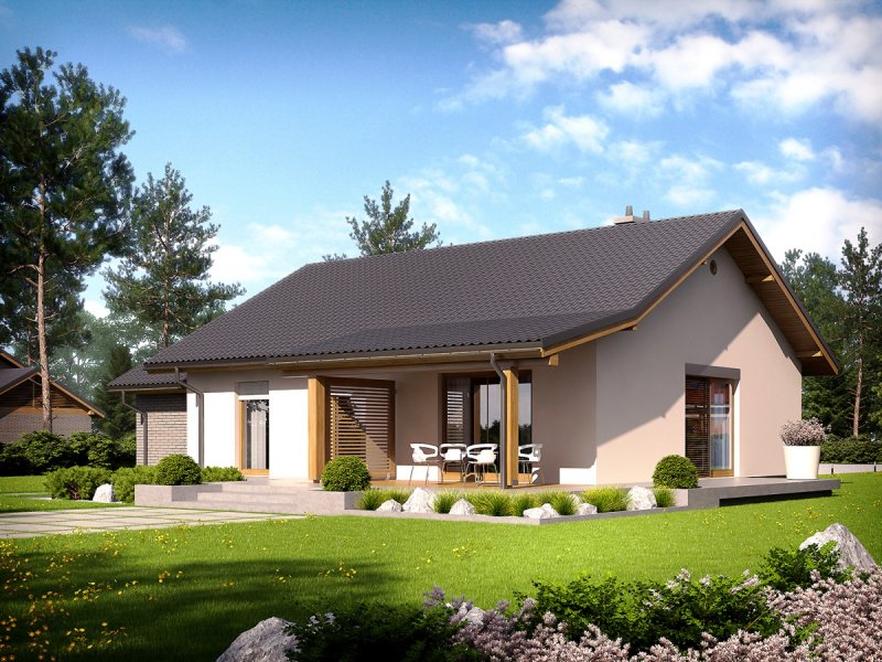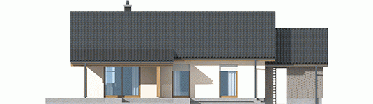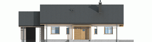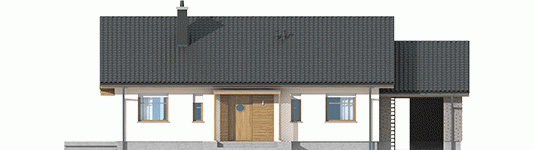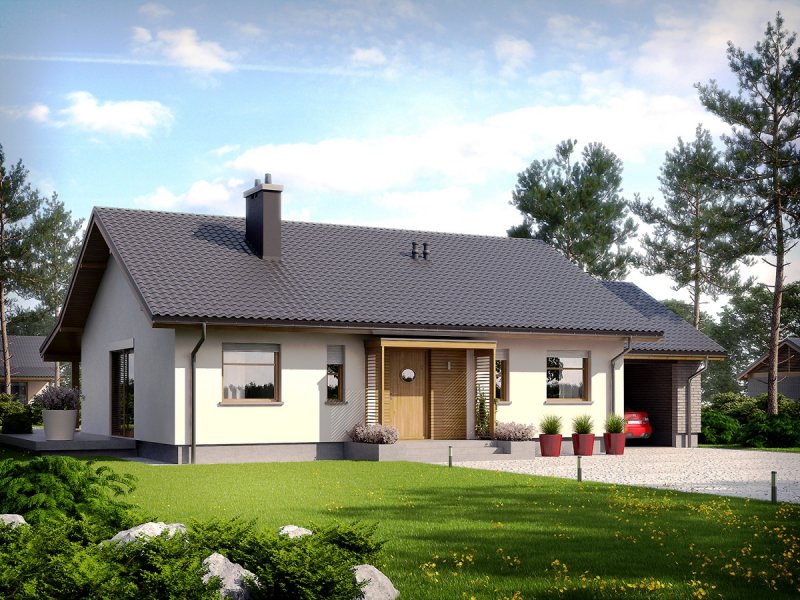 Kornel II z wiatą to dom, który łączy oszczędną formę z nowoczesną estetyką elewacji. Strefa wejściowa wita domowników i gości dekoracyjną, drewnianą pergolą, po której subtelnie wspina się zieleń roślin. Ciekawym elementem architektury domu jest zadaszenie zaplanowane nad tarasem – delikatnie złamana linia dachu dodaje bryle finezyjnego uroku, wyodrębniając jednocześnie komfortową strefę wypoczynkową. Duże przeszklenia otwierają wnętrze na atrakcyjny pejzaż ogrodu, a jednocześnie zapewniają maksymalne doświetlenie pomieszczeń. Budynek wzbogacono o wiatę garażową z przejściem na antresolę. Dom zaprojektowany z myślą o inwestorach, którzy cenią przytulną nowoczesność.