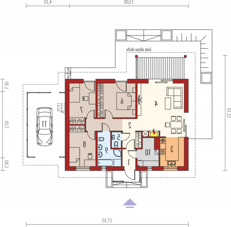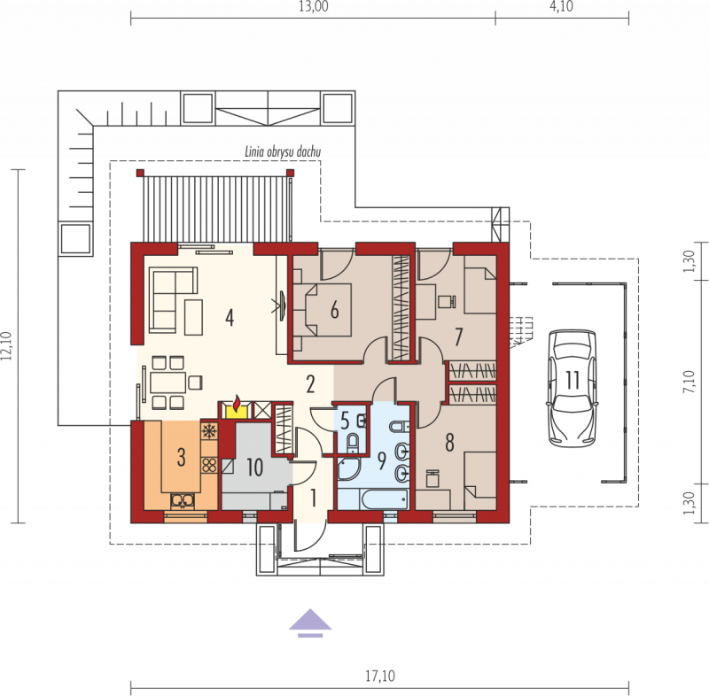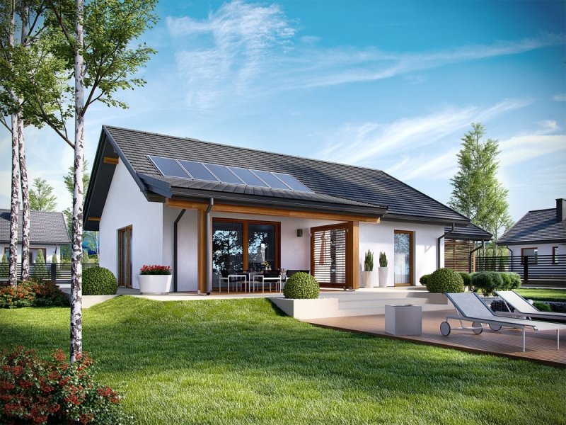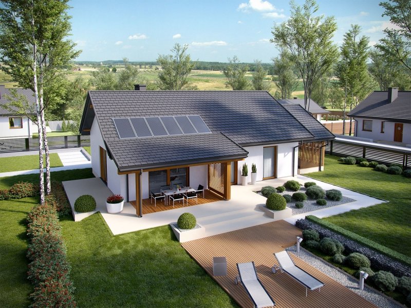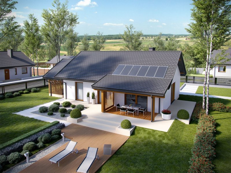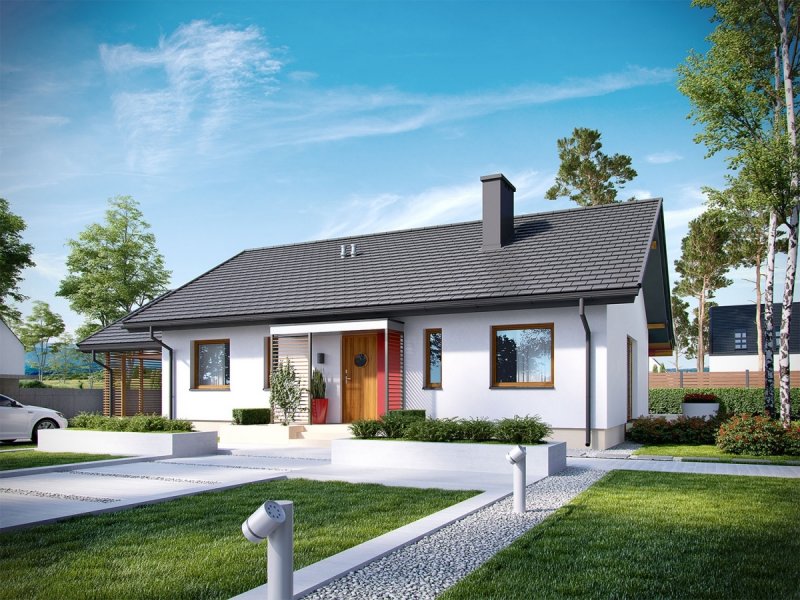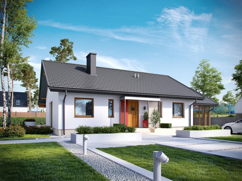 Kornel VI (z wiatą) ENERGO to dom, który do każdego krajobrazu wprowadzi powiew świeżości i nowoczesnej elegancji. Prosty, ale jednocześnie stylowy i intrygujący, z wnętrzem, w którym rządzi funkcjonalna wygoda. Dużym atutem projektu jest otwarty charakter strefy dziennej, który integruje domowników wokół wspólnych zajęć i zaprasza do odpoczynku w towarzystwie ognistych refleksów kominka. Atrakcyjną częścią domu jest również kameralny taras, który letnią porą staję się ulubionym miejscem spotkań całej rodziny.