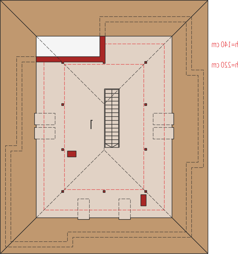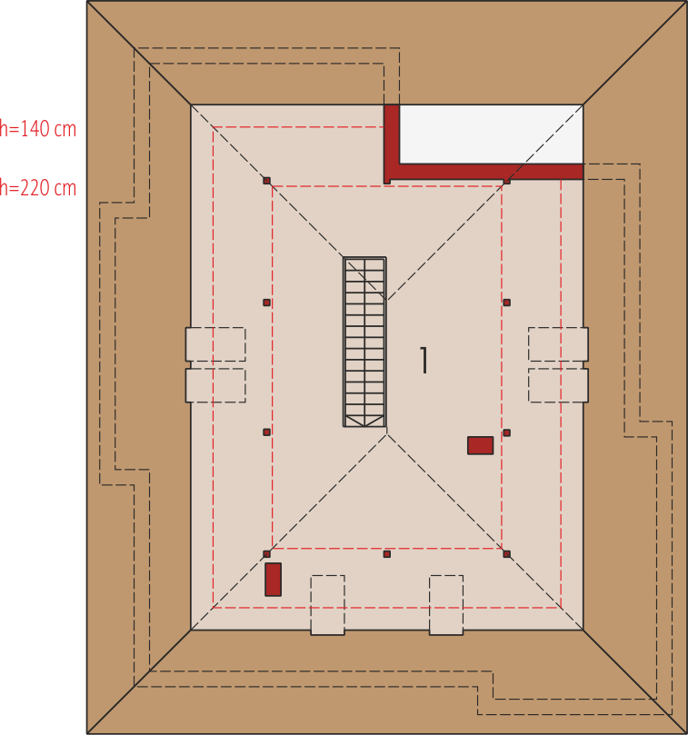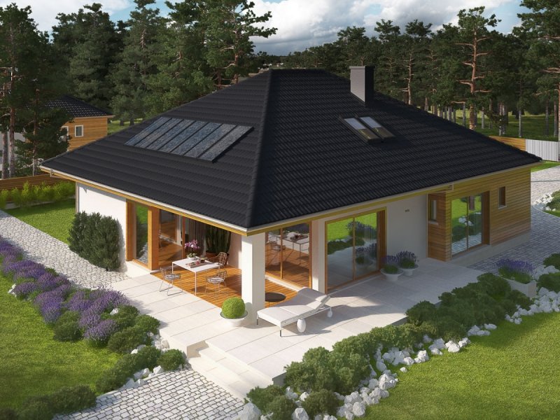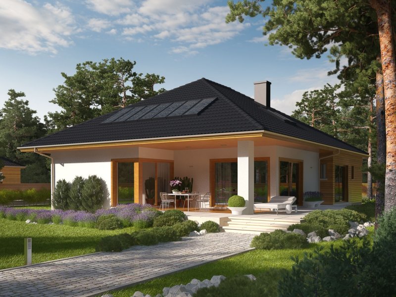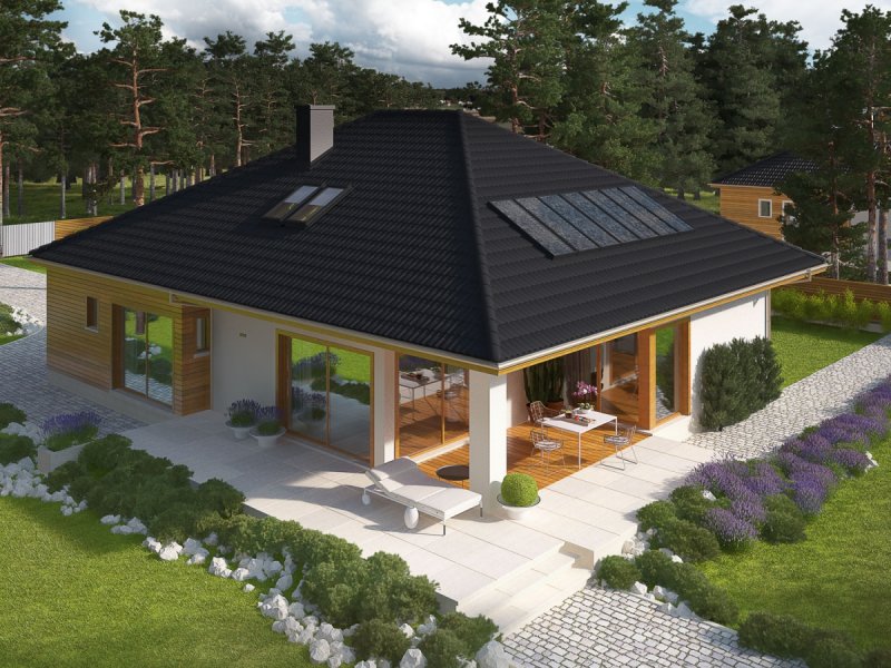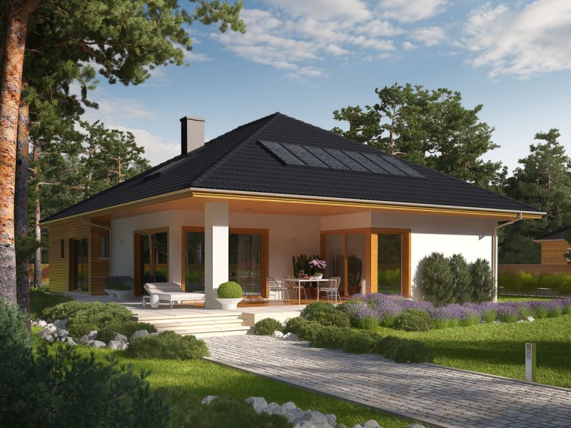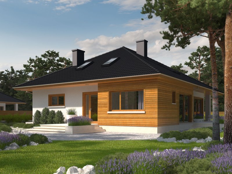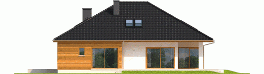 Dom zaprojektowany w technologii murowej ze stropem gęstożebrowym. Schody wewnętrzne drewniane. Dach o konstrukcji drewnianej pokryty dachówką ceramiczną Röben. Więźba dachowa dostępna również w systemie prefabrykacji drewnianej. Elewacje wykończono tynkiem mineralnym i okładziną drewnianą. Stolarka okienna drewniana lub PCV. W projekcie zastosowano rozwiązania firmy VELUX.