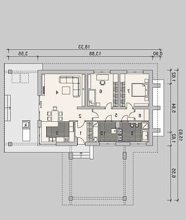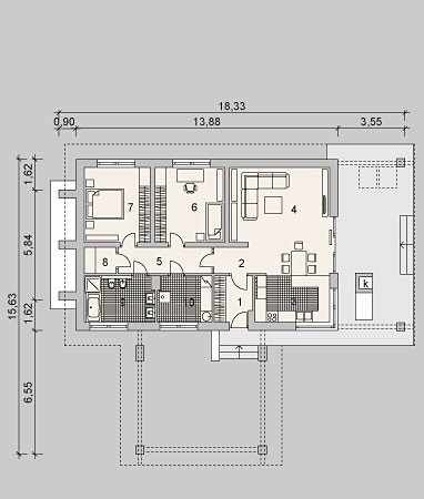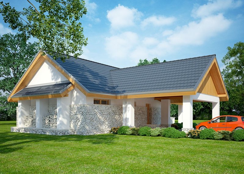Tradycyjny dom parterowy dla rodziny 3-4 osobowej. Posiada dwie sypialnie, pokój dzienny połączony z jadalnią oraz kotłownie z pralnią.