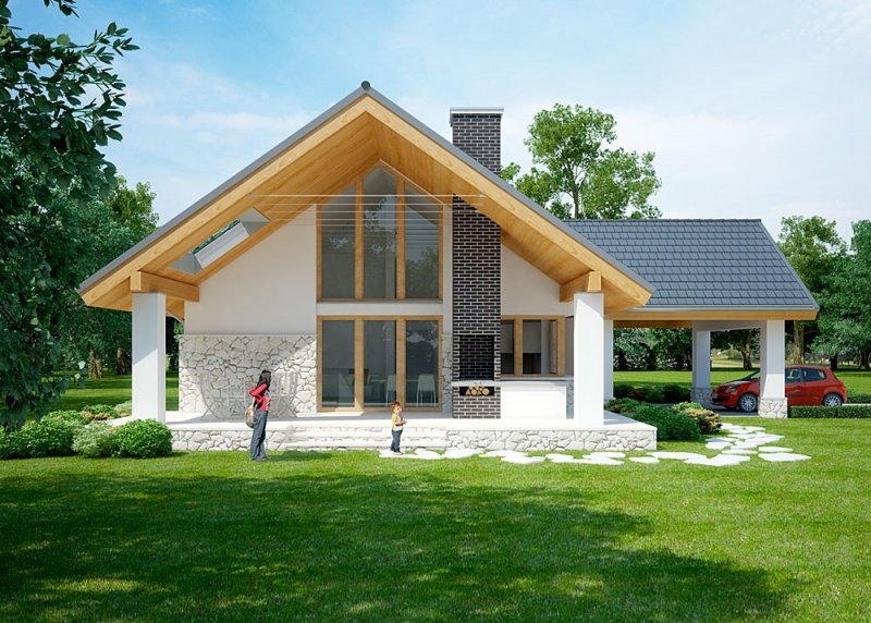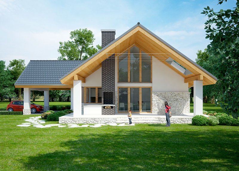 - Elewacje: wykończone tynkiem silikonowym, cegłą klinkierową Terca Stratus firmy Wienerberger, okładzina drewniana, kamień naturalny łupany
