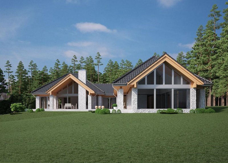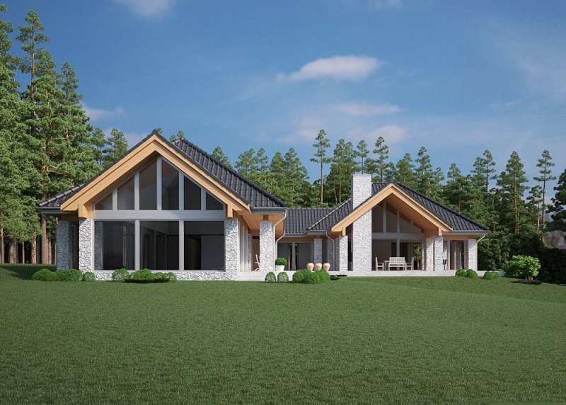 - Elewacje: wykończone tynkiem silikonowym, kamieniem naturalnym łupanym i drewnem