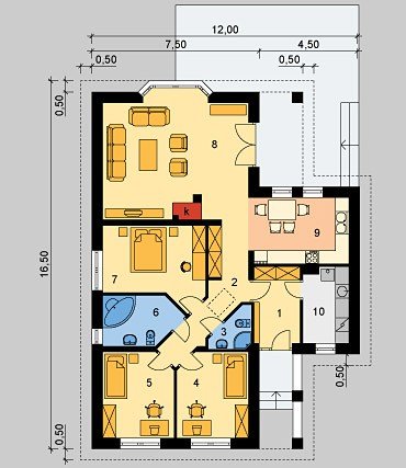 - Elewacje: wykończone tynkiem akrylowym, cokoły obłożone płytkami klinkierowymi