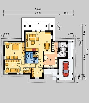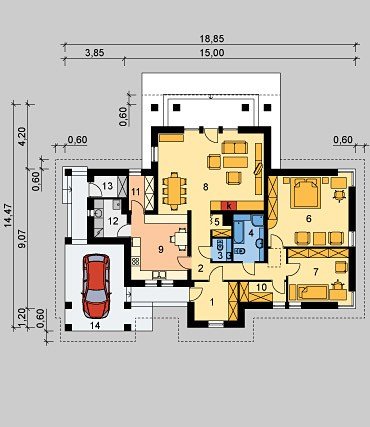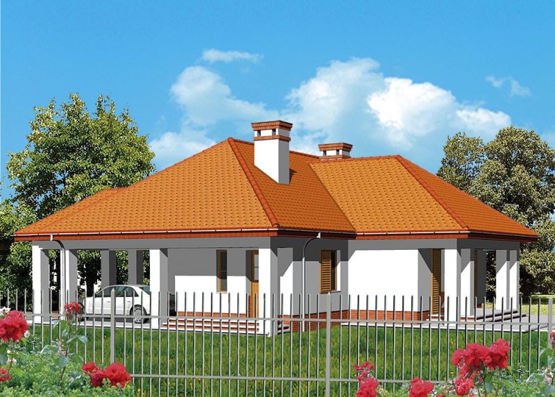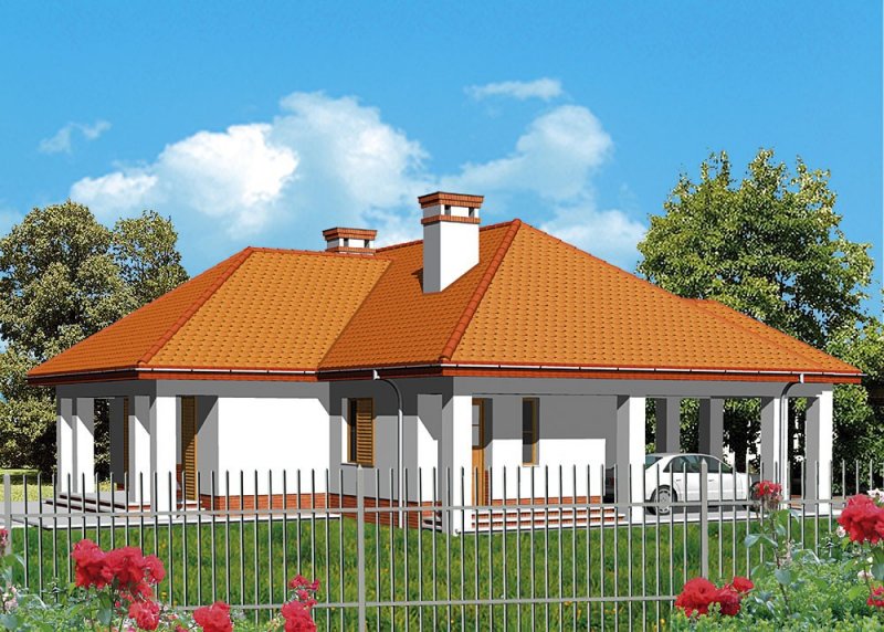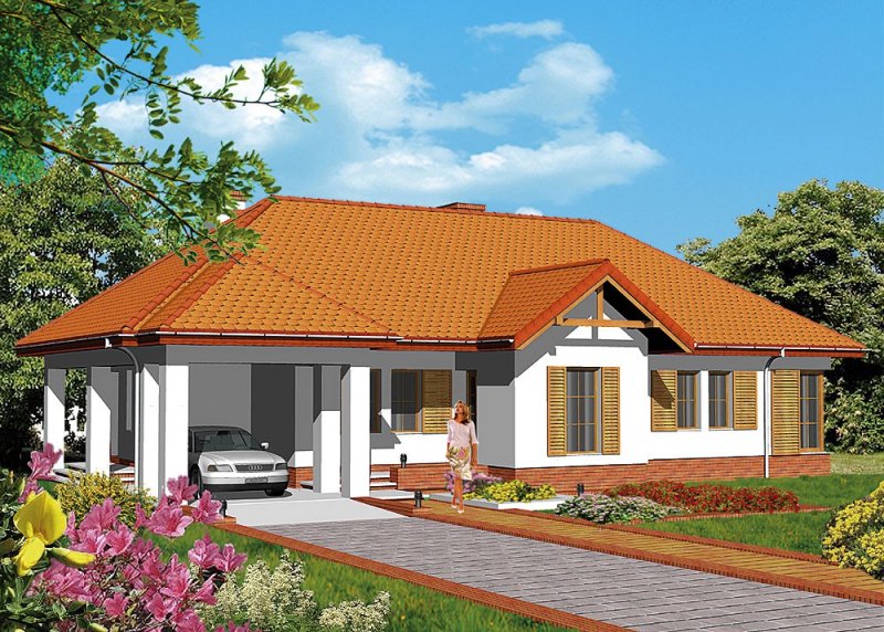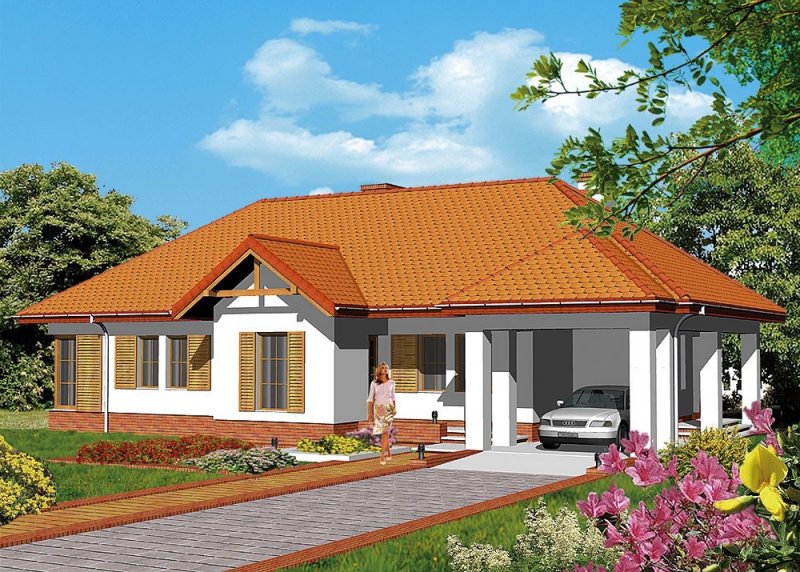 Dom jednorodzinny, parterowy, z wiatą garażową.