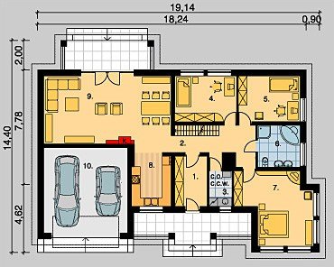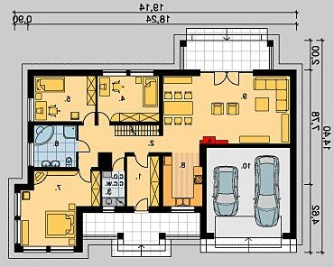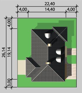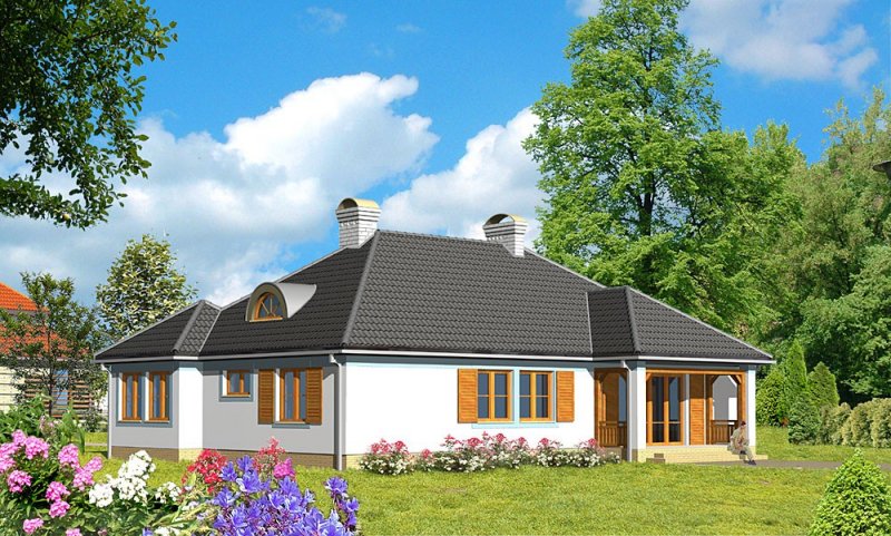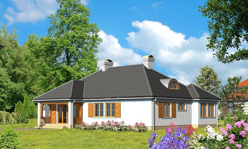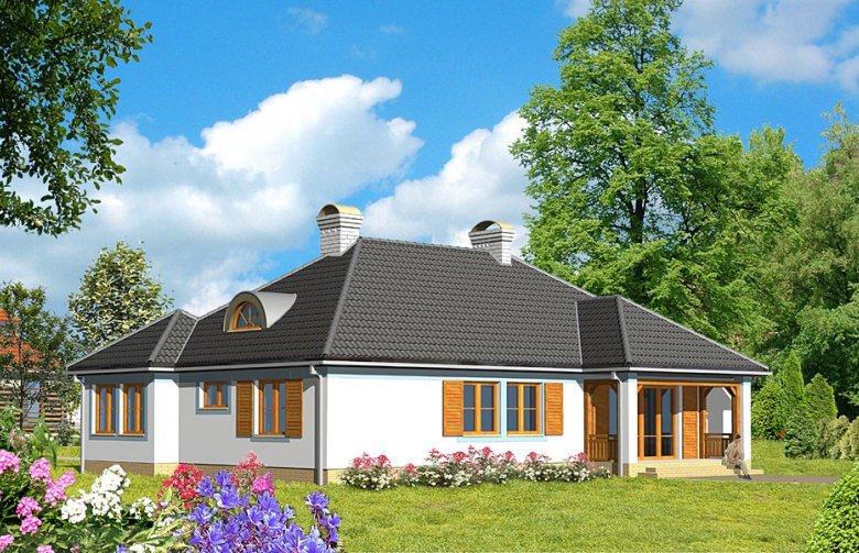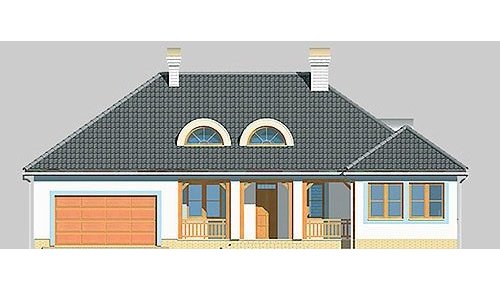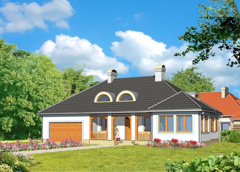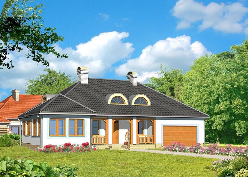 Dom jednorodzinny, parterowy, z poddaszem użytkowym i dwustanowiskowym garażem.