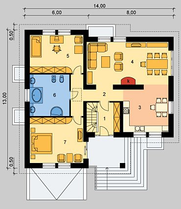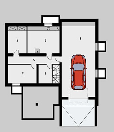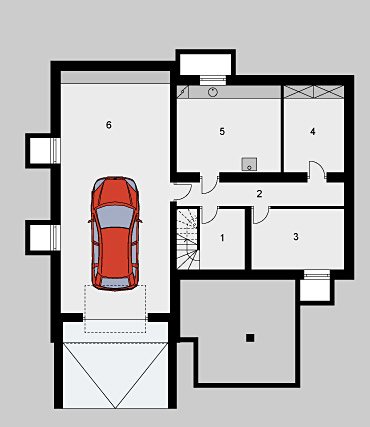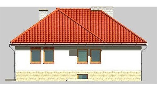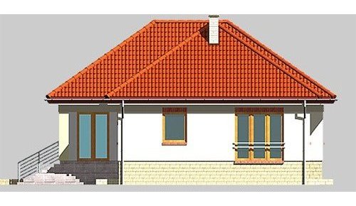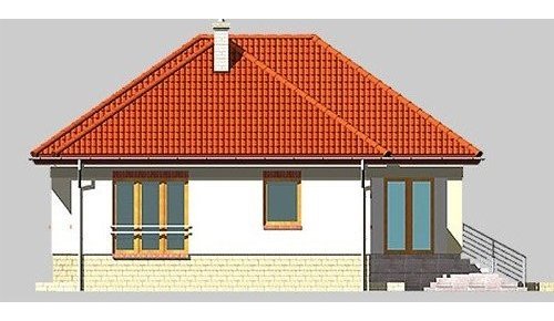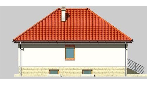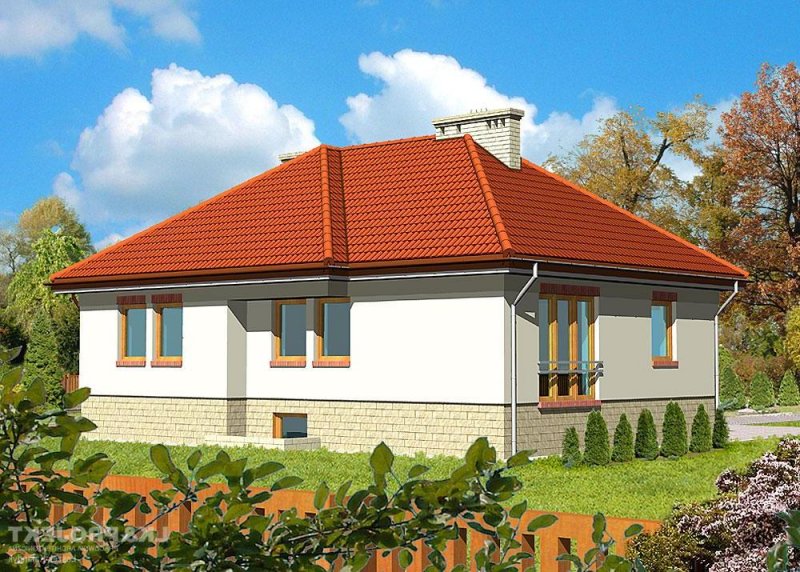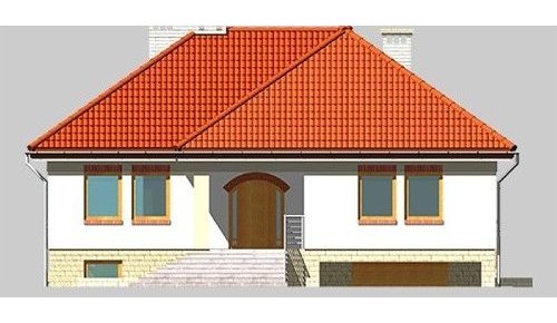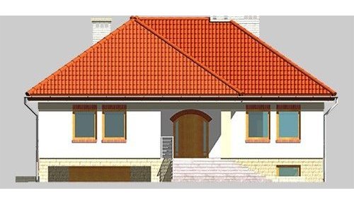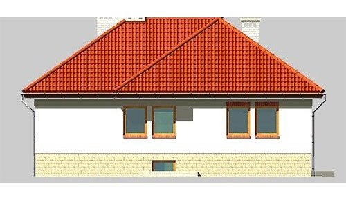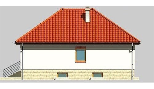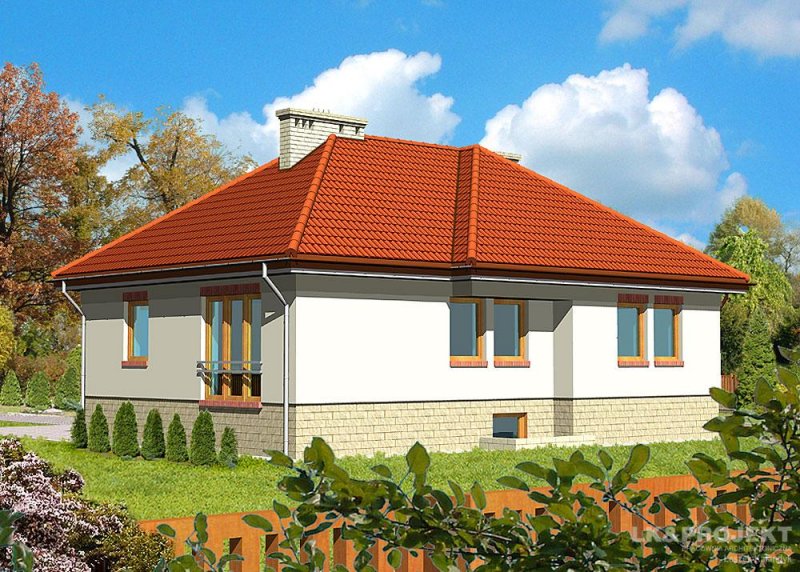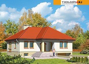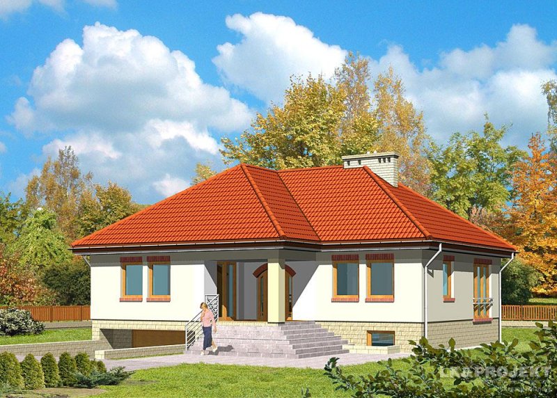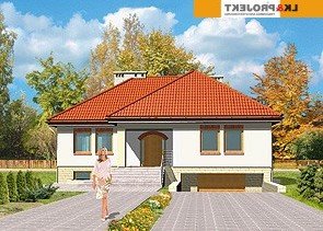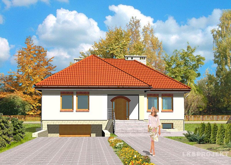 Dom jednorodzinny, parterowy, podpiwniczony, z garażem. Zaprojektowany z myślą o ludziach ceniących prostotę i elegancję. Poziom parteru jest na wysokości umożliwiającej wygodne doświetlenie piwnic oraz wjazdu do garażu. Po prawej stronie centralnie usytuowanego hallu znajduje się kuchnia i jadalnia połączone z przestronnym pokojem dziennym. Część nocną stanowią dwie sypialnie przedzie-lone wygodną, prawie 15-metrową łazienką.