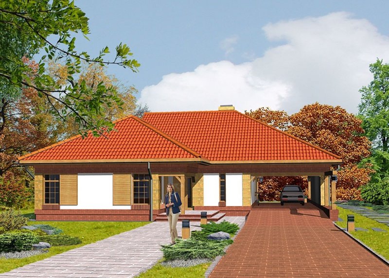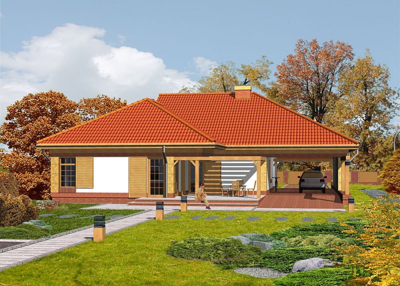 Dom jednorodzinny, parterowy, z wiatą garażową.