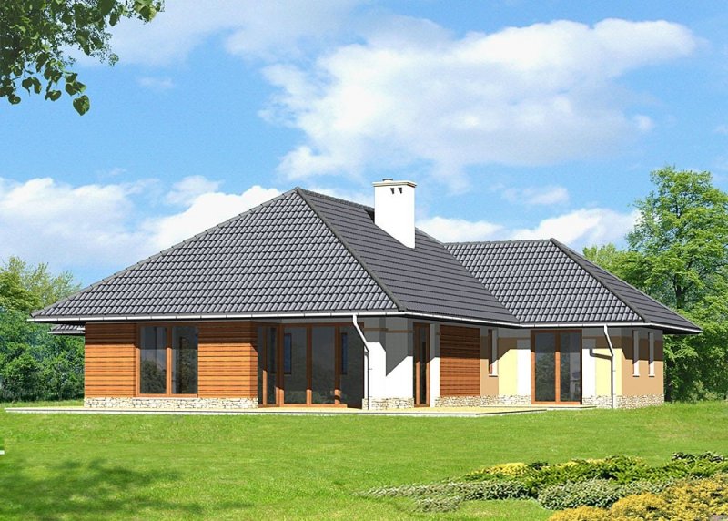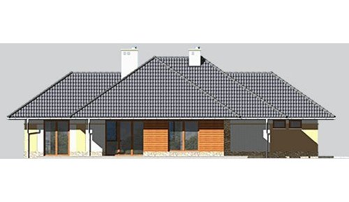 - Elewacje: wykończone tynkiem silikonowym, częściowo obłożone kamieniem naturalnym i drewnem