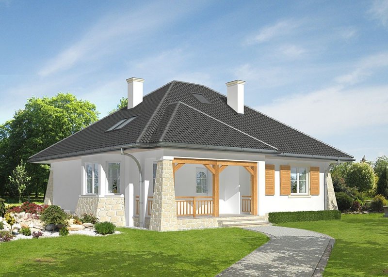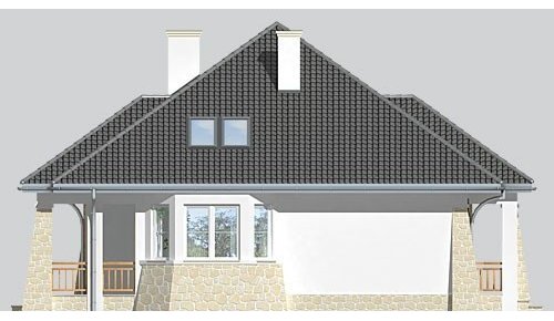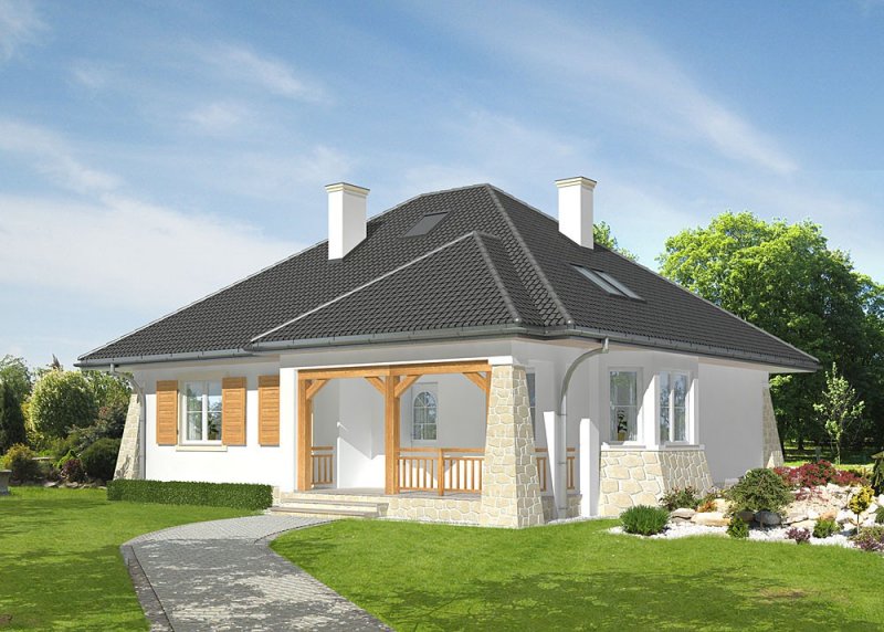 - Elewacje: wykończone tynkiem silikonowym, częściowo obłożone kamieniem naturalnym
