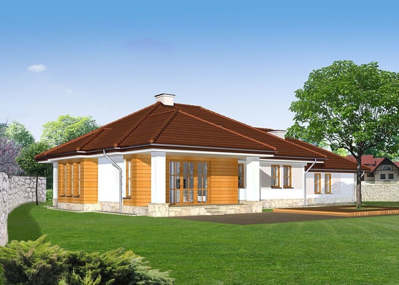 - Elewacje: wykończone tynkiem silikonowym, cokół obłożony kamieniem naturalnym łupanym i deskami elewacyjnymi