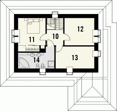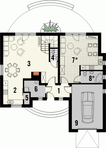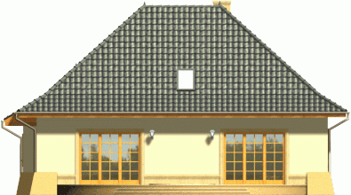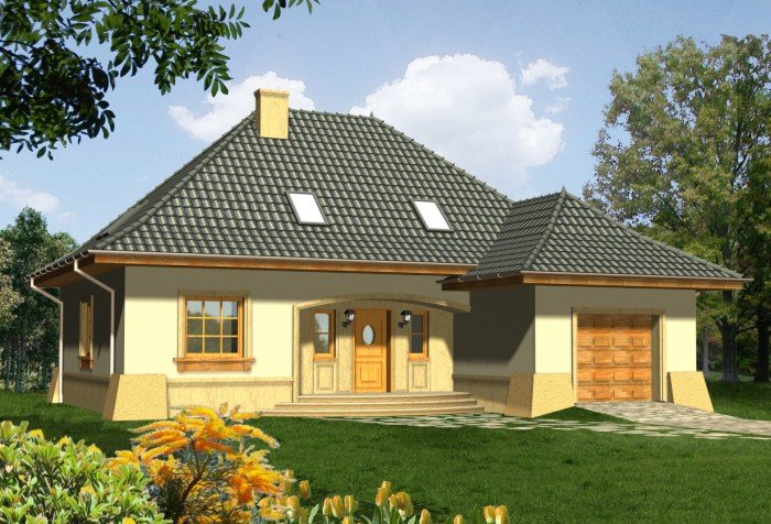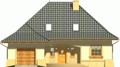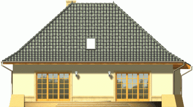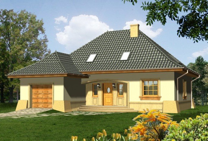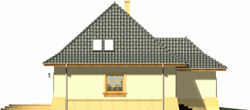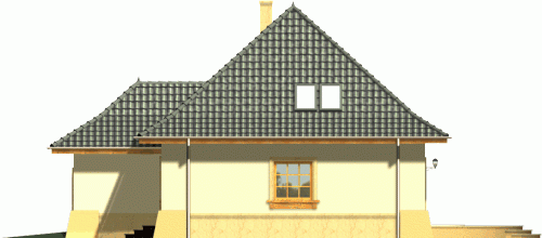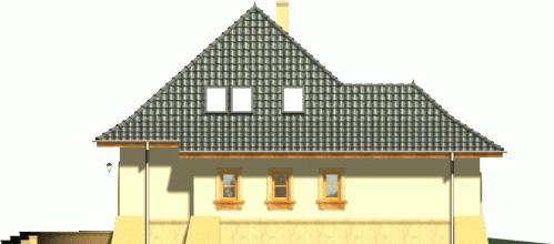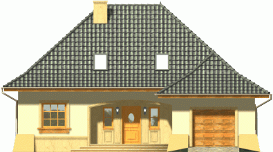 Tradycyjny dom z dachem kopertowym z wysuniętą do przodu bryłą garażu. Wejście zostało podkreślone poprzez łukowo sklepioną wnękę, natomiast od strony ogrodu znalazły się dwa zestawy potrójnych okien balkonowych wprowadzające światło do wnętrza budynku. Prosta forma dachu dodaje całości ponadczasowej elegancji.