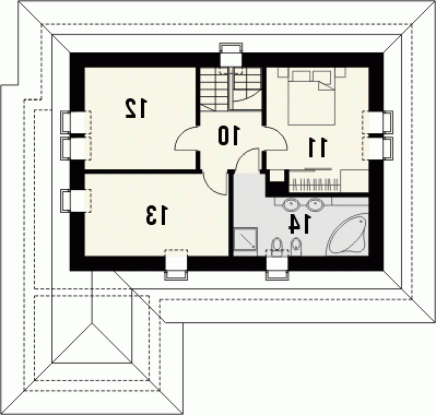 Budynek niepodpiwniczony piętrowy dwumieszkaniowy z garażem. Z wiatrołapu dostępne dodatkowe mieszkanie składające się z pokoju z aneksem kuchennym i łazienki. Większy lokal podzielono na strefę dzienną na parterze (salon z kuchnią i wc) oraz nocną na piętrze pod dachem stromym: trzy sypialnie i przestronna łazienka.