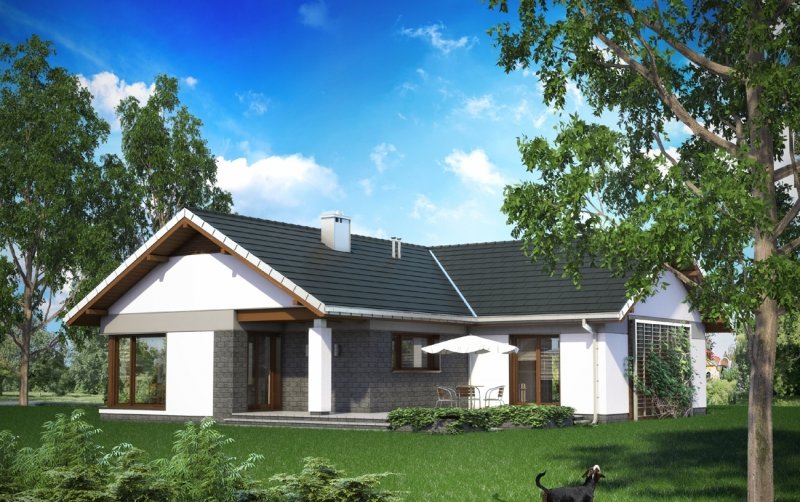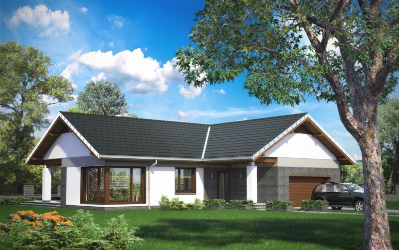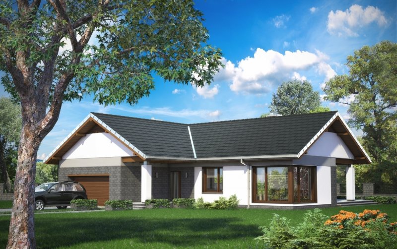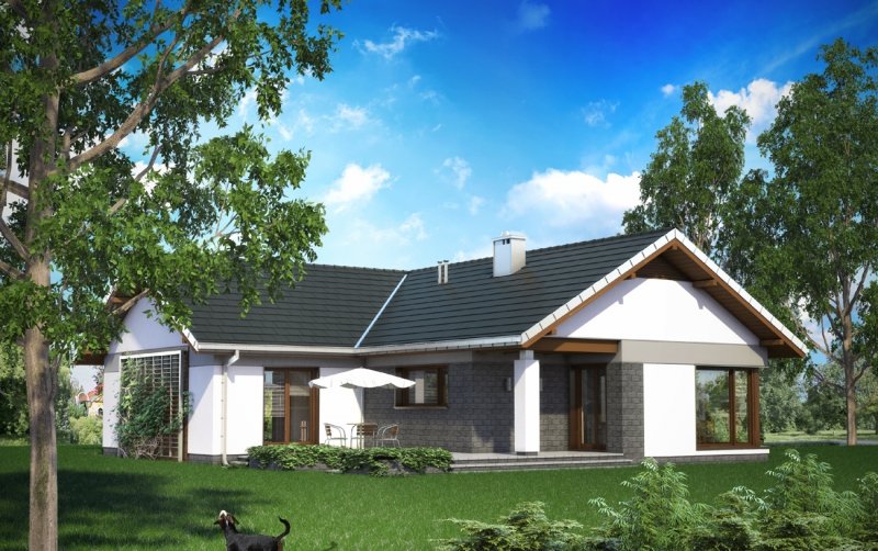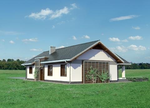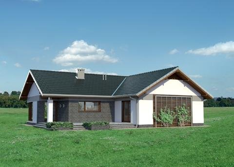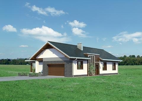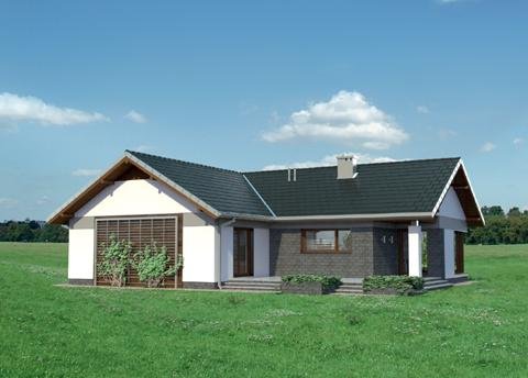 Lukas to parterowy dom z dwustanowiskowym garażem, zaprojektowany na rzucie litery T. Jego bryła jest niska i przekryta łagodnymi dwuspadowymi, przenikającymi się dachami. Skrzydła domu mieszczą zróżnicowane funkcjonalnie strefy. Ku frontowi wysuwa się garaż z kotłownią, akcentując wnękę wejściową. Główne skrzydło, na wprost wjazdu na posesję, zajmuje jednoprzestrzenna część dzienna z kominkiem. Ulokowany między salonem z jadalnią a kuchnią, aranżuje i organizuje przestrzeń życia rodzinnego. Na tyłach działki znajduje się część prywatna z trzema dużymi sypialniami i łazienką. Jest ona dostępna z centralnie położonego holu, do którego przylega także łazienka gościnna i pralnia. Projekt domu Lukas proponuje taras ogrodowy, ujęty w formie atrium prostopadłymi ścianami kuchni i jednej z sypialni, otwartej dzięki temu na ogród. Imponujące, narożne przeszklenie salonu potęguje efekt przenikania się wnętrza i zieleni. W połączeniu z rozłożystą sylwetką i bezpretensjonalną architekturą projekt domu Lukas zyskuje niezwykłą przewagę w lokalizacjach, w których pożądane jest neutralne wpisanie się budynku w otoczenie.