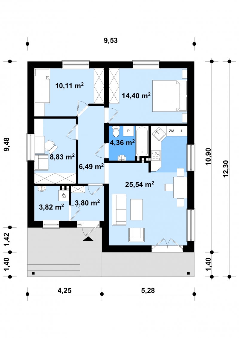 Projekt budynku mieszkalnego, jednorodzinnego, parterowego, niepodpiwniczonego. Do projektu dołączone jest zestawienie: stali, więźby dachowej oraz stolarki drzwiowej i okiennej, jak równieżbezpłatna zgoda na dokonanie zmian.