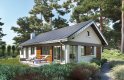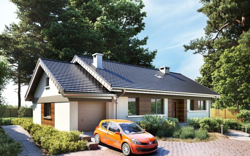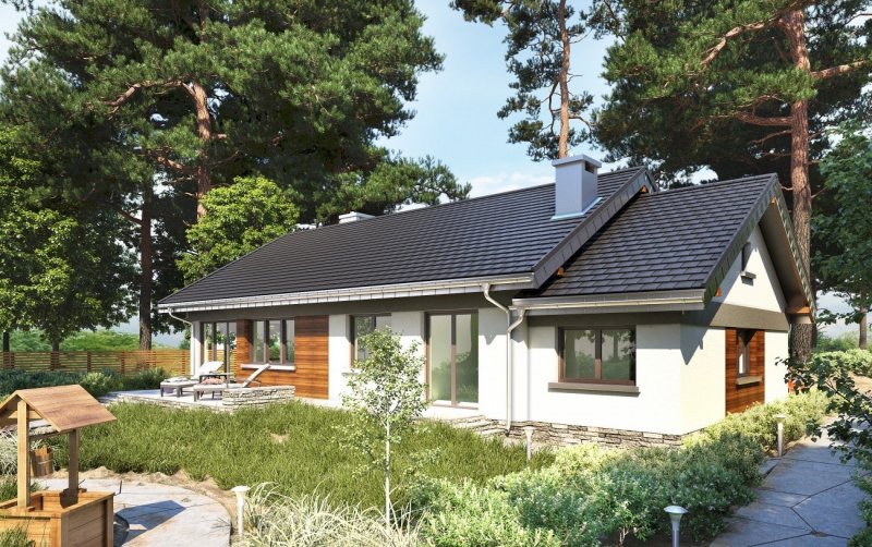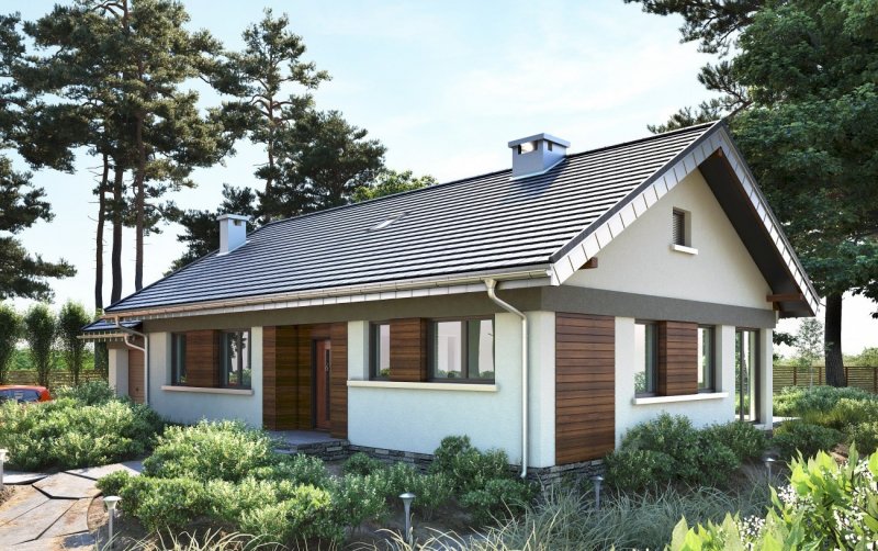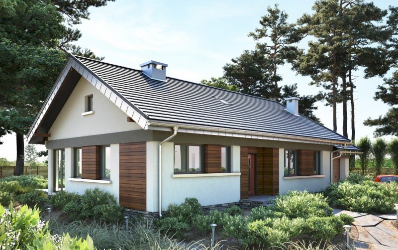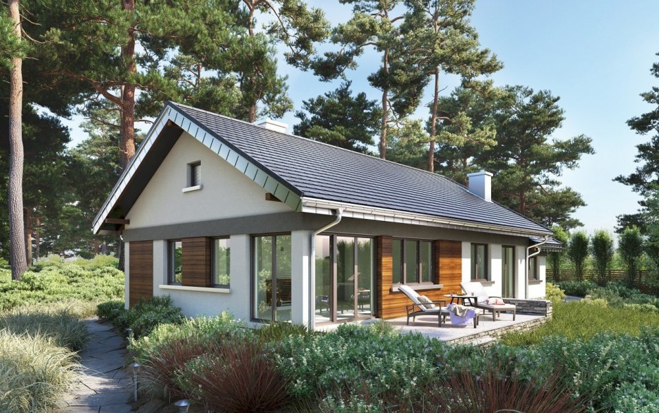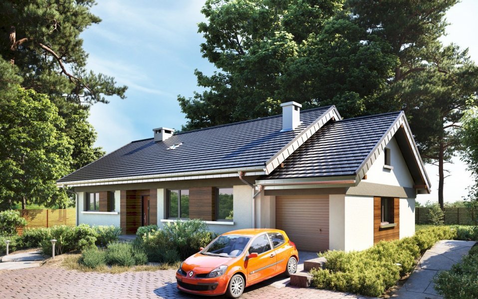 Nawet mały dom parterowy, zaprojektowany energooszczędnie na planie zwartego prostokąta z dobudowanym garażem, nie uniknie wydłużonych proporcji. Projekt domu Milan jest zbliżony układem i wielkością do Lilaka czy Bytomira, ale proponuje inny sposób kształtowania takiej formy z dwuspadowym dachem. Część mieszkalną urozmaica wejściowa wnęka, a garaż z kotłownią mają zwężony trakt i chowają się za główną bryłę dzięki cofniętym elewacjom i niższej kalenicy. Plan mieszkania dzieli wzdłuż na połowy ściana nośna. Trzy sypialnie z dwoma łazienkami to standardowe rozwiązanie w tej wielkości domach, ale projekt domu Milan zwraca uwagę wyjątkowo przestronnym pokojem dziennym. Otwarty salon z kominkiem połączony jest z bardzo dużą kuchnią, która, przez przechodnią spiżarnię, dostępna jest też z sieni. Wygodna strefa wejściowa zmienia się z holu w przedpokój części prywatnej, zamknięty na końcu pralnią i przejściem do garażu. Rysunek drzwi i okien Milana jest swobodny i dostosowany do optymalnego doświetlenia pomieszczeń. Dla uporządkowania kompozycji elewacji zaproponowano w wizualizacji pasy drewnianej boazerii zewnętrznej.