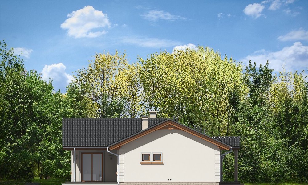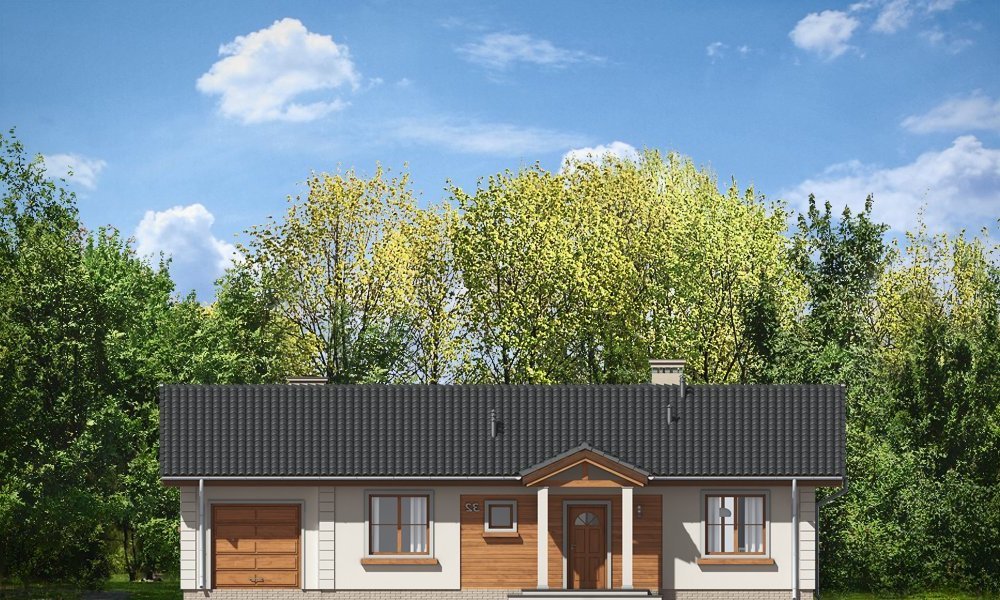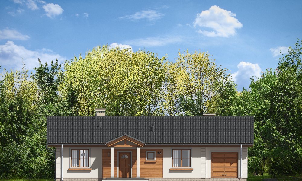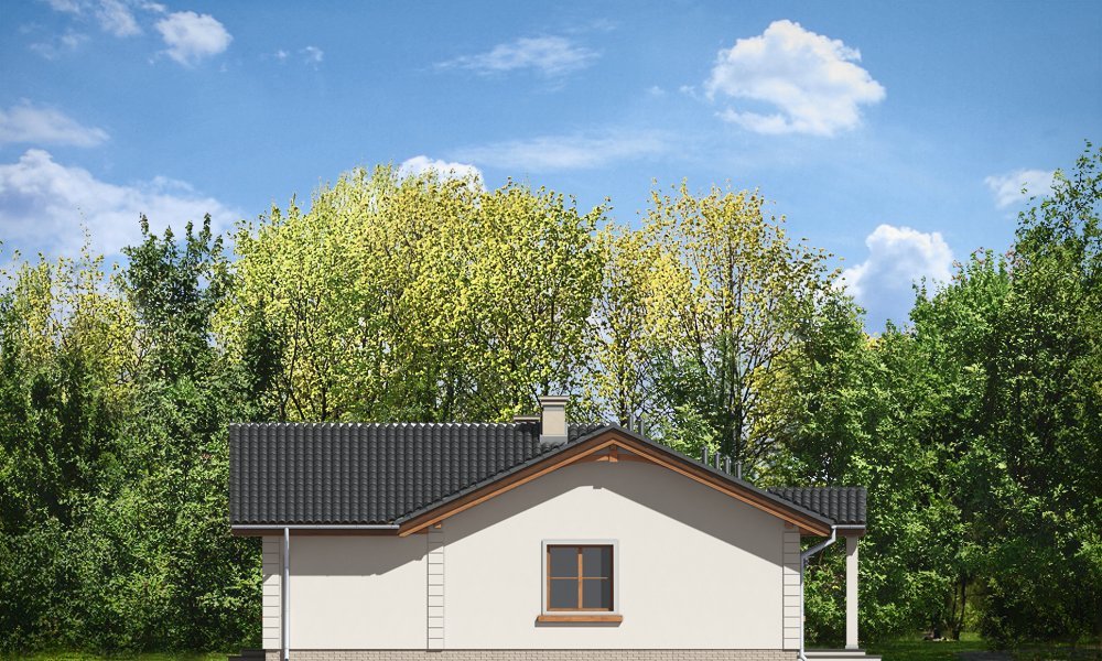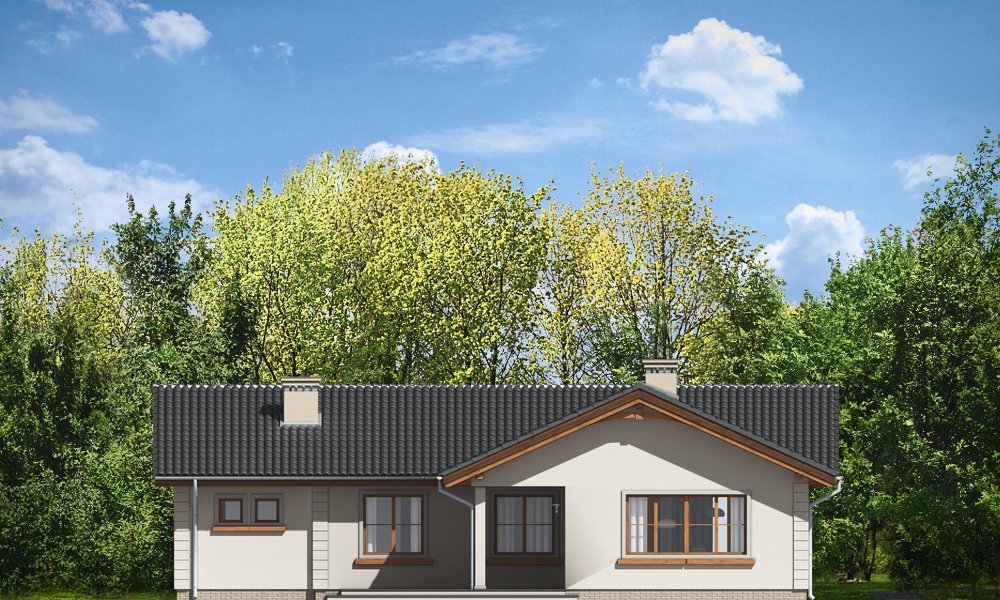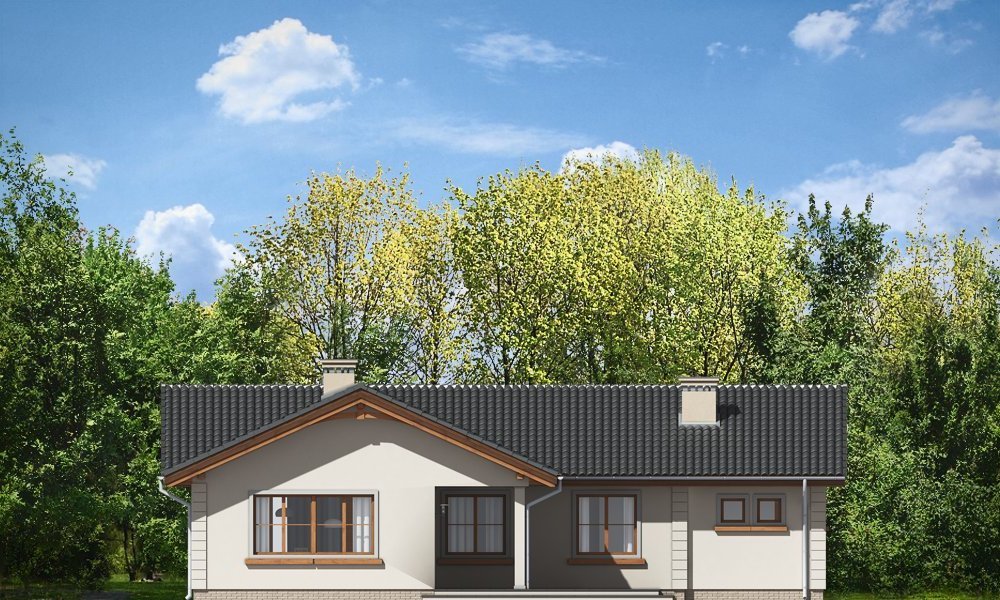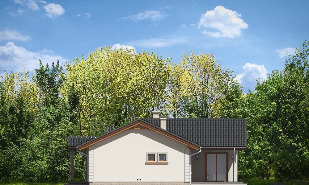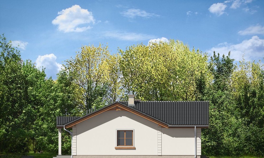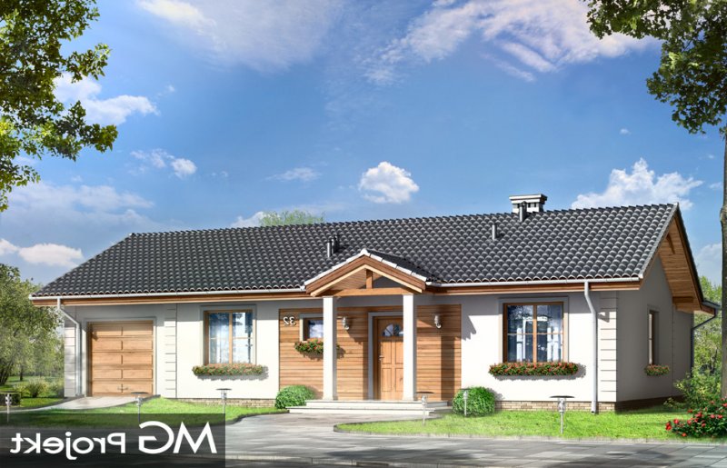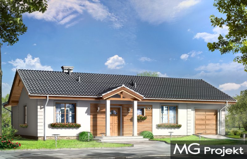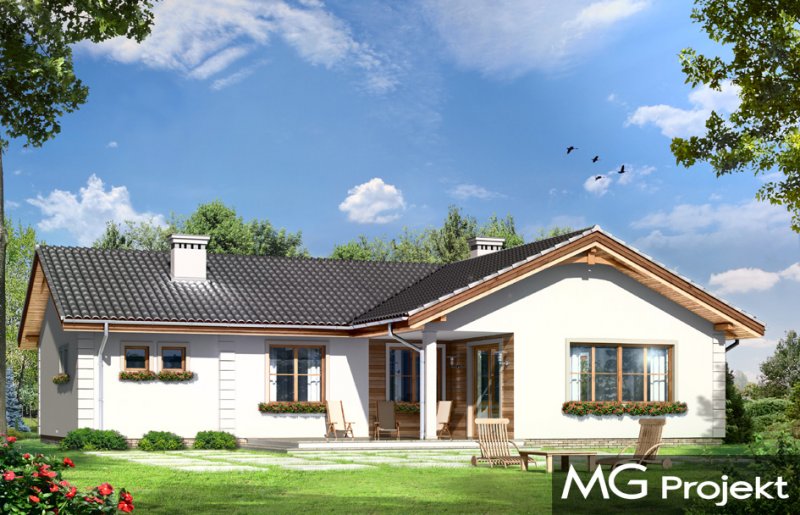 Miluś to powiększona wersja wariantowa projektu Promyk. Dom zaprojektowano jako parterowy, przekryty dwuspadowymi łagodnymi dachami, z dobudowanym garażem. Wystający poza obrys domu salon tworząc od strony ogrodu plan litery "L", dający poczucie intymności i izolacji tarasu od sąsiadów. Architektonicznie Miluś to typowy bungalow z łagodnym dachem, szerokimi elewacjami - frontową i ogrodową, oraz dużymi oknami. Dodatki urozmaicające bryłę domku, jak: fragmenty ścian obłożone drewnem, ganek wejściowy na kolumnach, czy podcień ogrodowy, stanowiący zadaszenie nad częścią tarasu, współtworzą udaną i harmonijną całość. Wnętrze domu podzielono na jednoprzestrzenną część dzienną, oraz na część z sypialniami. Salon, z centralnie usytuowanym ozdobnym kominkiem, oraz dużą ścianą "telewizyjną", łączy się z półotwartą kuchnią i holem. Zaprojektowano również trzy sypialnie z łazienką, oraz dodatkowy pokój, mogący służyć jako gabinet, lub np. sypialnia gościnna. Przy dobudowanym garażu zaplanowano pomieszczenie gospodarcze - kotłownię. Na niewielkiej przestrzeni udało się zaprojektować pięciopokojowe mieszkanie, z zapleczem technicznym i garażem. Pracownia dysponuje także projektem w odbiciu lustrzanym.