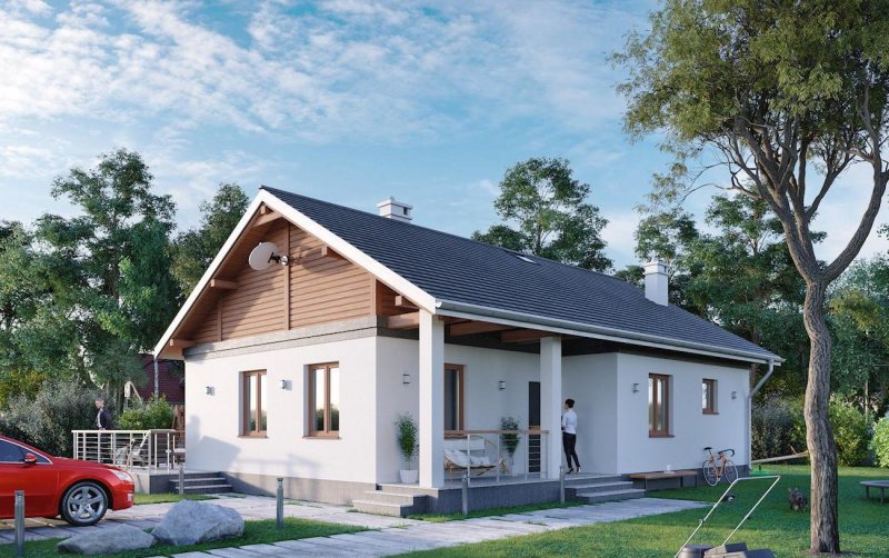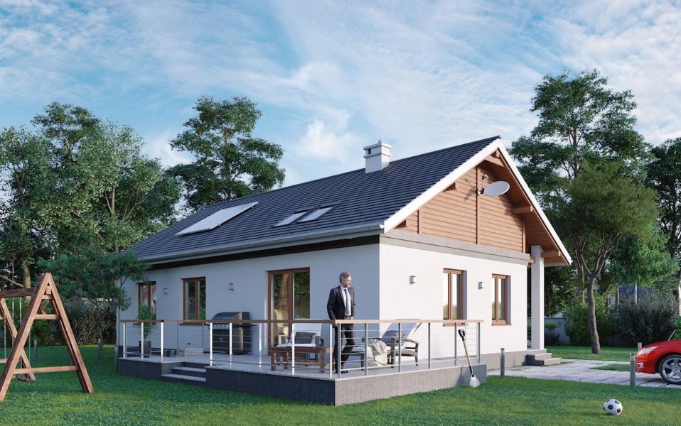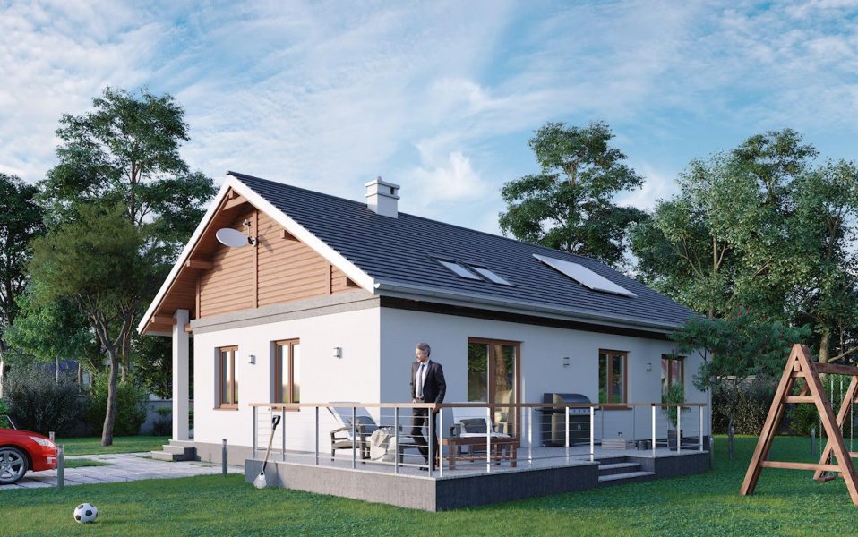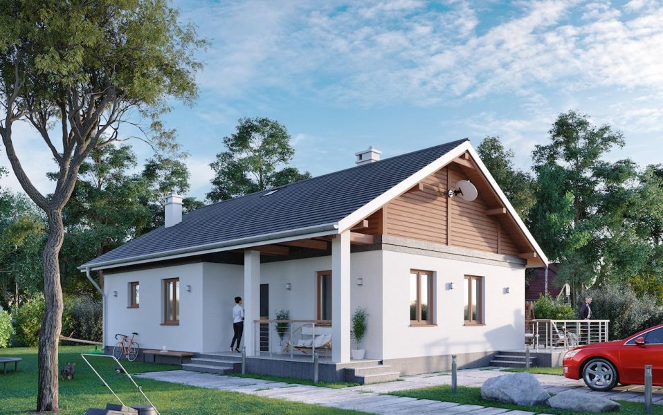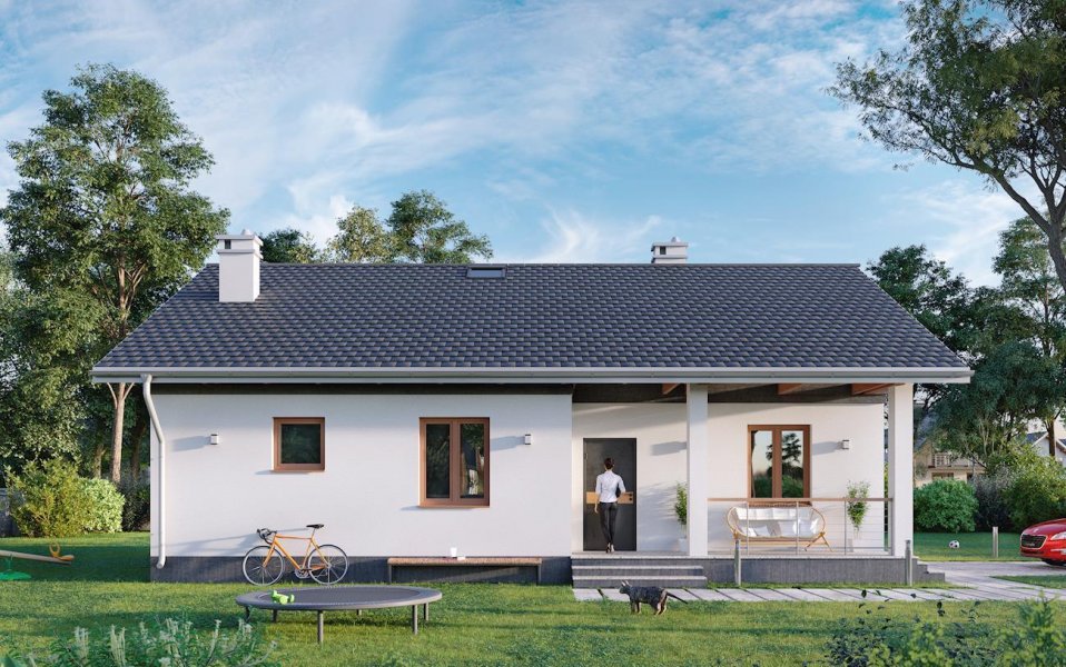 Rodzina Modrzyka to grupa małych i średnich parterowych domów bez garażu o przyjaznej naturalnemu krajobrazowi, niskiej, tradycyjnej bryle. Wśród podobnych propozycji z dwuspadowym dachem i prostokątnym rzutem wszystkie warianty Modrzyka wyróżnia wejściowa, podłużna, narożna weranda w podcieniu. Projekt domu Modrzyk Bis ma średnią wielkość w rodzinie i oferuje wygodne mieszkanie dla czterech osób. Składa się na nie otwarty na hol pokój dzienny z kuchnią oraz strefa prywatna. Jest to najmniejszy wariant rodziny, w którym zmieściła się trzecia sypialnia ale też najmniej miejsca pozostało na kotłownię. Tak jak we wszystkich wersjach, zaproponowano oryginalne, uzupełniające górne doświetlenie podwyższonego salonu oknami dachowymi, umieszczonymi nad balkonowymi drzwiami tarasu ogrodowego. Prosta architektura daje swobodę wykończenia elewacji i nadania budynkowi zharmonizowanej z warunkami otoczenia stylistyki. W projekcie domu Modrzyk Bis uwagę zwracają rozwiązania materiałowe, pozwalające uzyskać bardzo korzystną wartość wskaźnika Ep.