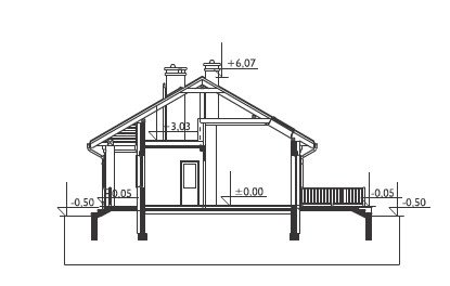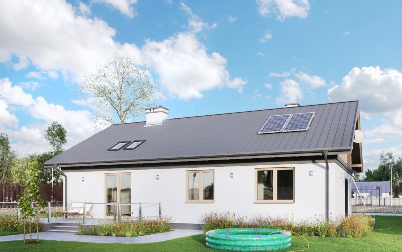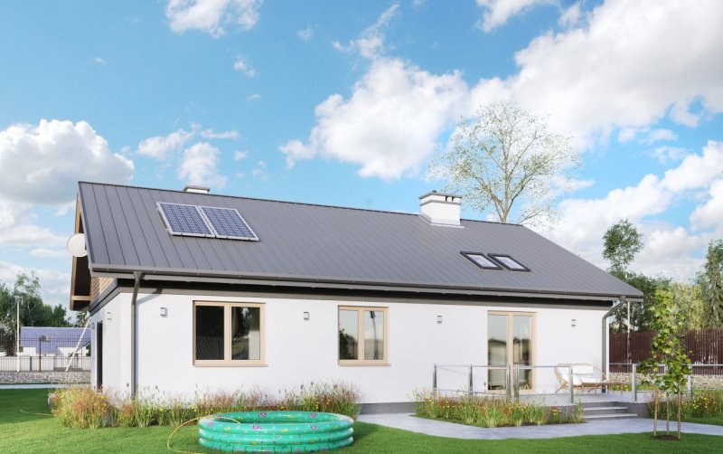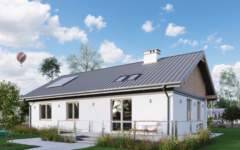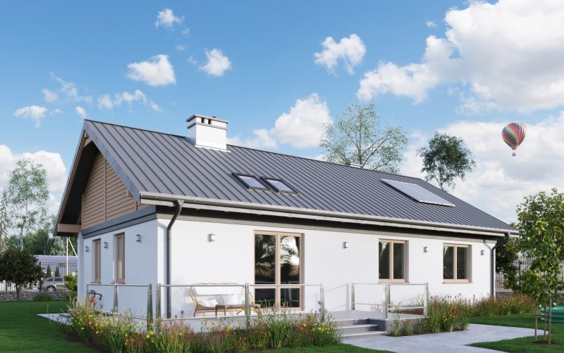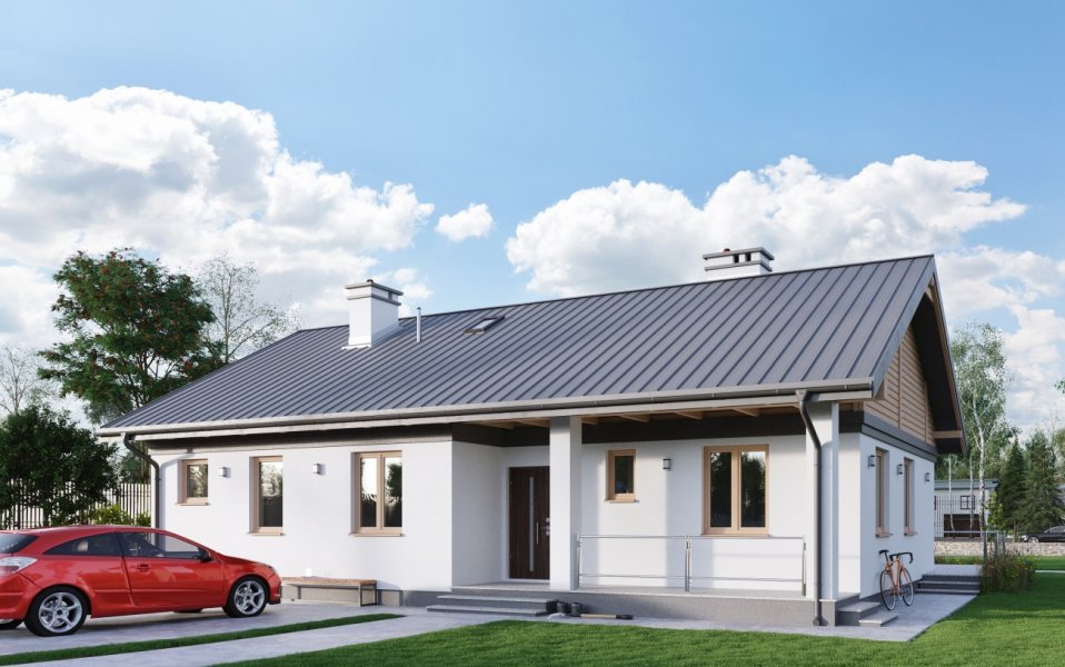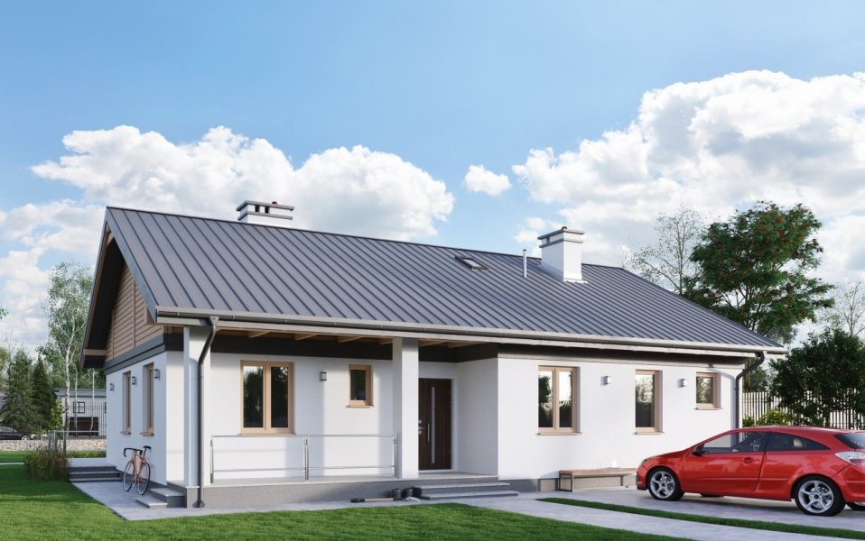 Rodzina Modrzyka grupuje małe i średnie parterowe domy bez garażu o przyjaznej naturalnemu krajobrazowi, niskiej, tradycyjnej bryle. Wśród innych propozycji z dwuspadowym dachem i prostokątnym rzutem wszystkie warianty Modrzyka wyróżnia wejściowa, podłużna weranda w narożnym podcieniu oraz spora powierzchnia dla funkcji gospodarczych. Projekt domu Modrzyk Karbo jest średni w rodzinie i oferuje wygodne mieszkanie dla czterech osób. Składa się na nie otwarty na hol pokój dzienny z kuchnią uzupełnione o wc. W dłuższym o 2,5m od Modrzyka korpusie zmieściły się trzy sypialnie, duża łazienka i największa w rodzinie kotłownia z własnym wejściem. Tak jak we wszystkich wersjach z rodziny, zaproponowano oryginalne uzupełniające, górne doświetlenie podwyższonego salonu oknami połaciowymi. Prosta architektura daje dużą swobodę w wykończenia elewacji i nadania projektowi domu Modrzyk Karbo dowolnej, najlepiej zharmonizowanej z konkretnym otoczeniem stylistyki.
