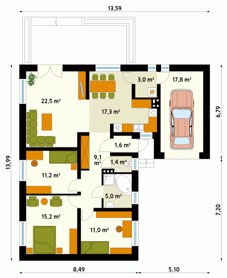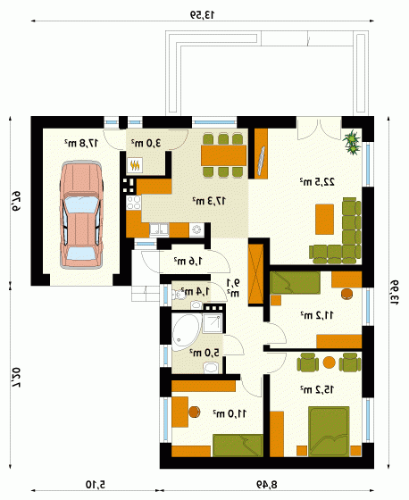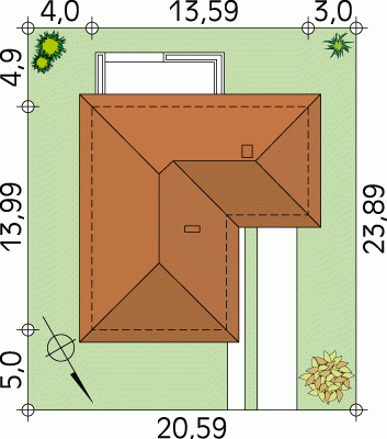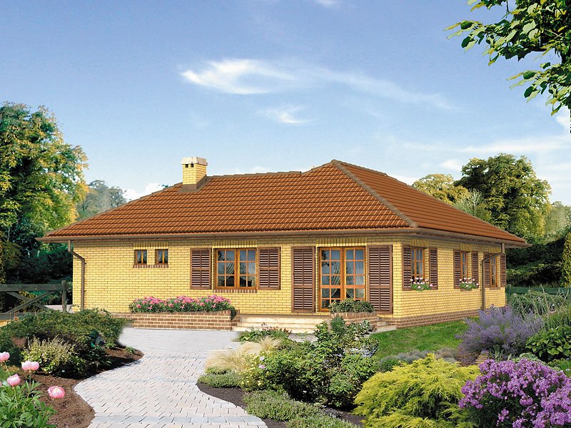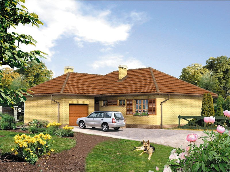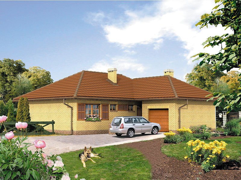 Dom mieszkalny, wolno stojący, parterowy z przybudowanym garażem, niepodpiwniczony. Niewielki budynek o spokojnej i stonowanej bryle oraz prostym i funkcjonalnym wnętrzu. Wygodny dom dla 4-osobowej rodziny.