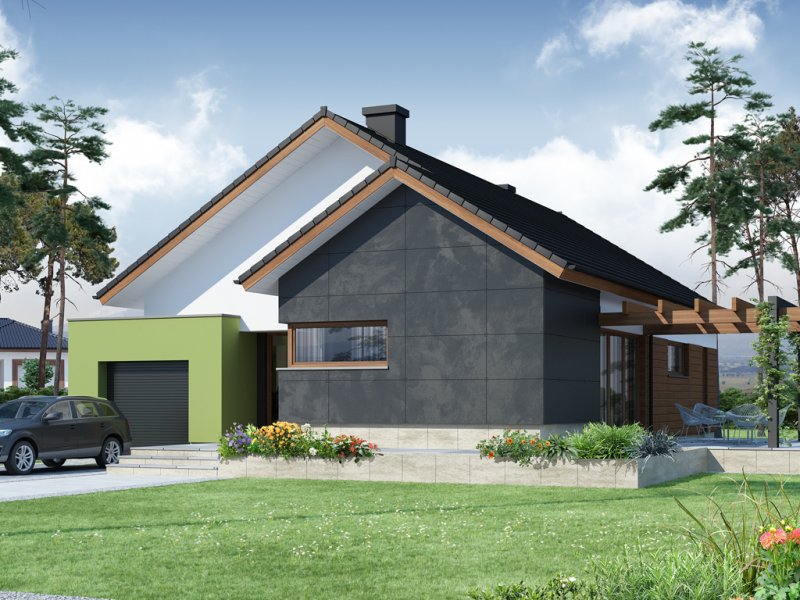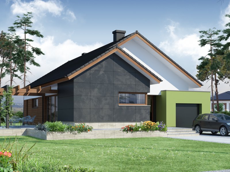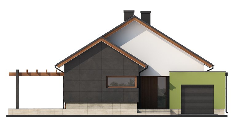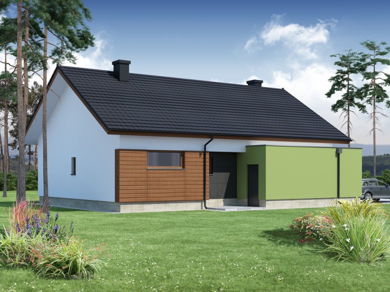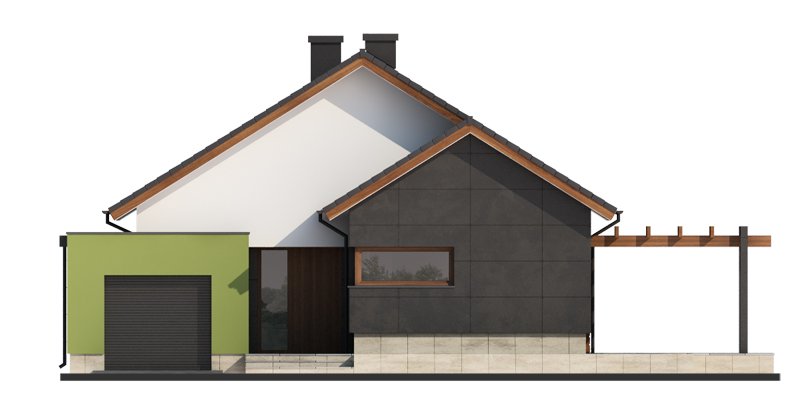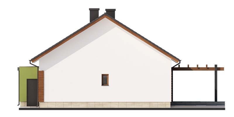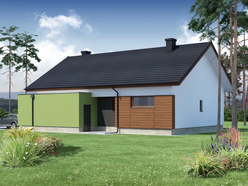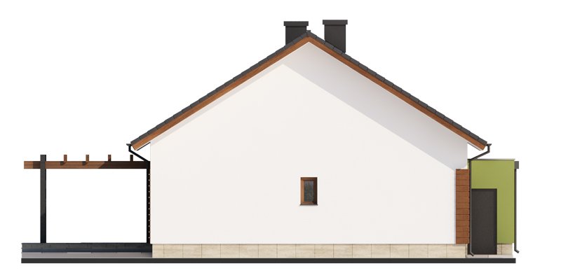 Nestor jest domem, którego nieduża powierzchnia idzie w parze z dobrze rozplanowanym rzutem. Jest idealny dla 4-osobowej rodziny. Mijając zadaszoną strefę wejściową, wkraczamy do wiatrołapu, w którym znajduje się wejście zarówno do garażu jak i do głównej części mieszkalnej budynku. Po prawej stronie hallu znajduje się strefa dzienna – połączone ze sobą kuchnia, jadalnia i salon z kominkiem. Duże przeszklenie idealnie doświetla wnętrze, integruje je z przestrzenią zewnętrzną oraz łączy z tarasem i komfortową pergolą. Pomieszczenie spiżarni może także służyć jako garderoba czy przestrzeń na szafy wnękowe. Strefa nocna budynku jest zaprojektowana w jego drugiej części. W jej skład wchodzą 3 sypialnie, łazienka oraz dodatkowe WC. Istnieje możliwość zaadaptowania nieużytkowego poddasza na cele użytkowe i stworzenia tym samym dodatkowych pokoi. Schody prowadzone by wówczas były w miejscu pomieszczenia WC. Garaż jest dostępny od strony wiatrołapu, jak również, co bardzo praktyczne, od strony ogrodu.