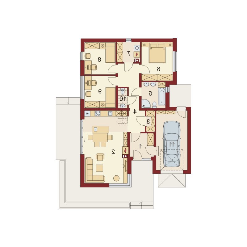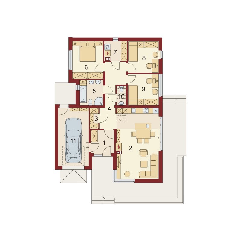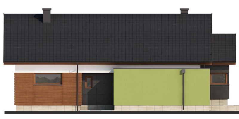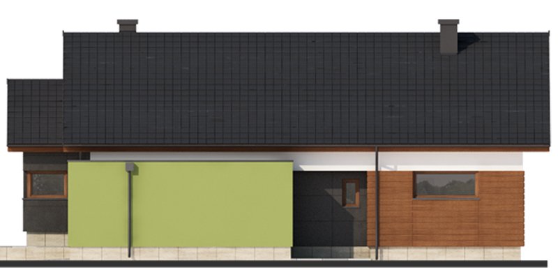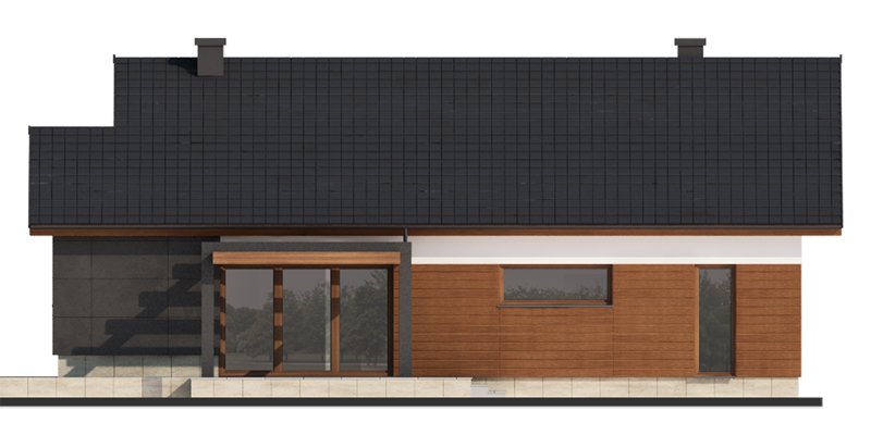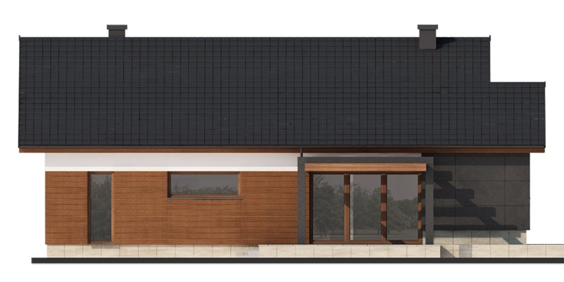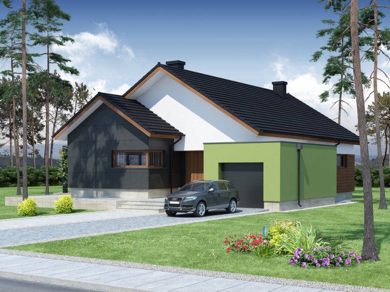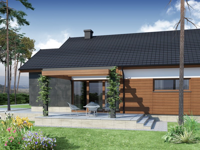 Nestor jest domem, którego nieduża powierzchnia idzie w parze z dobrze rozplanowanym rzutem. Jest idealny dla 4-osobowej rodziny. Mijając zadaszoną strefę wejściową, wkraczamy do wiatrołapu, w którym znajduje się wejście zarówno do garażu jak i do głównej części mieszkalnej budynku. Po prawej stronie hallu znajduje się strefa dzienna – połączone ze sobą kuchnia, jadalnia i salon z kominkiem. Duże przeszklenie idealnie doświetla wnętrze, integruje je z przestrzenią zewnętrzną oraz łączy z tarasem i komfortową pergolą. Pomieszczenie spiżarni może także służyć jako garderoba czy przestrzeń na szafy wnękowe. Strefa nocna budynku jest zaprojektowana w jego drugiej części. W jej skład wchodzą 3 sypialnie, łazienka oraz dodatkowe WC. Istnieje możliwość zaadaptowania nieużytkowego poddasza na cele użytkowe i stworzenia tym samym dodatkowych pokoi. Schody prowadzone by wówczas były w miejscu pomieszczenia WC. Garaż jest dostępny od strony wiatrołapu, jak również, co bardzo praktyczne, od strony ogrodu.