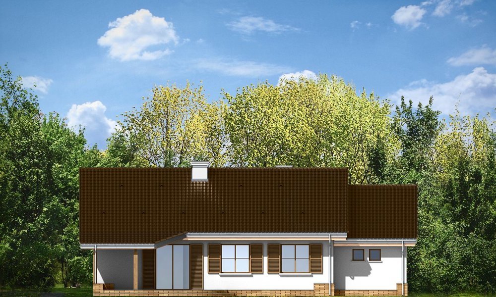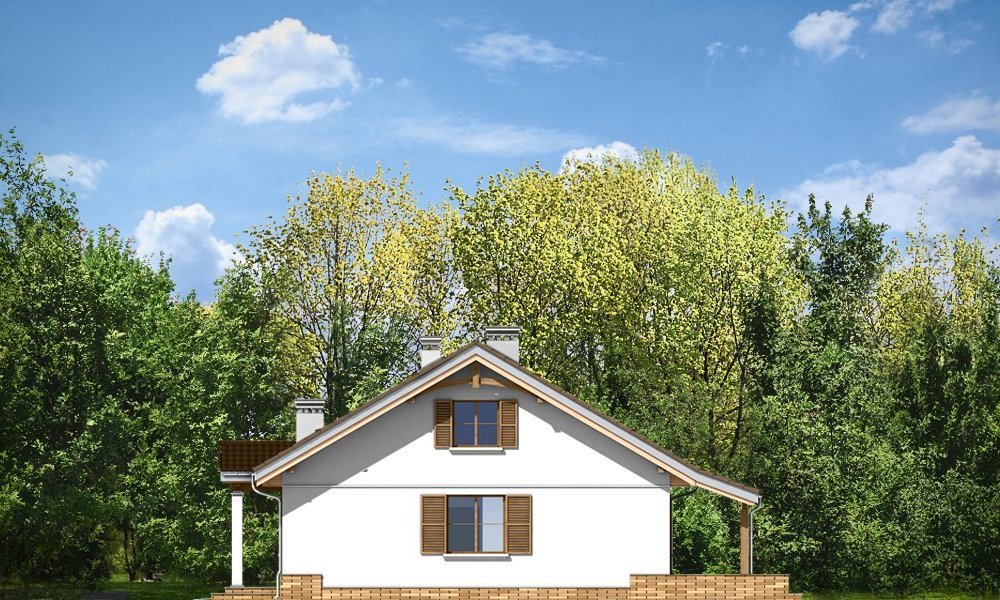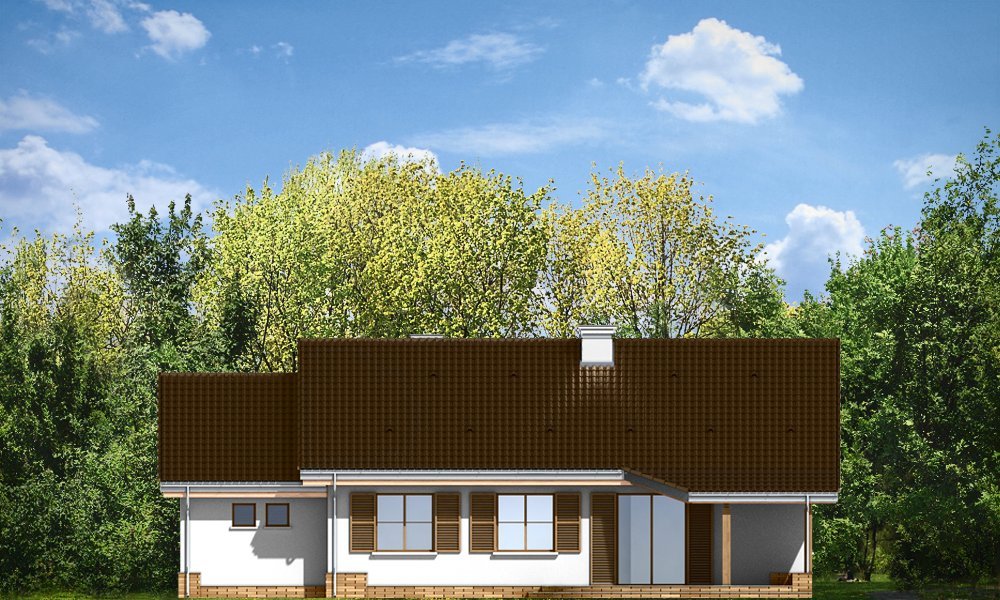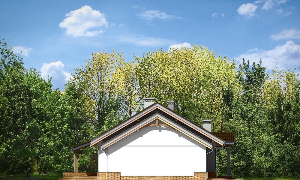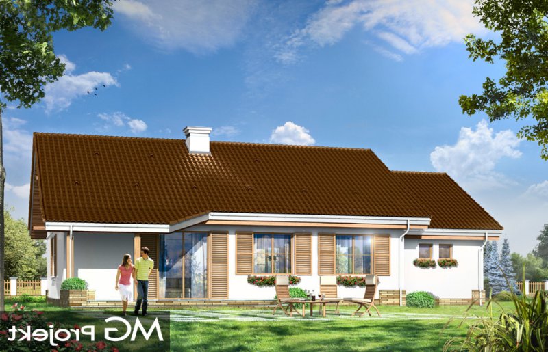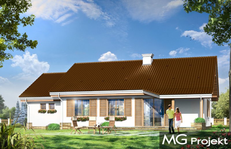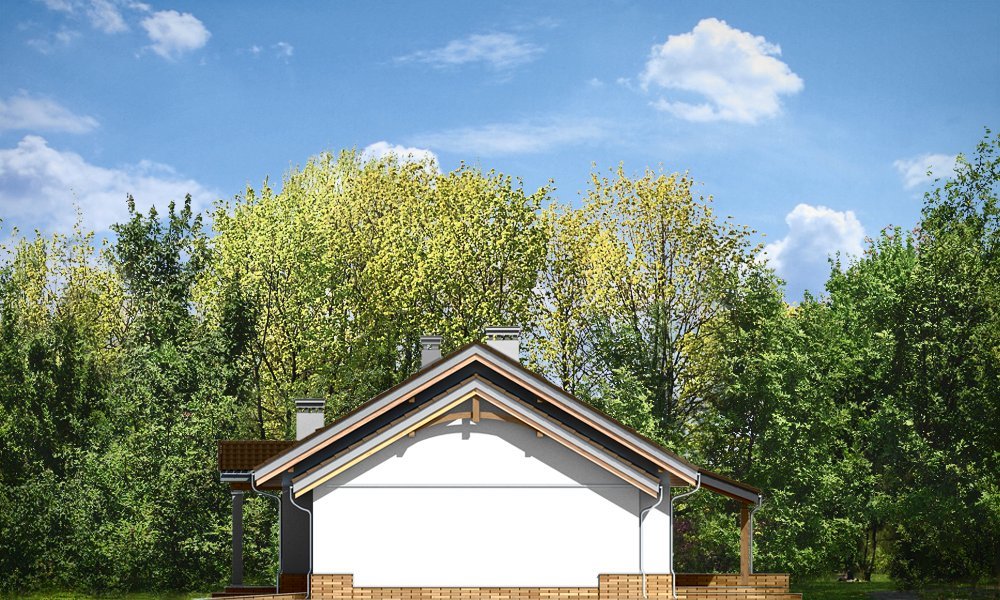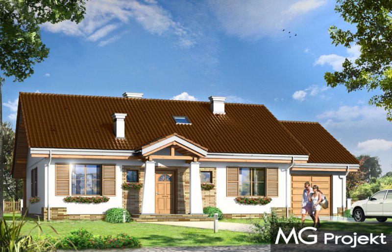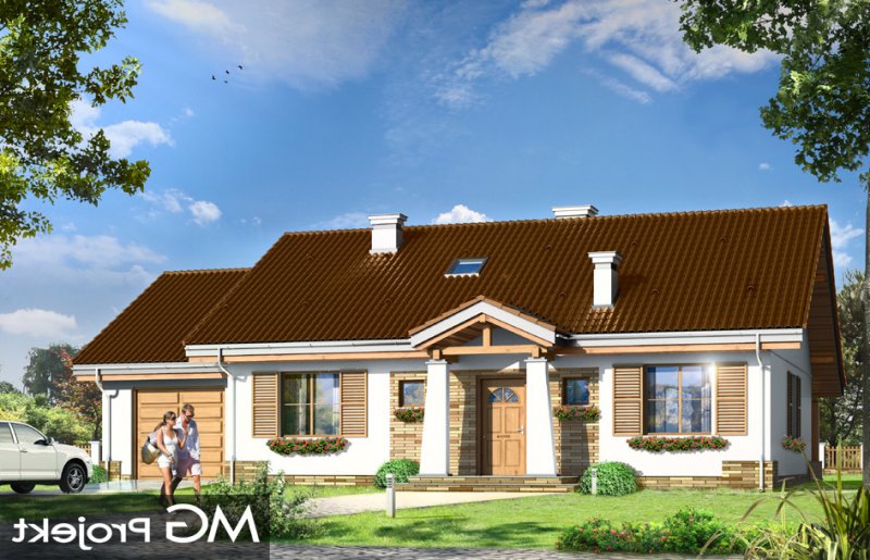 Niezapominajka z garażem jest wariantową wersją projektu domu Niezapominajka. Dom jednorodzinny, parterowy, zaprojektowany został z myślą o czteroosobowej rodzinie. Prostokątna bryła budynku z dobudowanym garażem została przekryta dwuspadowymi dachami. Nieużytkowy strych nad parterem można zaadaptować na poddasze. Architektonicznie dom nawiązuje do typowej tradycyjnej stylistyki. Front domu z zaakcentowanym gankiem wejściowym wspartym na dwóch kolumnach z oknami po bokach, przypomina klasyczny polski dworek. Wnętrze domu podzielono na część dzienną, z salonem, holem i częściowo otwartą kuchnią, oraz część nocną z trzema sypialniami i łazienką. W niewielkiej kotłowni można zainstalować kocioł gazowy, lub można przenieść kotłownię do pomieszczenia za garażem i umieścić tam kocioł na paliwo stałe. Dom stanowi świetną propozycję dla Inwestorów chcących niedrogo wybudować dom, którzy chcą zostawić sobie możliwość wykończenia w drugim etapie dodatkowej przestrzeni na strychu - lub po prostu mieć duży przydatny przecież strych. Projekt dostępny jest także w odbiciu lustrzanym.