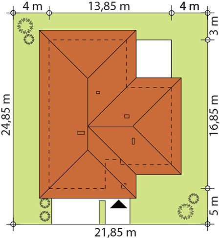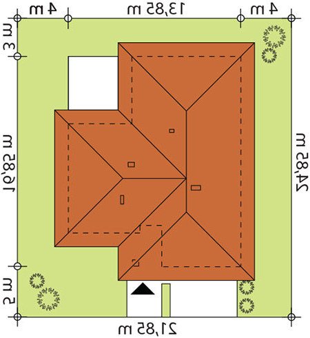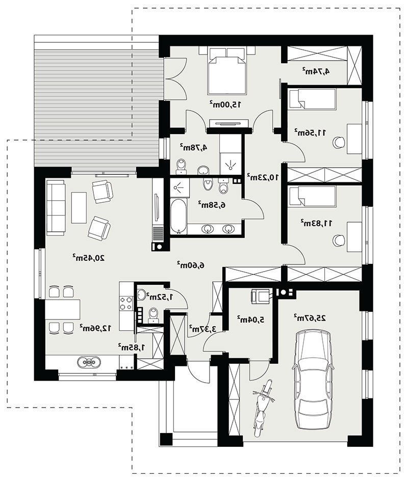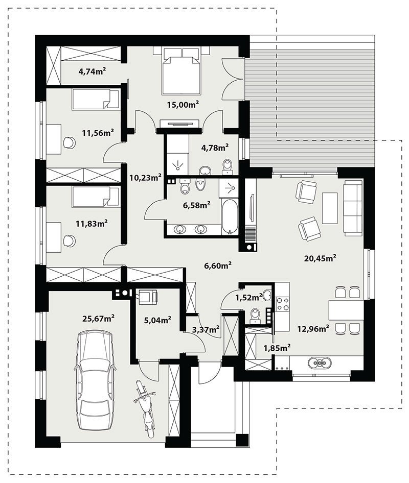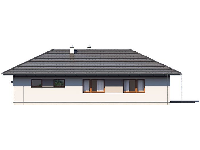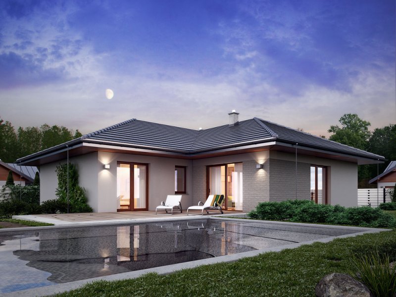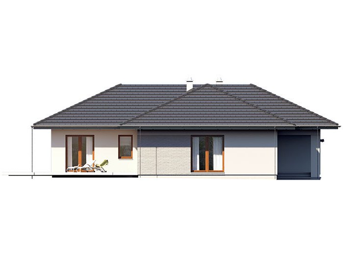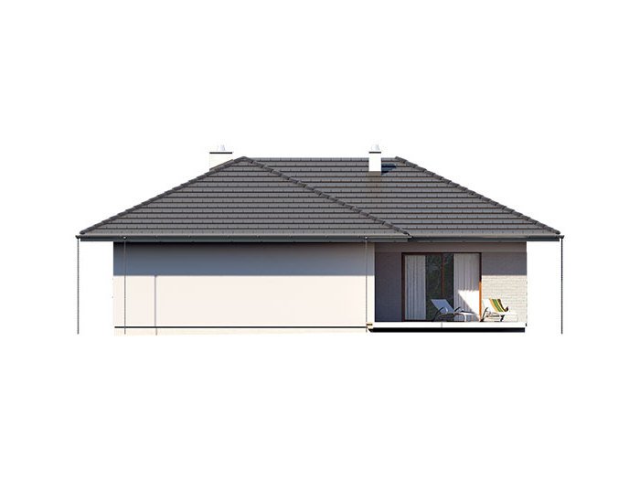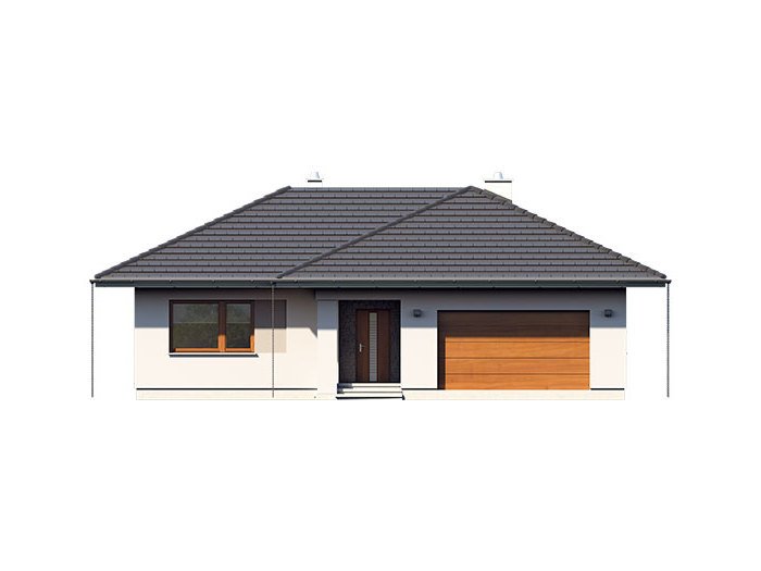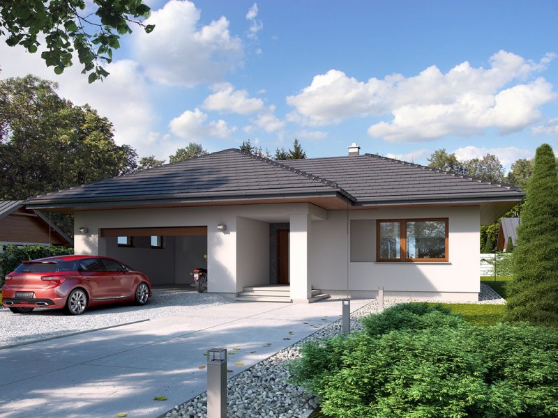 Jednorodzinny budynek mieszkalny, parterowy, z jednostanowiskowym garażem. Funkcjonany układ pomieszczeń zapewnia optymalny komfort 4-osobowej rodzinie. Ergonomicznie zaprojektowana przestrzeń została wyraźnie podzielona na część dzienną, nocną i gospodarczą. Część reprezentacyjna domu, to przestronny salon połączony z jadalnią, który otwiera się na duży, zadaszony taras oraz kuchnia ze spiżarnią. Oprócz części dziennej, przewidziano strefę intymną domu, która składa się z trzech sypialni i łazienki. Przy największej sypialni zaprojektowano osobną garderobą i łazienkę. Dużą kotłownię oraz garaż zlokalizowano w części gospodarczej domu. Wymiary kotłowni umożliwiają montaż kotła na każdy rodzaj paliwa natomiast ciekawie zaprojektowaną wnękę w garażu można wykorzystać jako skład opału bądź pomieszczenie gospodarcze. Geometria rzutu oraz prostota bryły czynią ten dom tanim i prostym w budowie oraz niedrogim w utrzymaniu i eksploatacji.