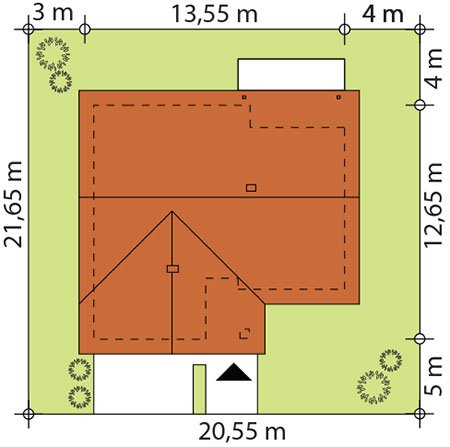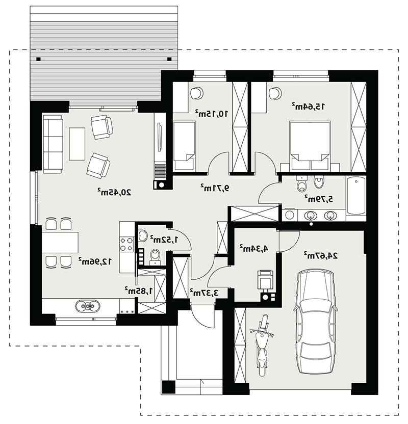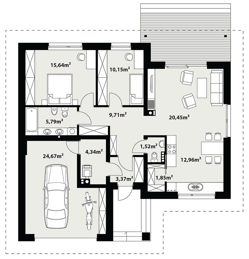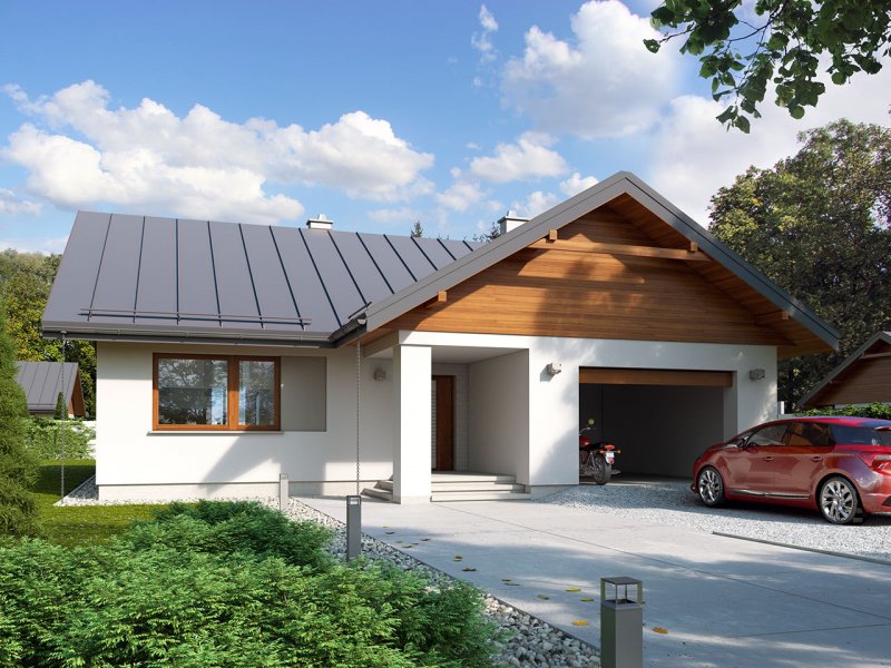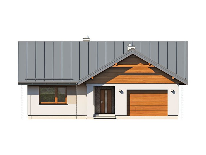 Nieduży jednorodzinny budynek mieszkalny, parterowy, niepodpiwniczony z jednostanowiskowym garażem. Funkcjonany układ pomieszczeń zapewnia optymalny komfort 3-osobowej rodzinie. Ergonomicznie zaprojektowana przestrzeń została wyraźnie podzielona na część dzienną, nocną i gospodarczą. Część reprezentacyjna domu, to przestronny salon połączony z jadalnią, który otwiera się na duży, zadaszony taras oraz kuchnia ze spiżarnią. Oprócz części dziennej, przewidziano strefę intymną domu, która składa się z dwóch sypialni i łazienki. Dużą kotłownię oraz garaż zaprojektowano w części gospodarczej domu. Ciekawie zaprojektowaną wnękę w garażu można wykorzystać jako skład opału bądź pomieszczenie gospodarcze. Geometria rzutu oraz prostota bryły czynią ten dom tanim i prostym w budowie oraz niedrogim w utrzymaniu i eksploatacji.