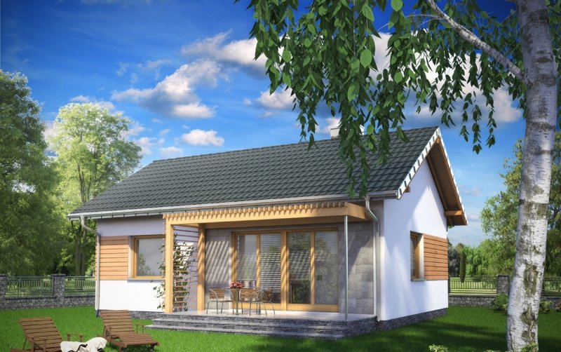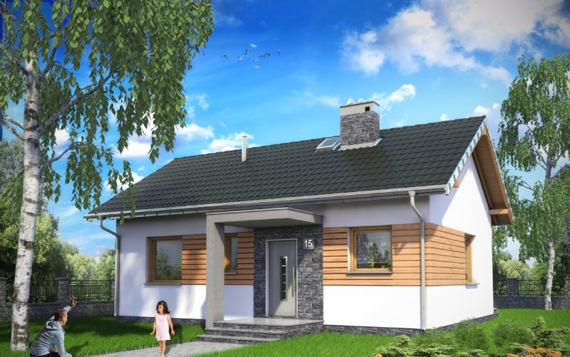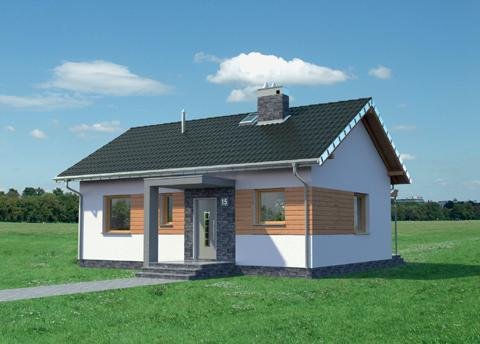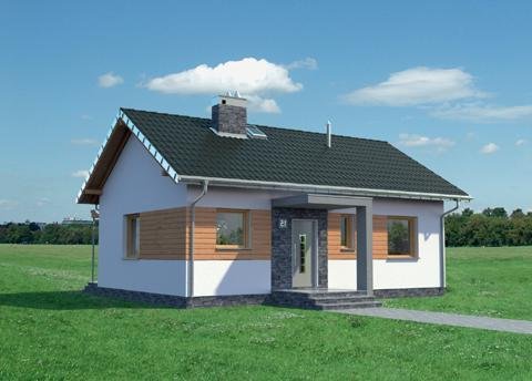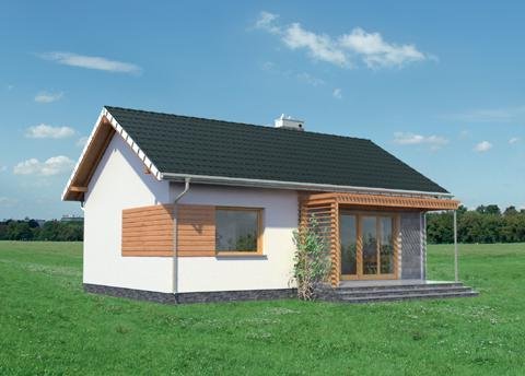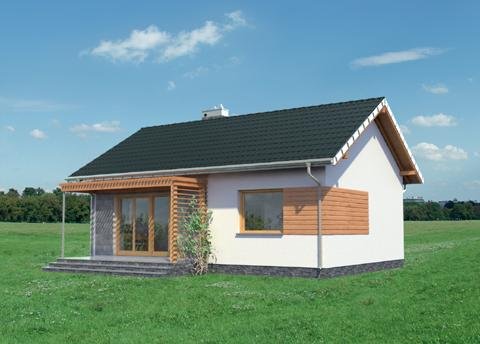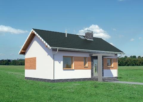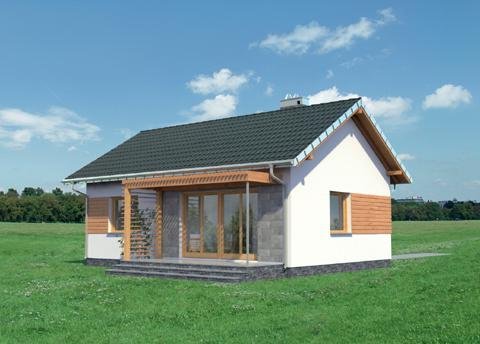 Projekt domu Nugat proponuje mieszkanie o najczęściej wybieranej powierzchni, z tą różnicą, że całkowicie na swoim! Jest tu pokój dzienny z kominkiem, dwie sypialnie z łazienką oraz wygodna sień i hol z głębokimi szafami. Wszystko to zamknięte zostało w niewielkiej, zgrabnej, energooszczędnej bryle. Niedrogie rozwiązanie uzupełnia dwuspadowy dach o stosunkowo dużym, jak na dom parterowy nachyleniu (możliwość wykorzystania powierzchni użytkowej poddasza pod warunkiem wygospodarowania miejsca na oszczędne schody). Prosty budynek powinien zmieścić się na niewielkiej parceli w każdym otoczeniu mimo, że nie brak mu interesujących detali architektonicznych. Wejście akcentuje płaska płyta daszku wspartego na szerokim słupie, a elewacja ogrodowa lśni przeszkleniem salonu, które, wraz z tarasem, osłania lekka pergola. Projekt parterowego domu Nugat stanowi godną rozważenia alternatywę dla mieszkania w budynku wielorodzinnym. Może to być również dom letniskowy lub gościnny w większym zespole zabudowań.
